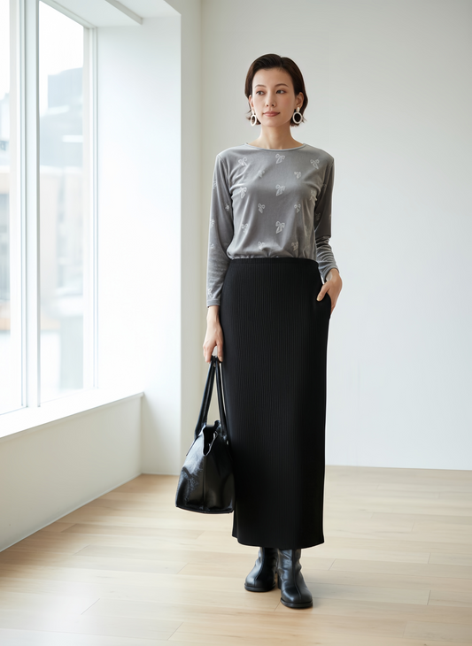 KNR666・ベロアリボン柄立体プリント長袖Tシャツ・エレガントな艶感トロミタッチストレッチ性素材