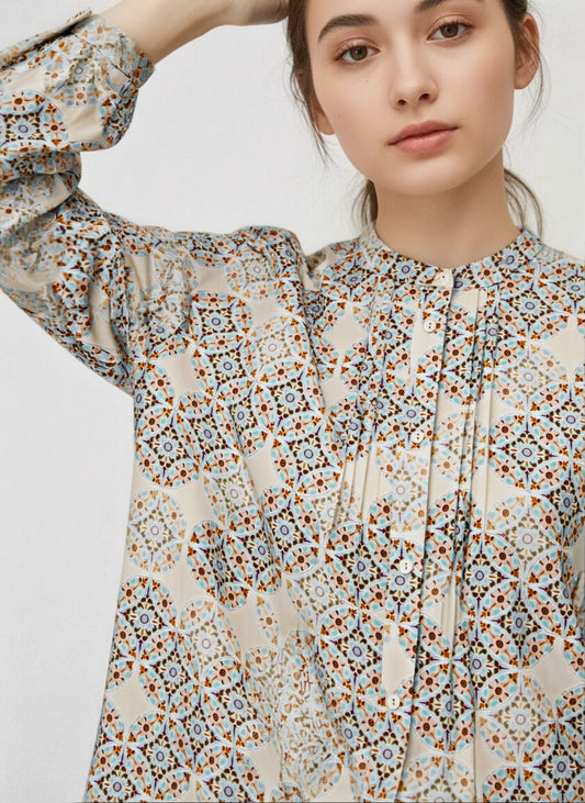 KNR670・綿プリントピンタック長袖シャツ・アンティークモロッカン柄ブラウス