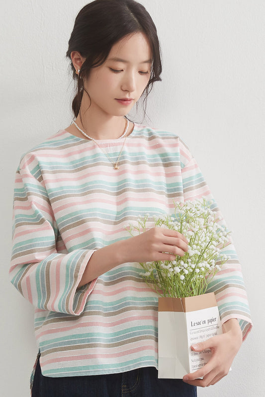 KNGC607・繊細ラメボーダーが光る綿混9分袖ブラウス
