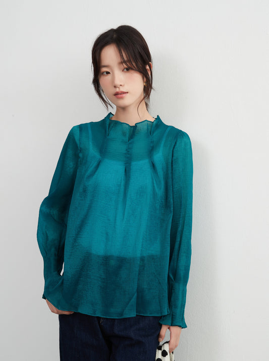 KNXT525・超軽シアー長袖ブラウス・素材の重なりを生かした濃淡の美・タックデザイン・エレガントトップ