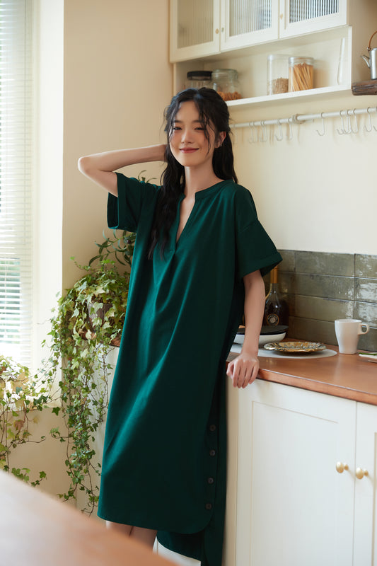 KNSO351-スキッパーカラー半袖ワンピースwith裾スリット