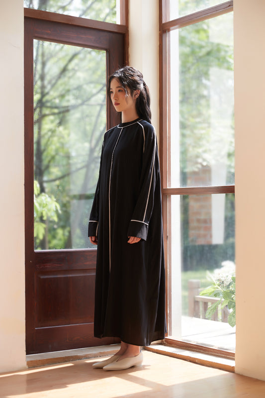KNSO341-BLACK パイピングシャドーストライプ長袖Aラインワンピース