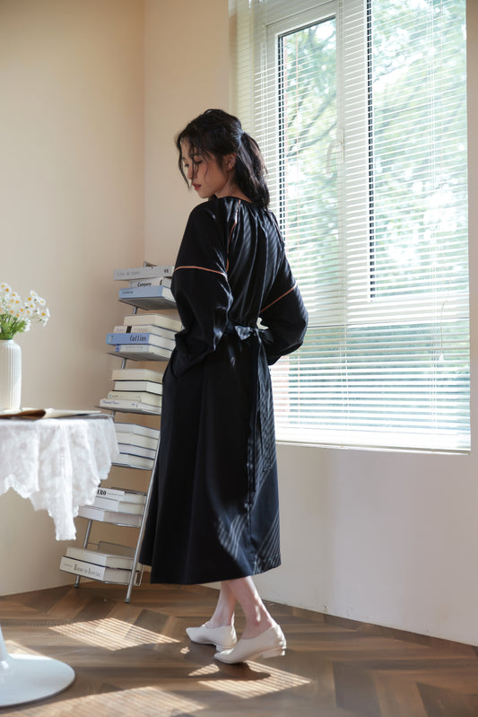 KNSO339-BLACK パイピングディテールベルト付き長袖ギャザーワンピース