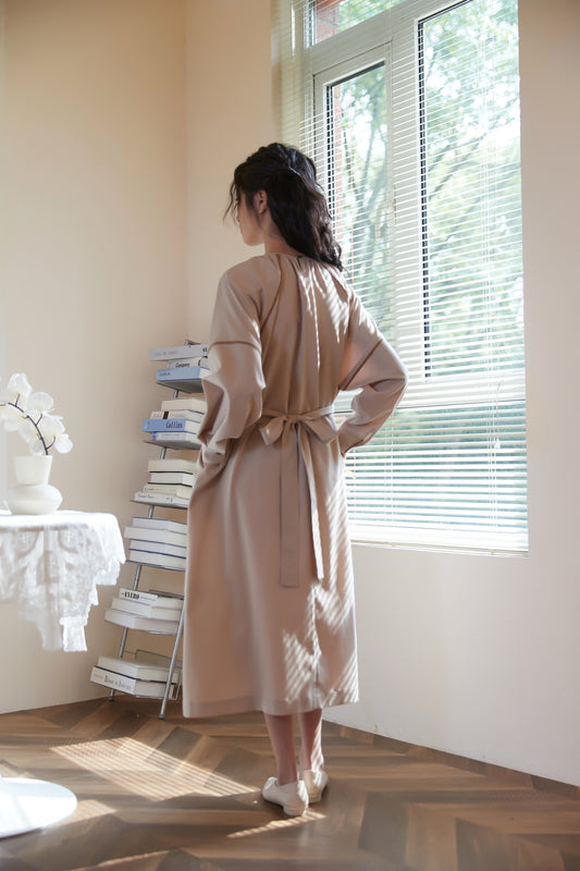 KNSO339-BEIGE パイピングディテールベルト付き長袖ギャザーワンピース