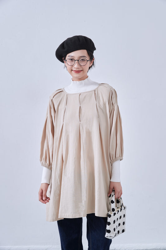 KNNO358・綿100%・チュニック・タックステッチ入り・Aライン・長袖ワンピース