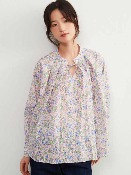 KNXC526・花柄プリント綿100%長袖タックデザインブラウス・ナチュラル系プリントシャツ