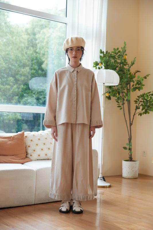 KNSC346-BEIGE ギャザーカフス&プラケットリネン綿シャツセットアップ商品