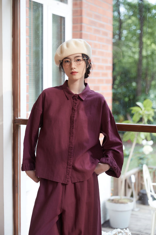 KNSC346-RASPBERRY ギャザーカフス&プラケットリネン綿シャツセットアップ商品