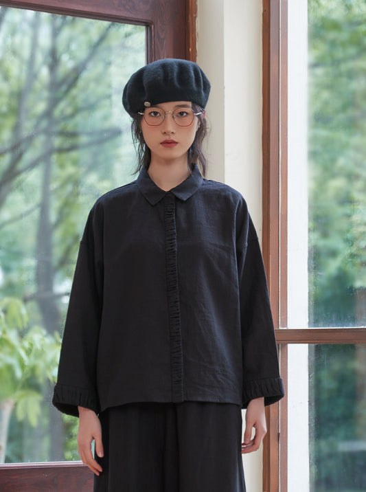 KNSC346-BLACK ギャザーカフス&プラケットリネン綿シャツセットアップ商品
