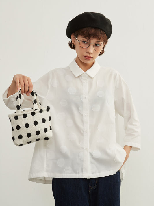 KNXC409-ドット柄ジャガード・7分袖コットンシャツ・ルーズフィットブラウス