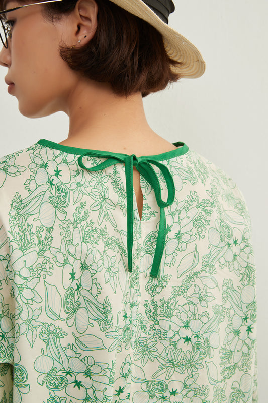 KNXC527・綿100%深緑のプリントギャザー切替ブラウス