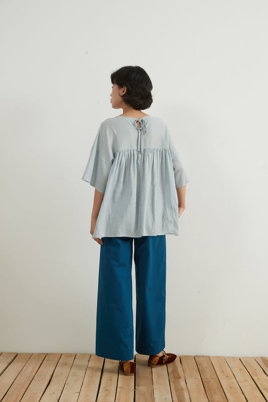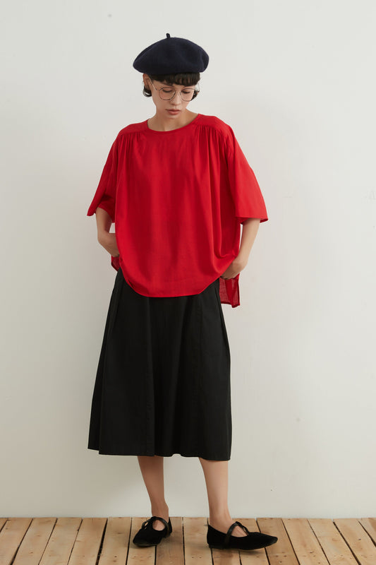KNNT333・リネンコットンギャザー半袖トップ・シェルボタン付きリボン
