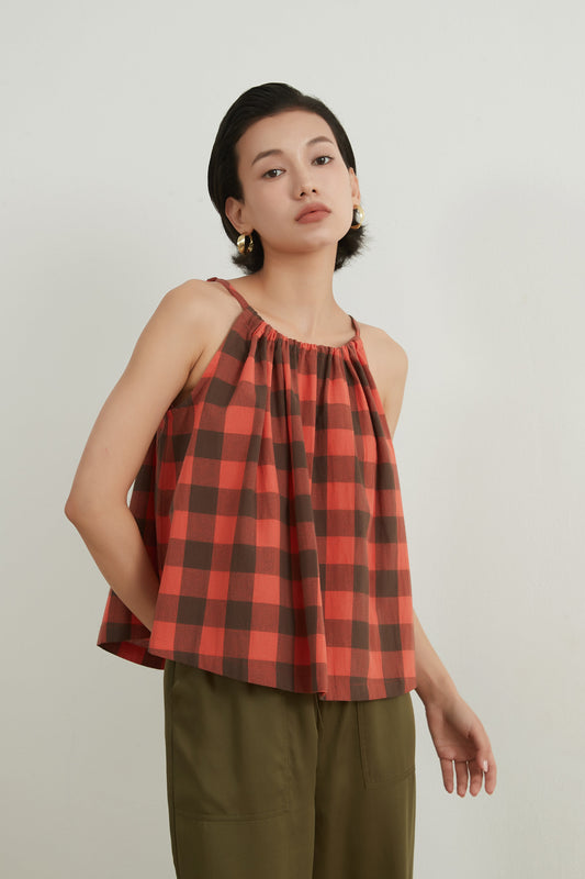 KNNT328・コットン100%チェックキャミソールトップス紐調節可能