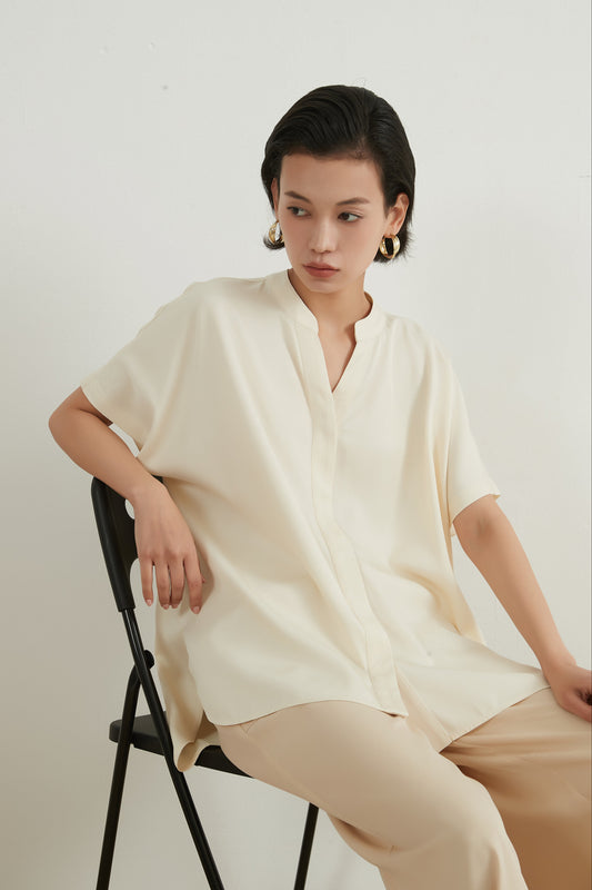 KNNC320・ツヤレーヨン比翼プラケット半袖ブラウスきれいめカジュアル
