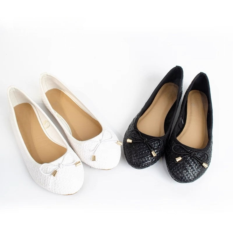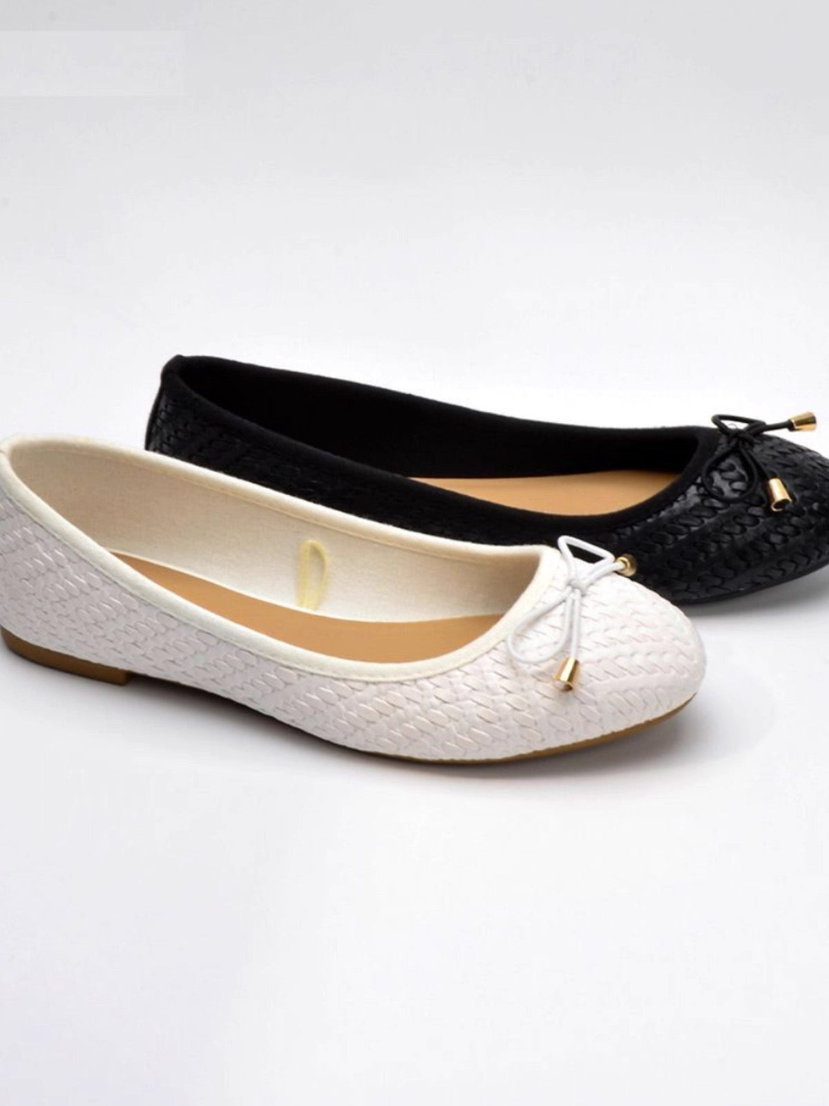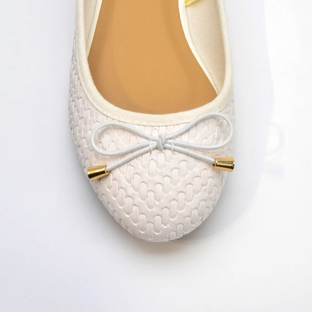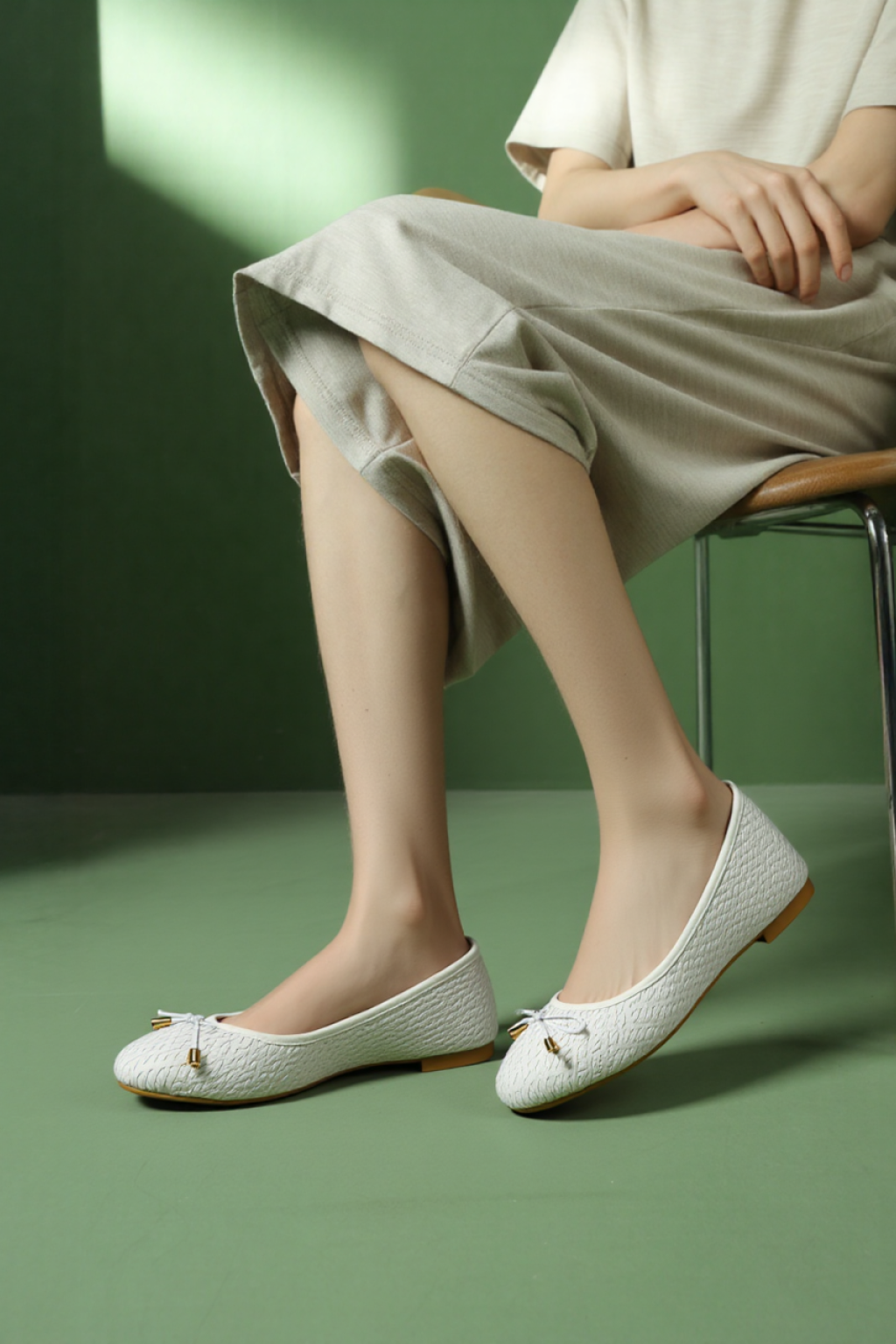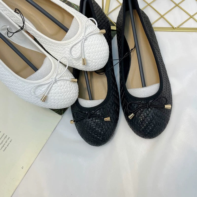 女性らしい丸みのあるフォルムに、可憐なリボンをあしらった網目模様風バレエシューズ。テクスチャーのある素材が上品さを引き立て、シンプルなコーディネートのアクセントとしても活躍します。
