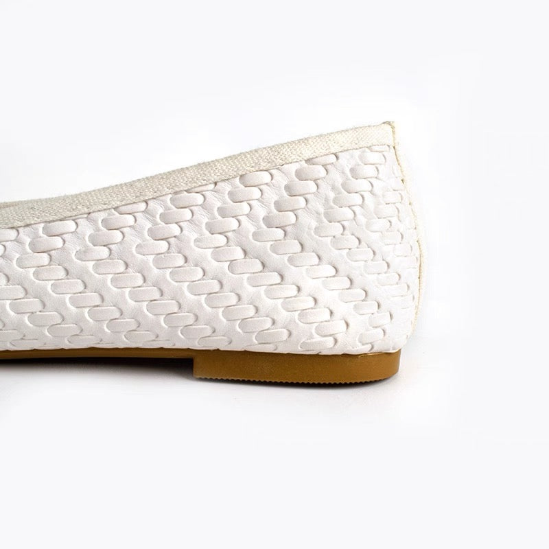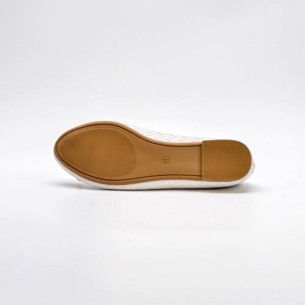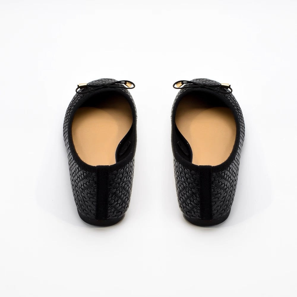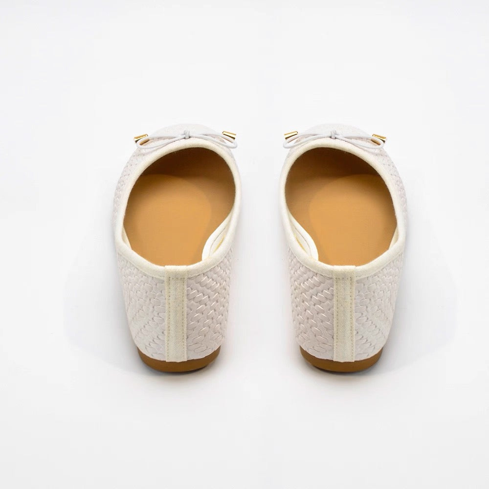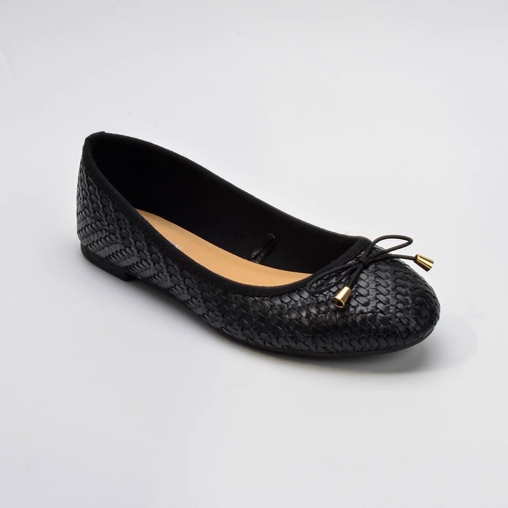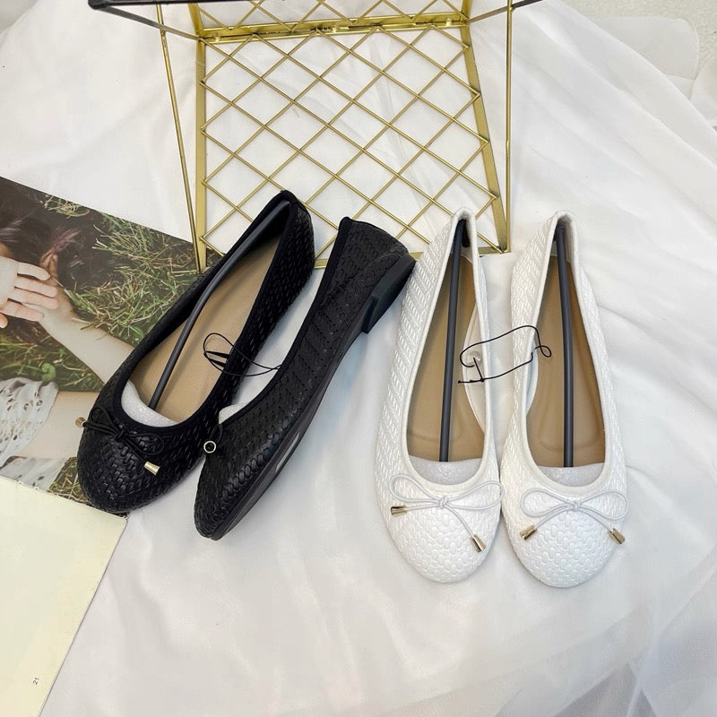 女性らしい丸みのあるフォルムに、可憐なリボンをあしらった網目模様風バレエシューズ。テクスチャーのある素材が上品さを引き立て、シンプルなコーディネートのアクセントとしても活躍します。