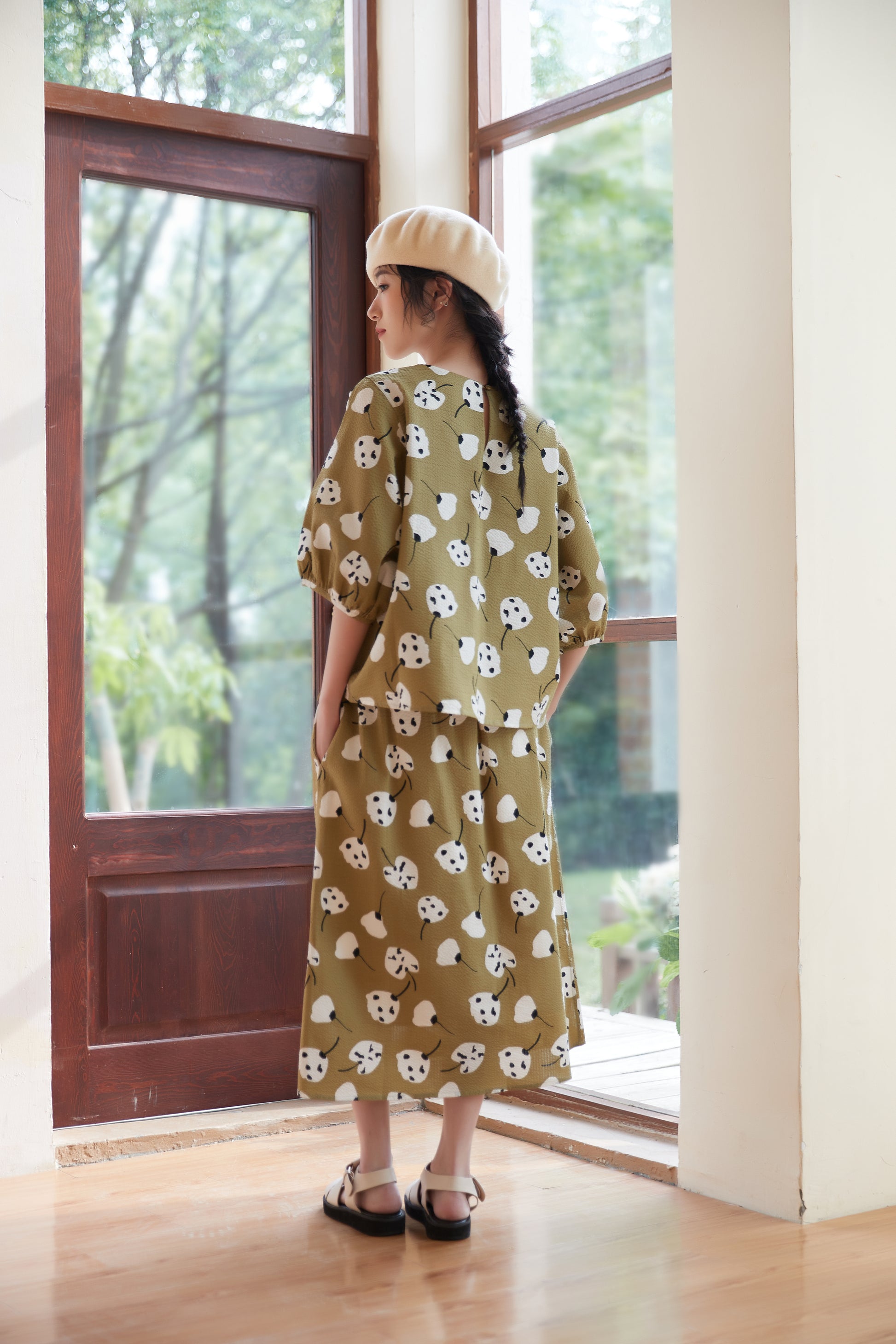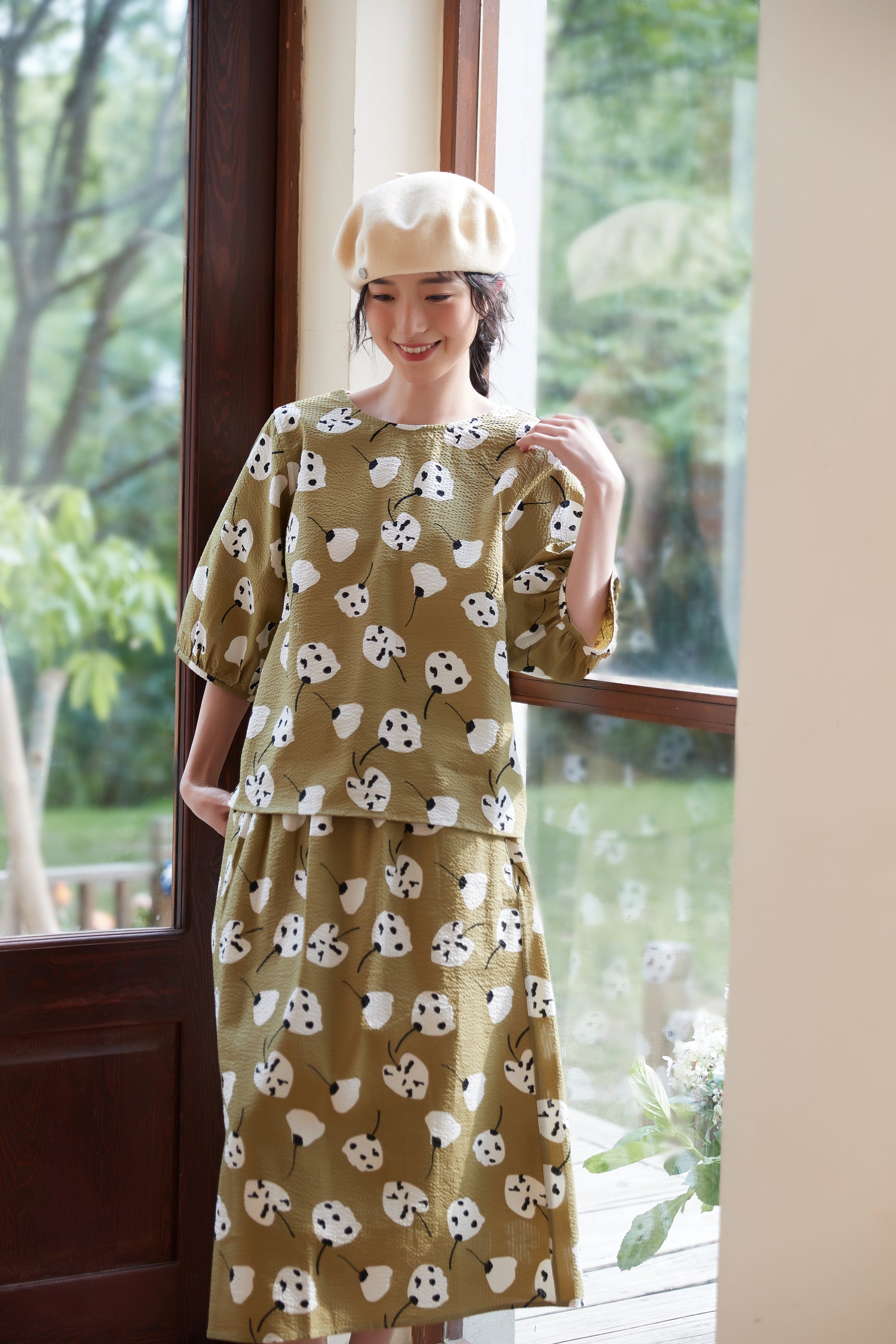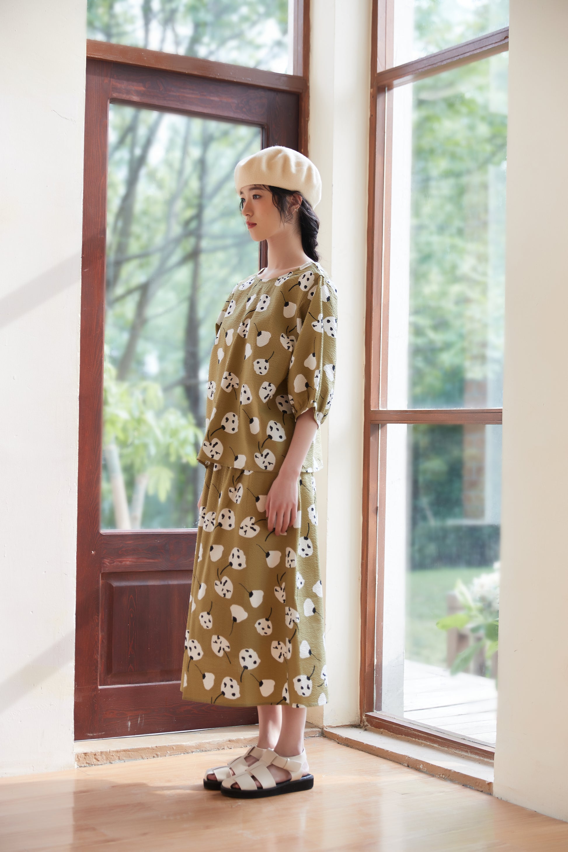 The abstract floral print artistically expresses the shapes and colors of the flowers, giving a unique and vivid impression. The print design gives off a girly and natural atmosphere while still bringing out a mature look. The knee-length skirt creates a refined silhouette and brings out feminine charm. You can tuck the short-sleeved top into the skirt to mark the waist, or wear the top loosely and balance it with the skirt to create a different look. This item can be worn as part of a set or as a single accent piece. It has an elastic waist and pockets on both sides.