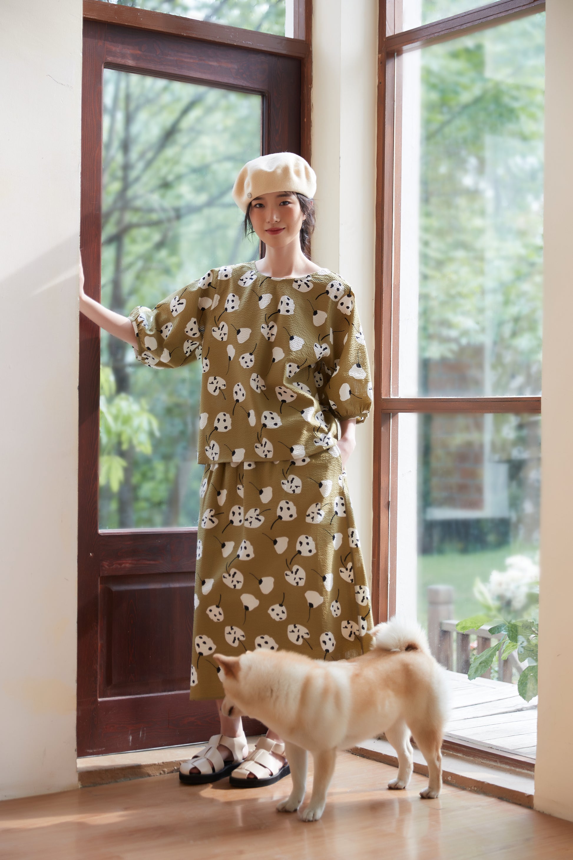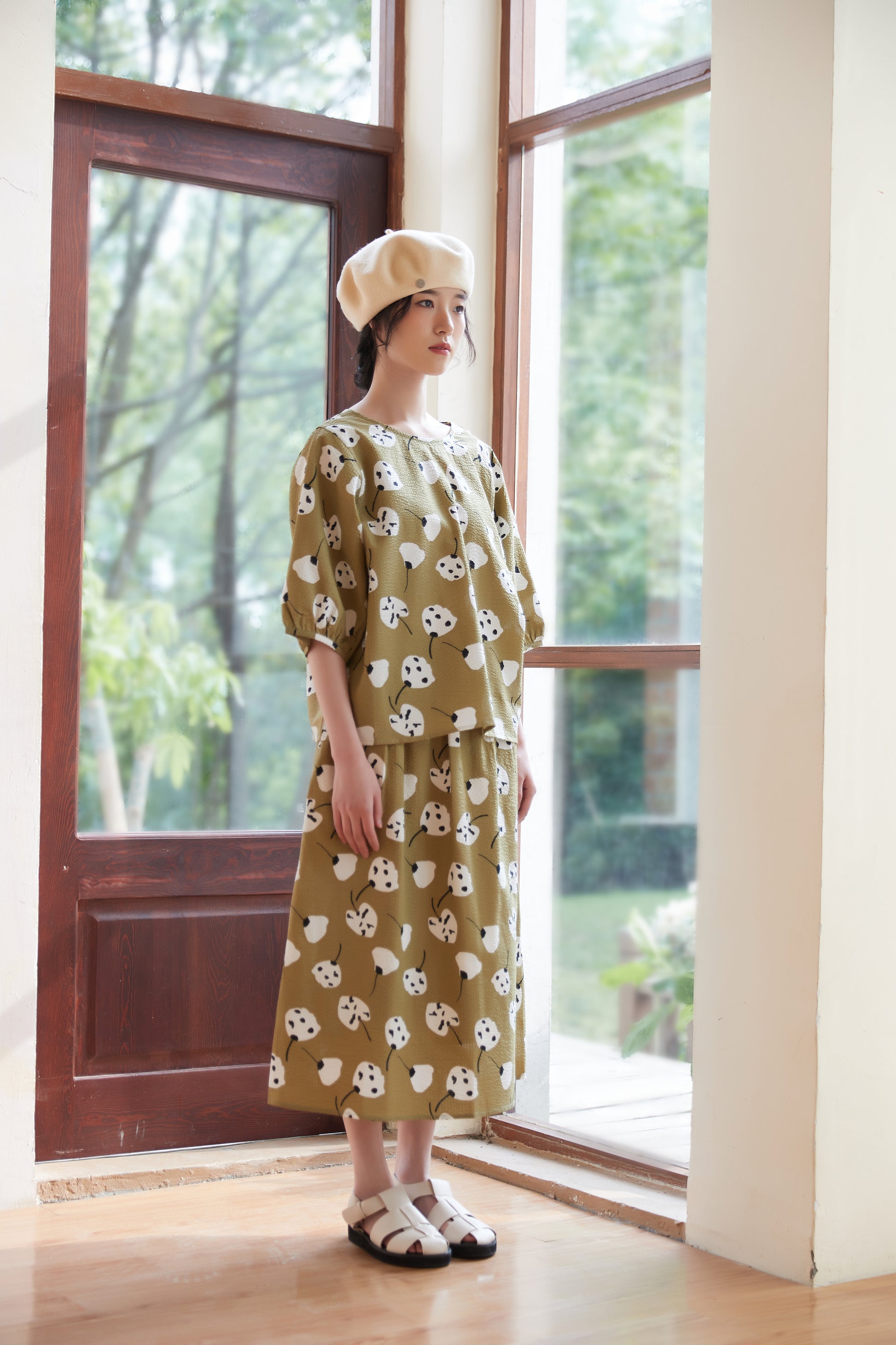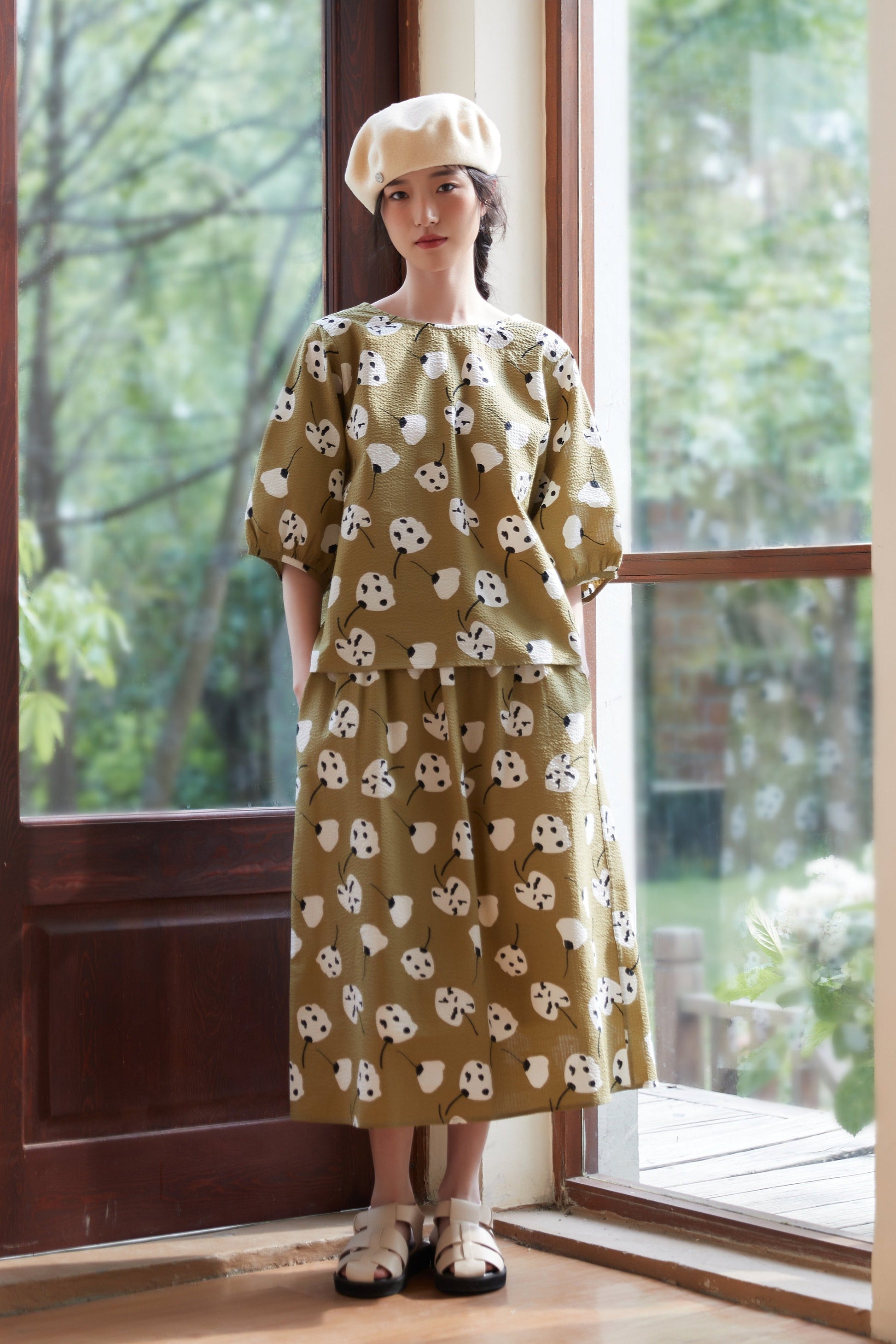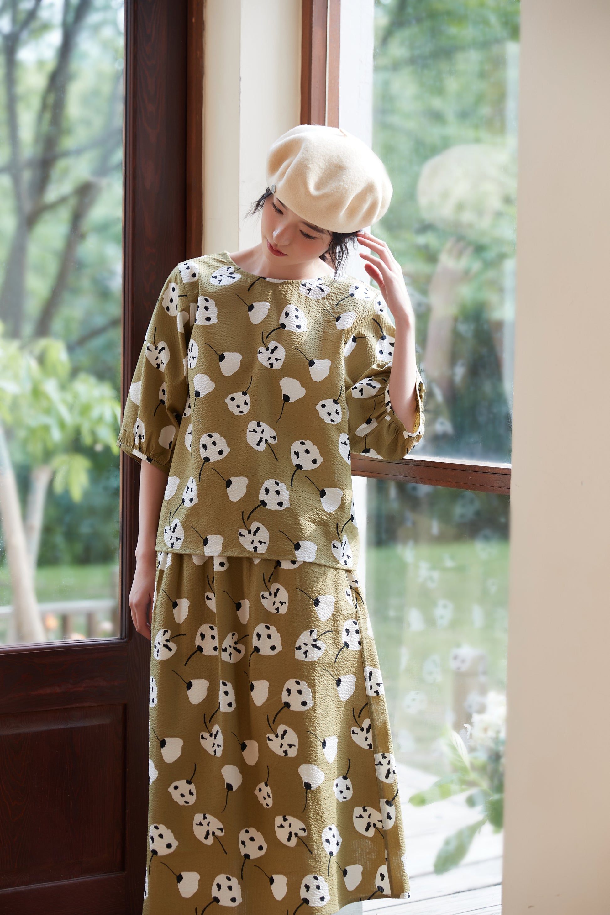 The abstract floral print artistically expresses the shapes and colors of the flowers, giving a unique and vivid impression. The print design gives off a girly and natural atmosphere while still bringing out a mature look. The knee-length skirt creates a refined silhouette and brings out feminine charm. You can tuck the short-sleeved top into the skirt to mark the waist, or wear the top loosely and balance it with the skirt to create a different look. This item can be worn as part of a set or as a single accent piece. It has an elastic waist and pockets on both sides.