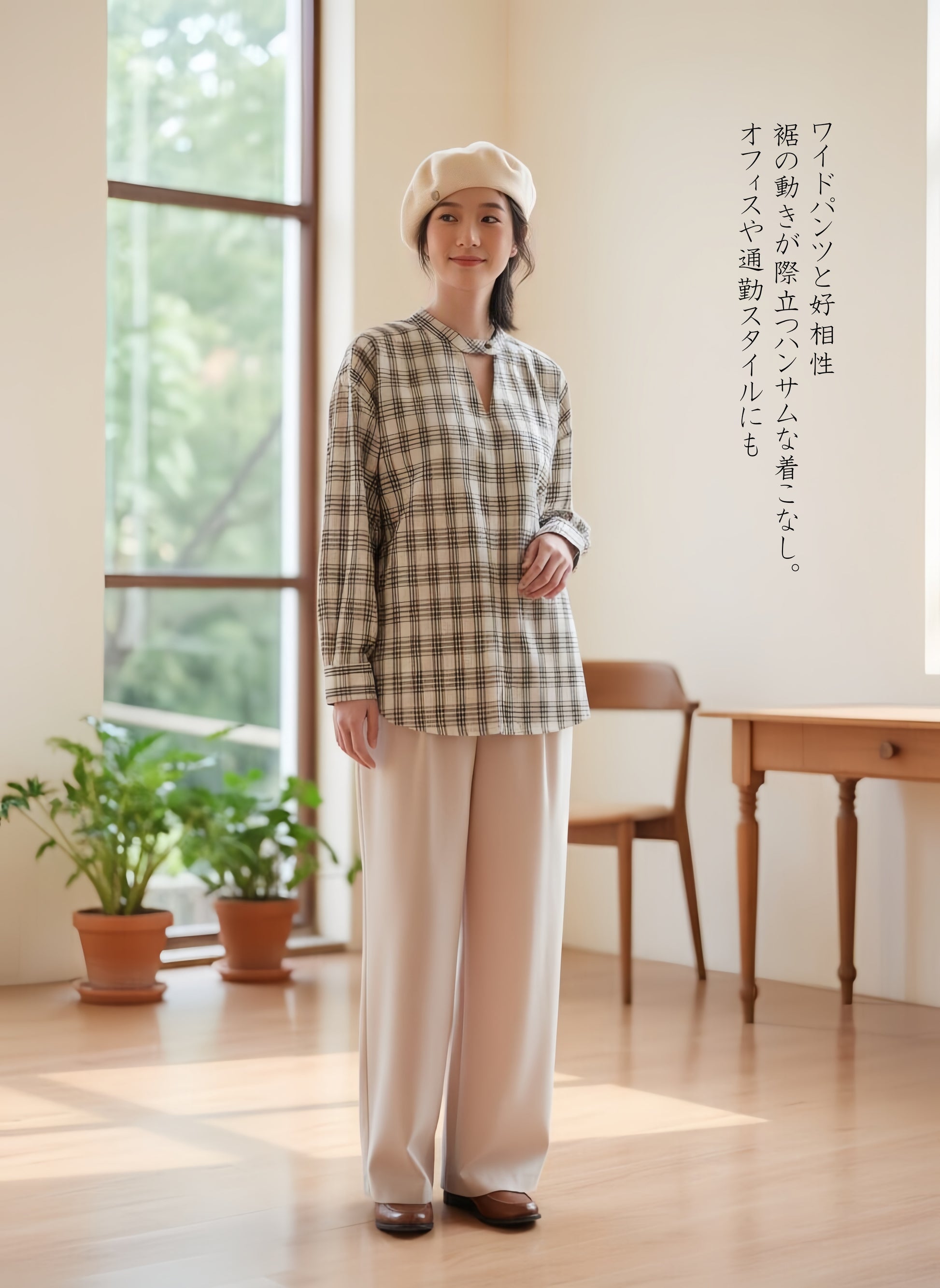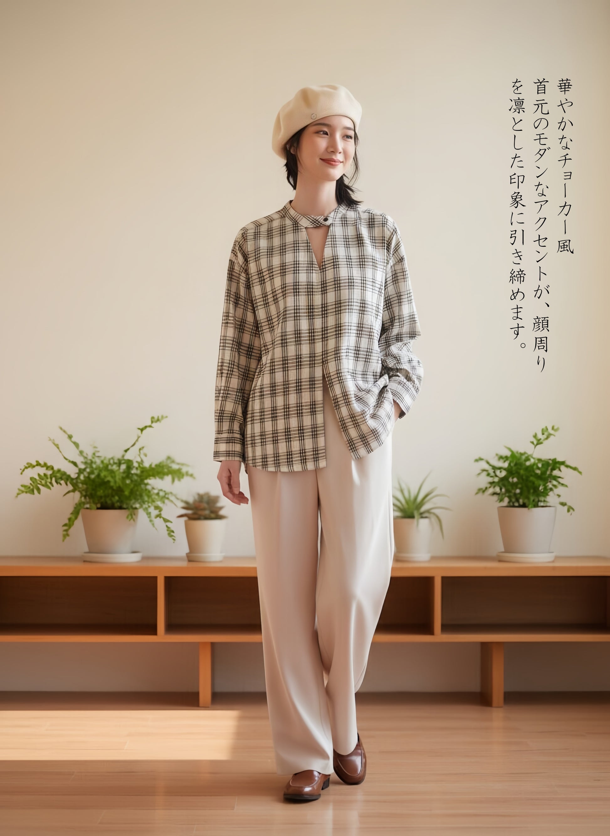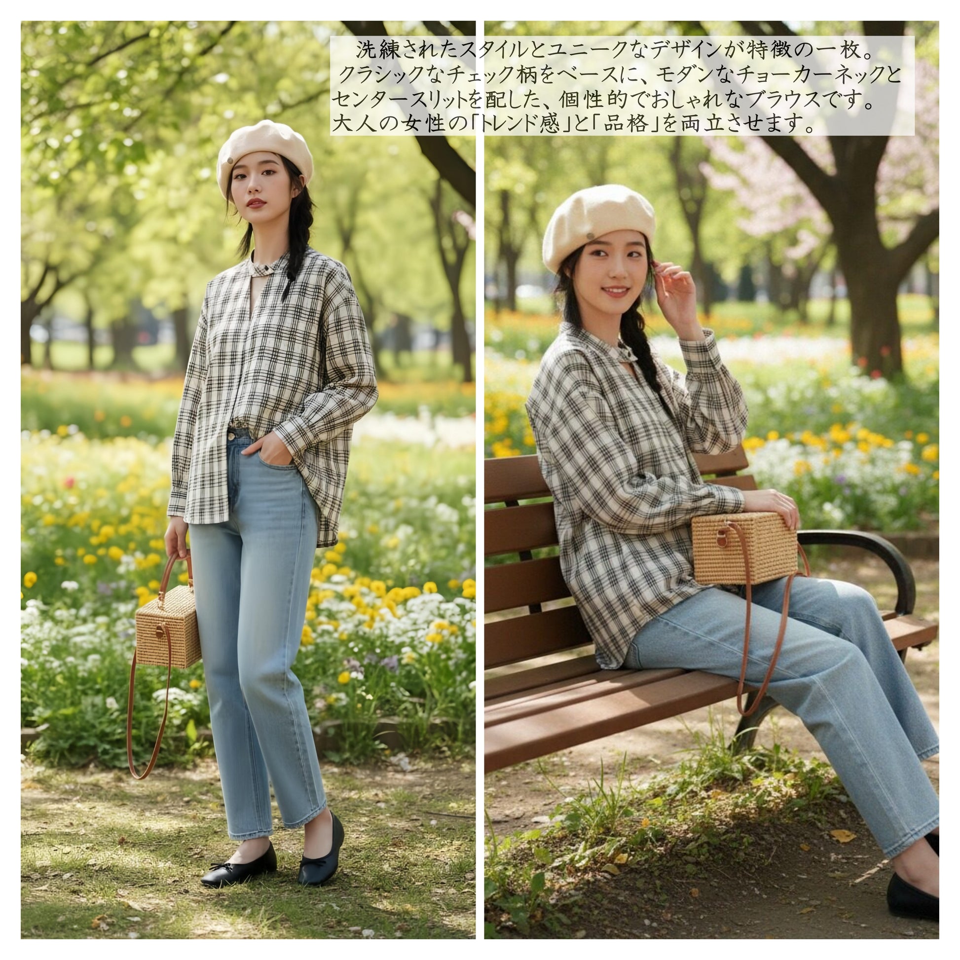This item features a sophisticated style and unique design. This trendy blouse is perfect for mature women, but the check pattern brings out a classic charm. The center slit and choker neck details add a modern accent, creating a unique and stylish style. The deep slit at the hem allows you to tuck the hem in for a leg-lengthening look. This item goes well with wide pants, denim, and long skirts.