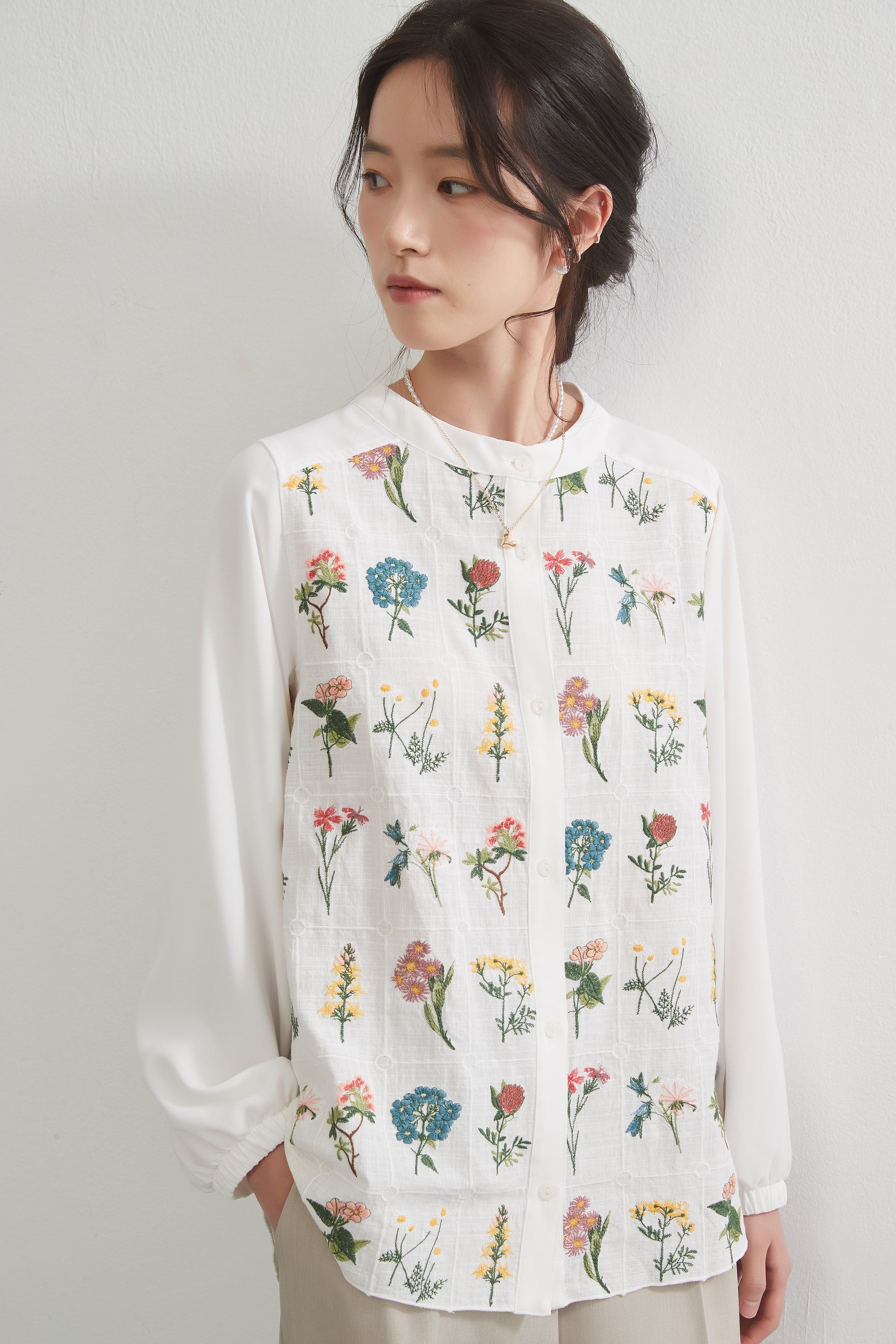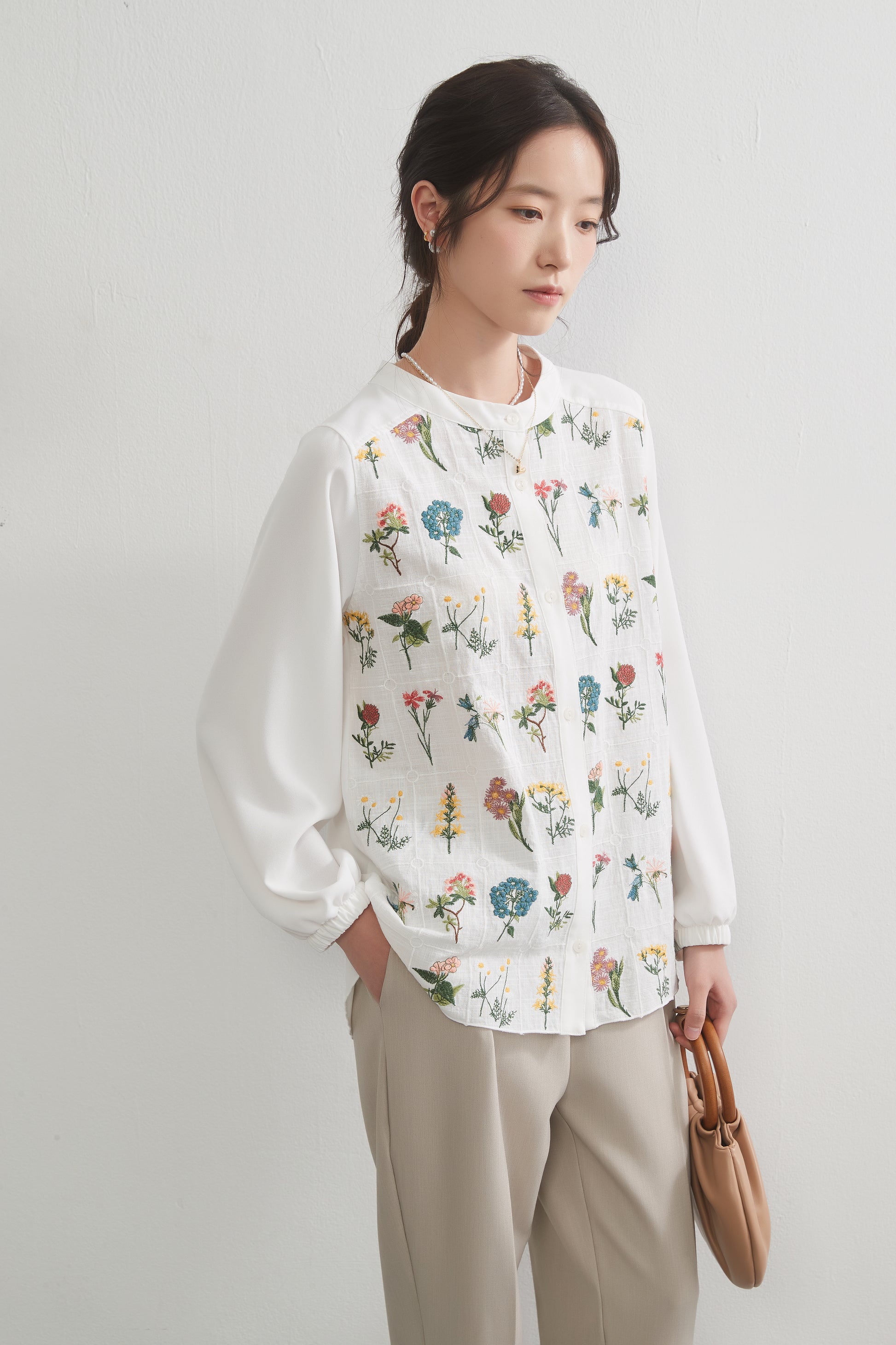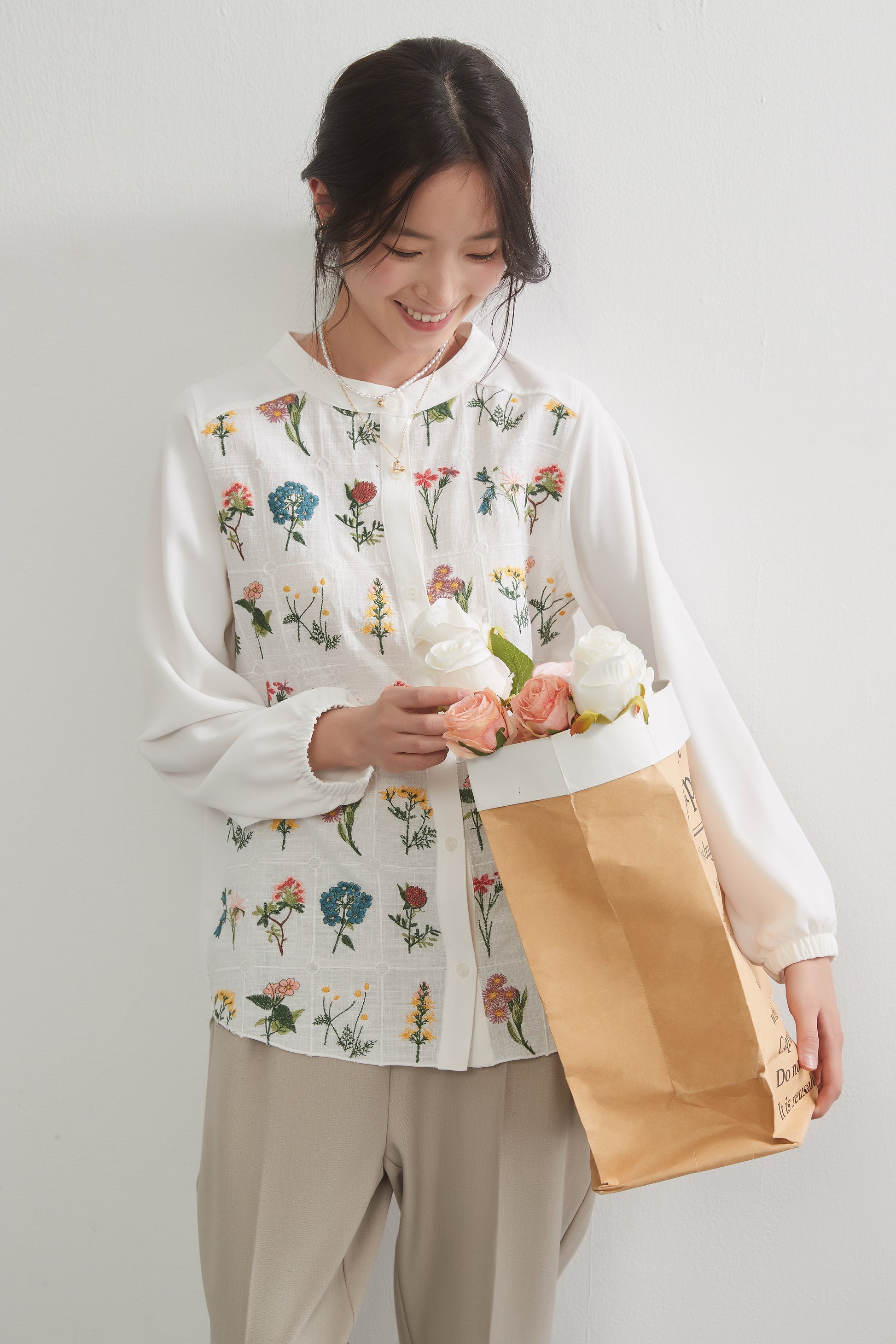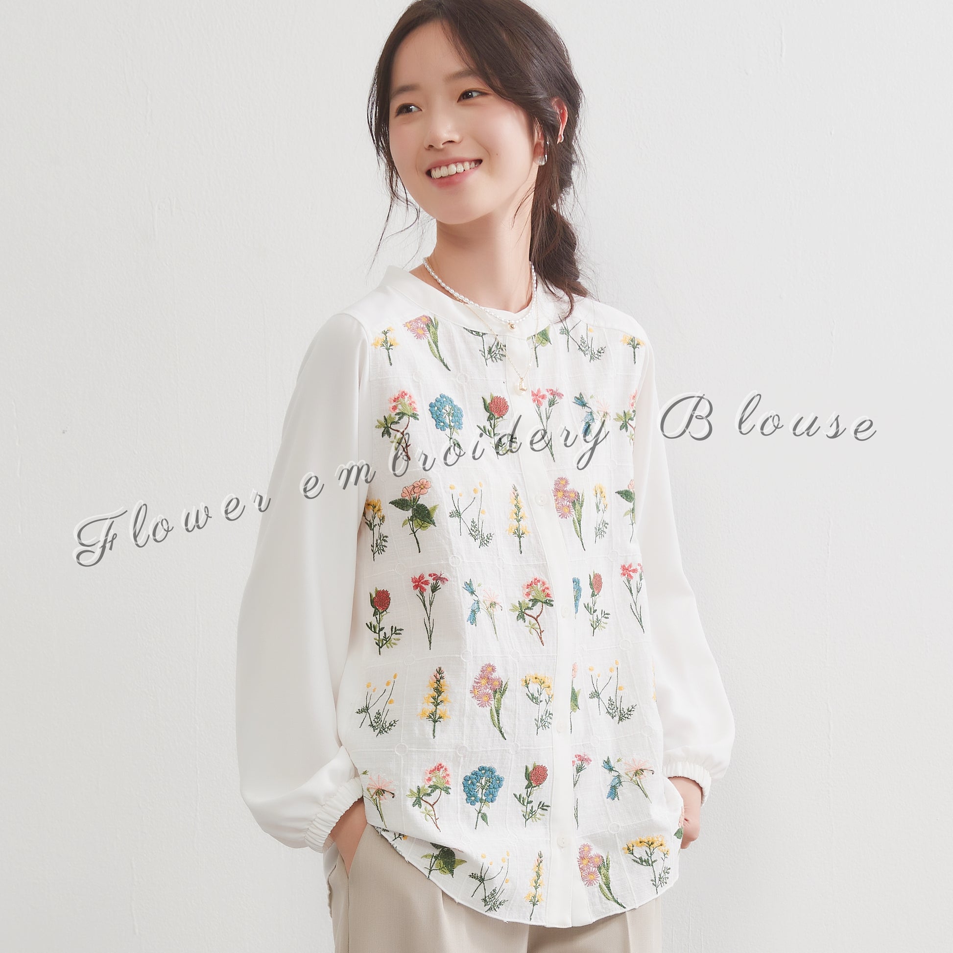 胸元から裾にかけて彩られた花柄刺繍が、ナチュラルでエレガントな雰囲気を演出するブラウスです。シンプルなホワイトのベースに鮮やかな花々が映え、華やかさと上品さを両立させています。