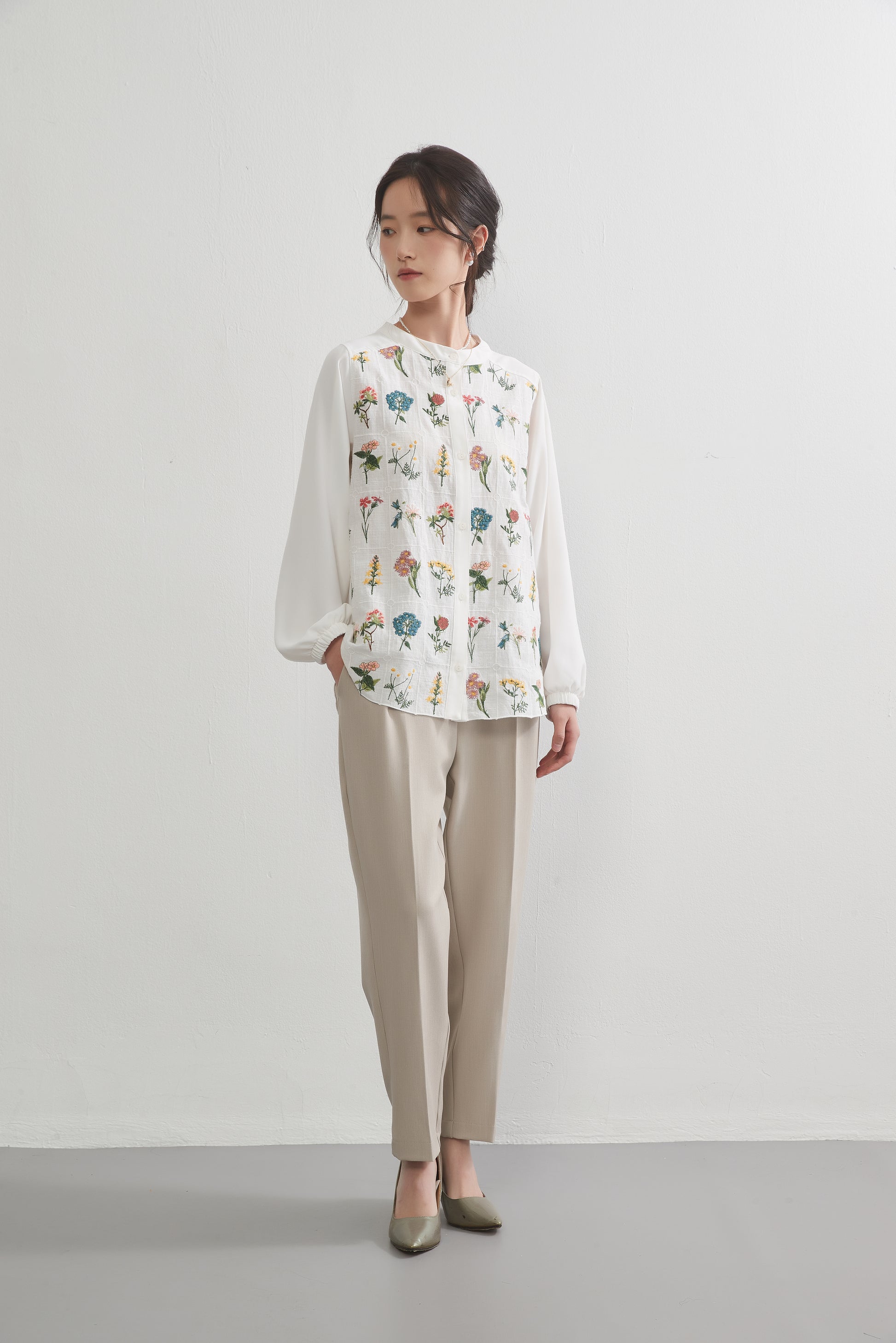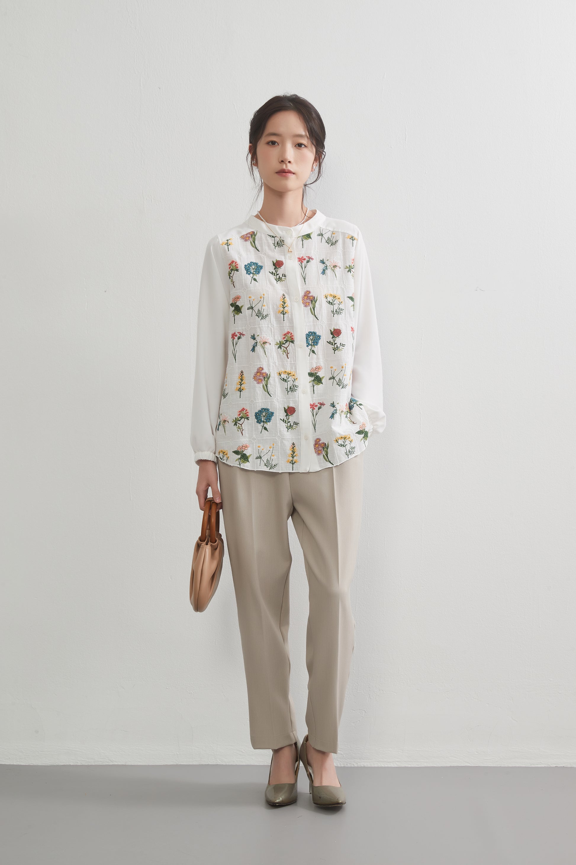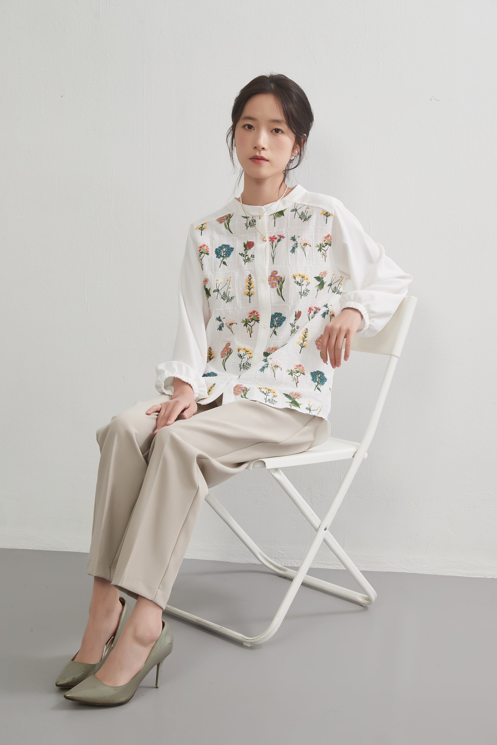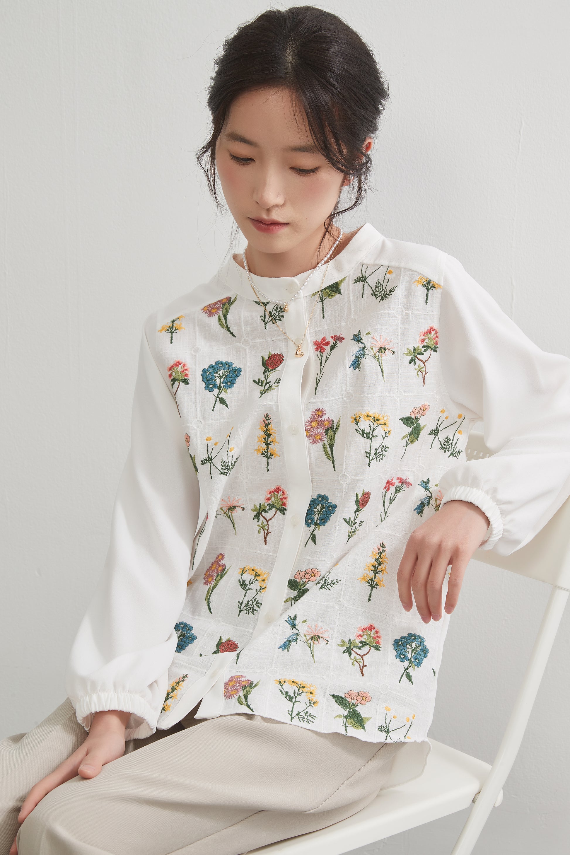胸元から裾にかけて彩られた花柄刺繍が、ナチュラルでエレガントな雰囲気を演出するブラウスです。シンプルなホワイトのベースに鮮やかな花々が映え、華やかさと上品さを両立させています。