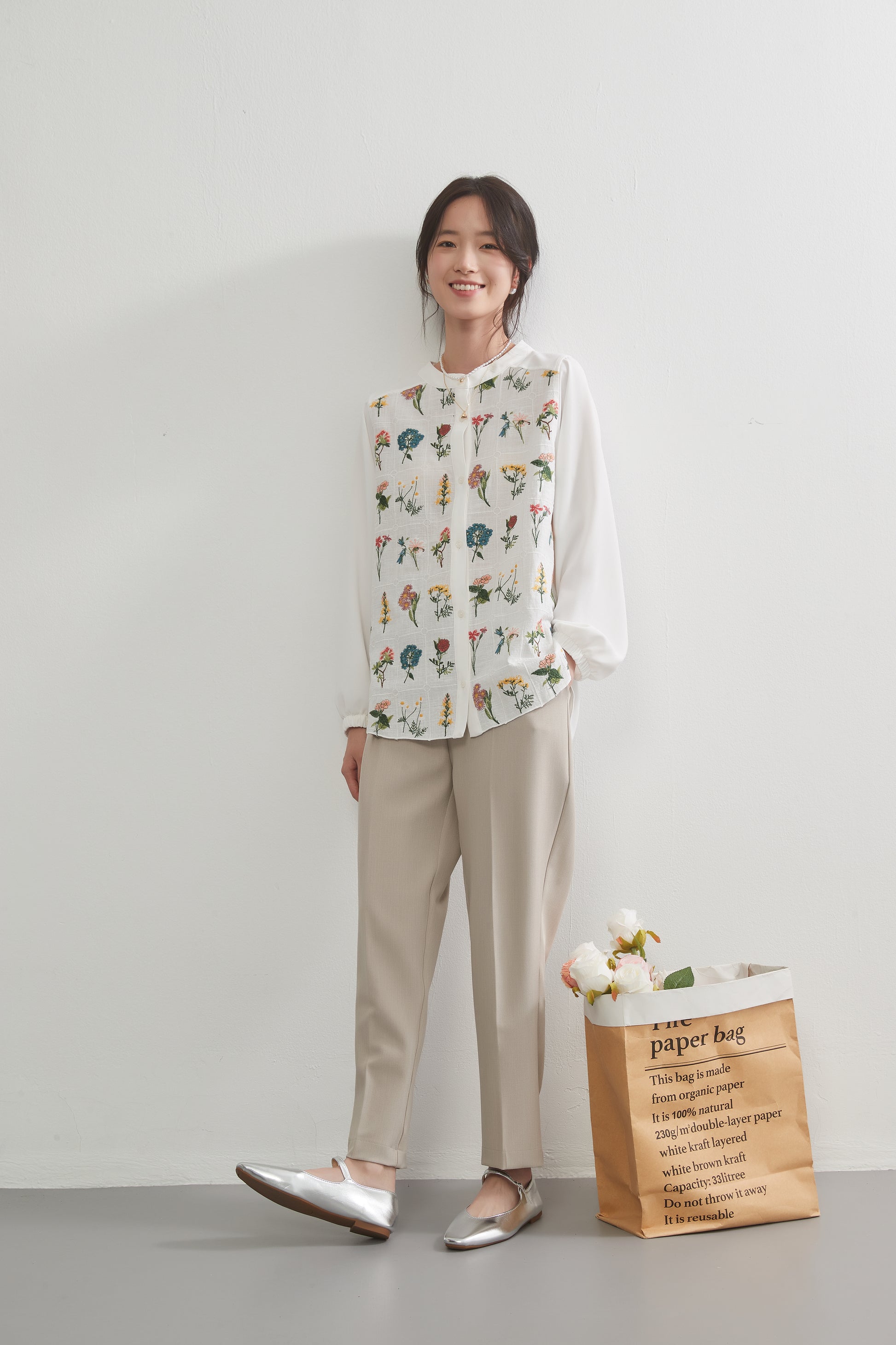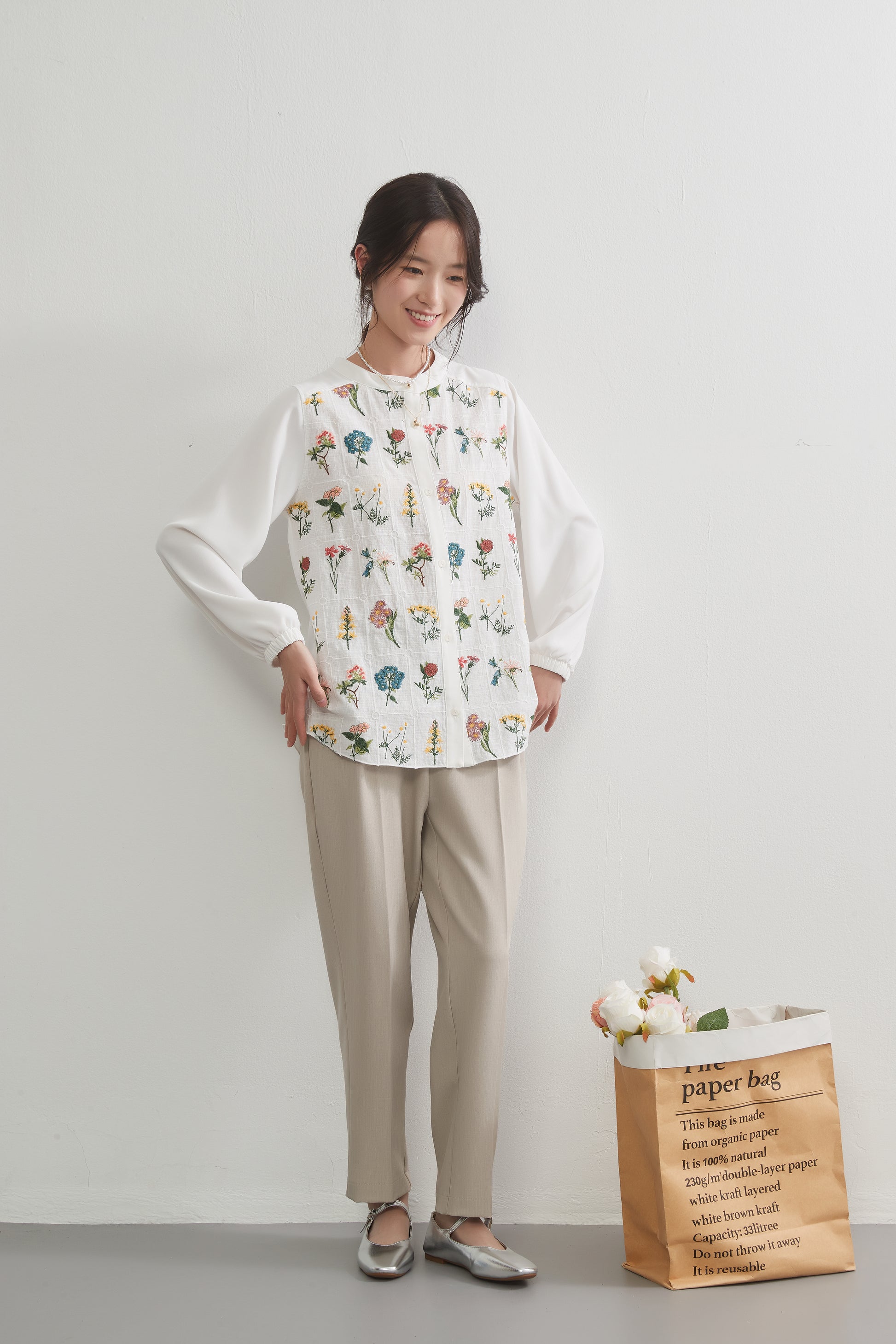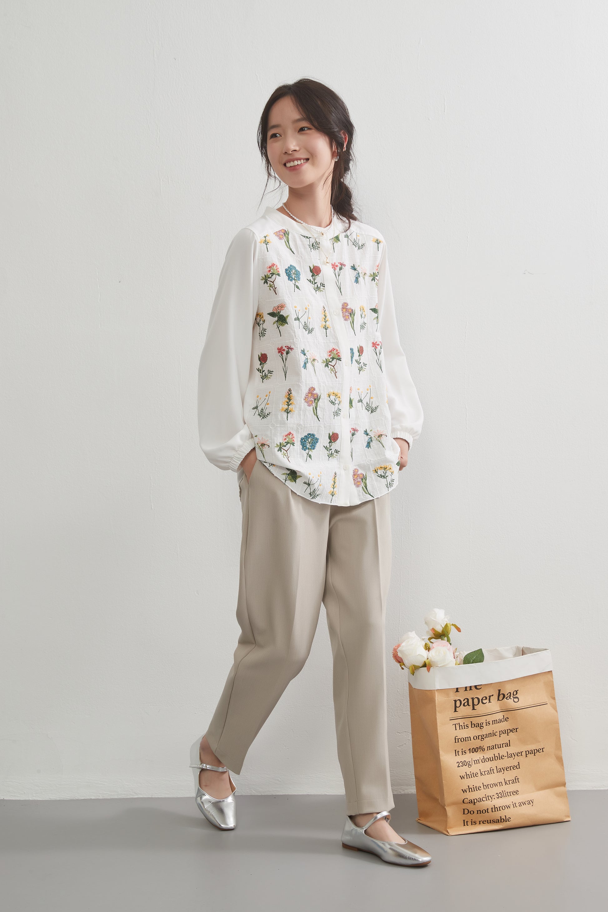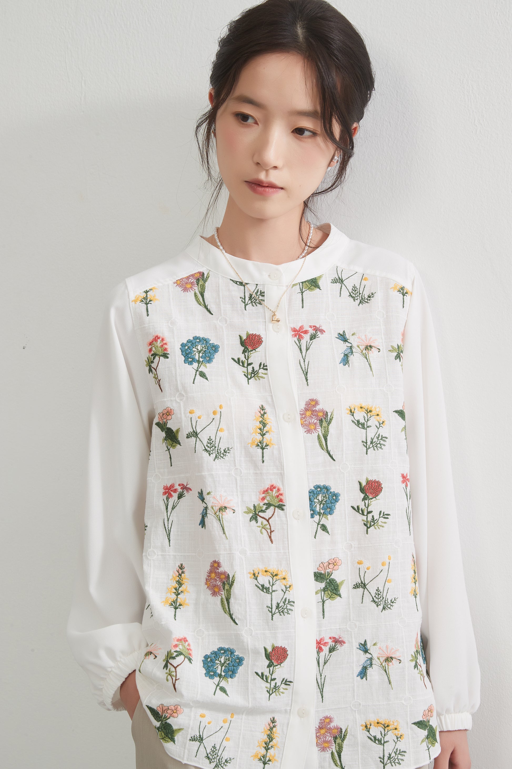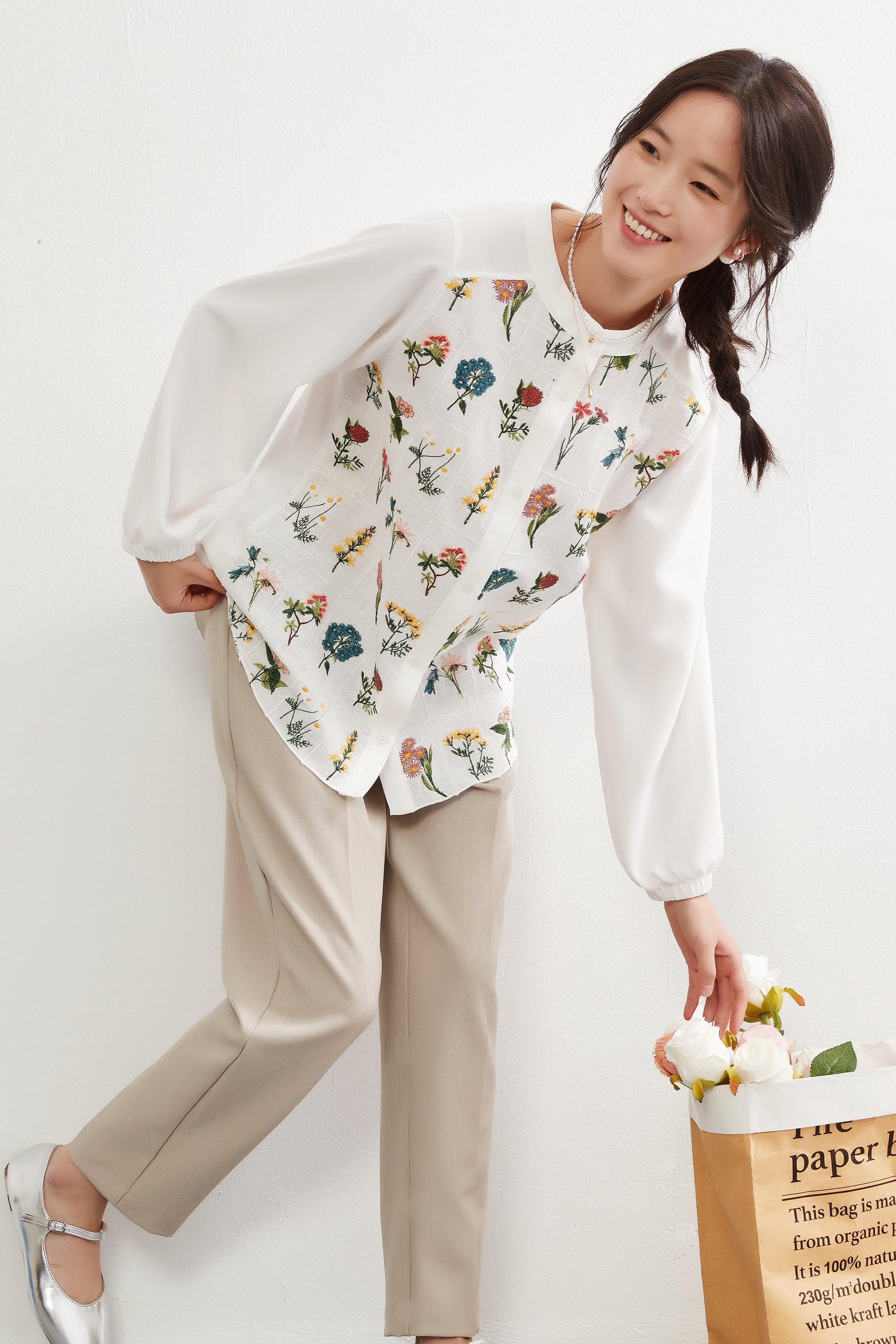 胸元から裾にかけて彩られた花柄刺繍が、ナチュラルでエレガントな雰囲気を演出するブラウスです。シンプルなホワイトのベースに鮮やかな花々が映え、華やかさと上品さを両立させています。