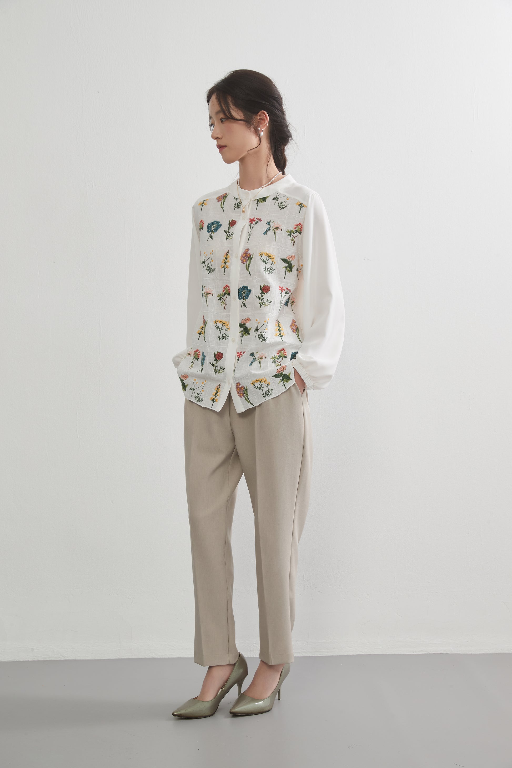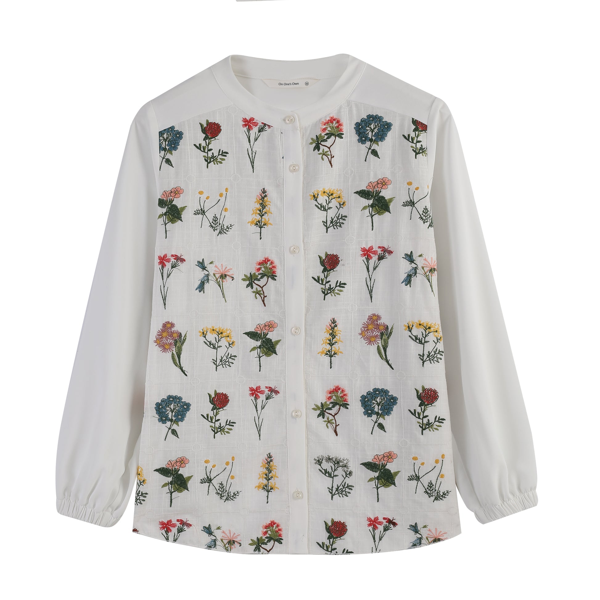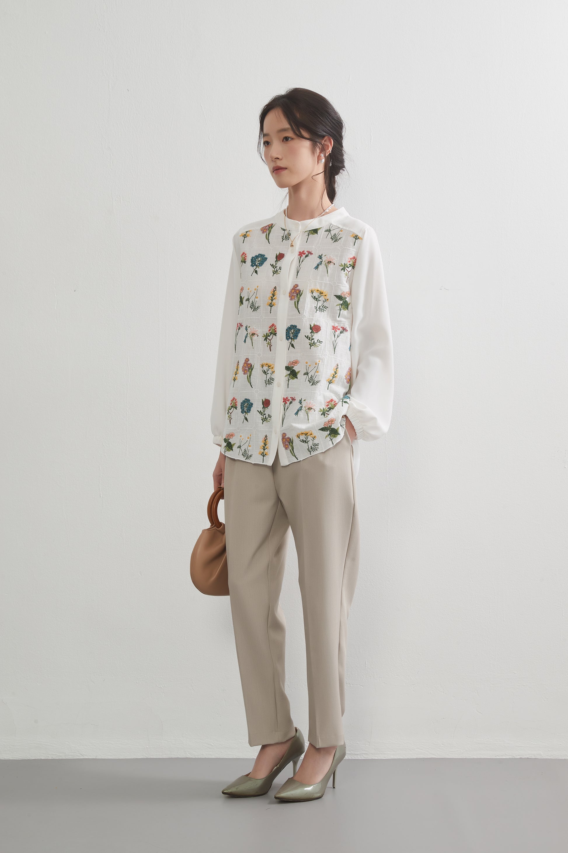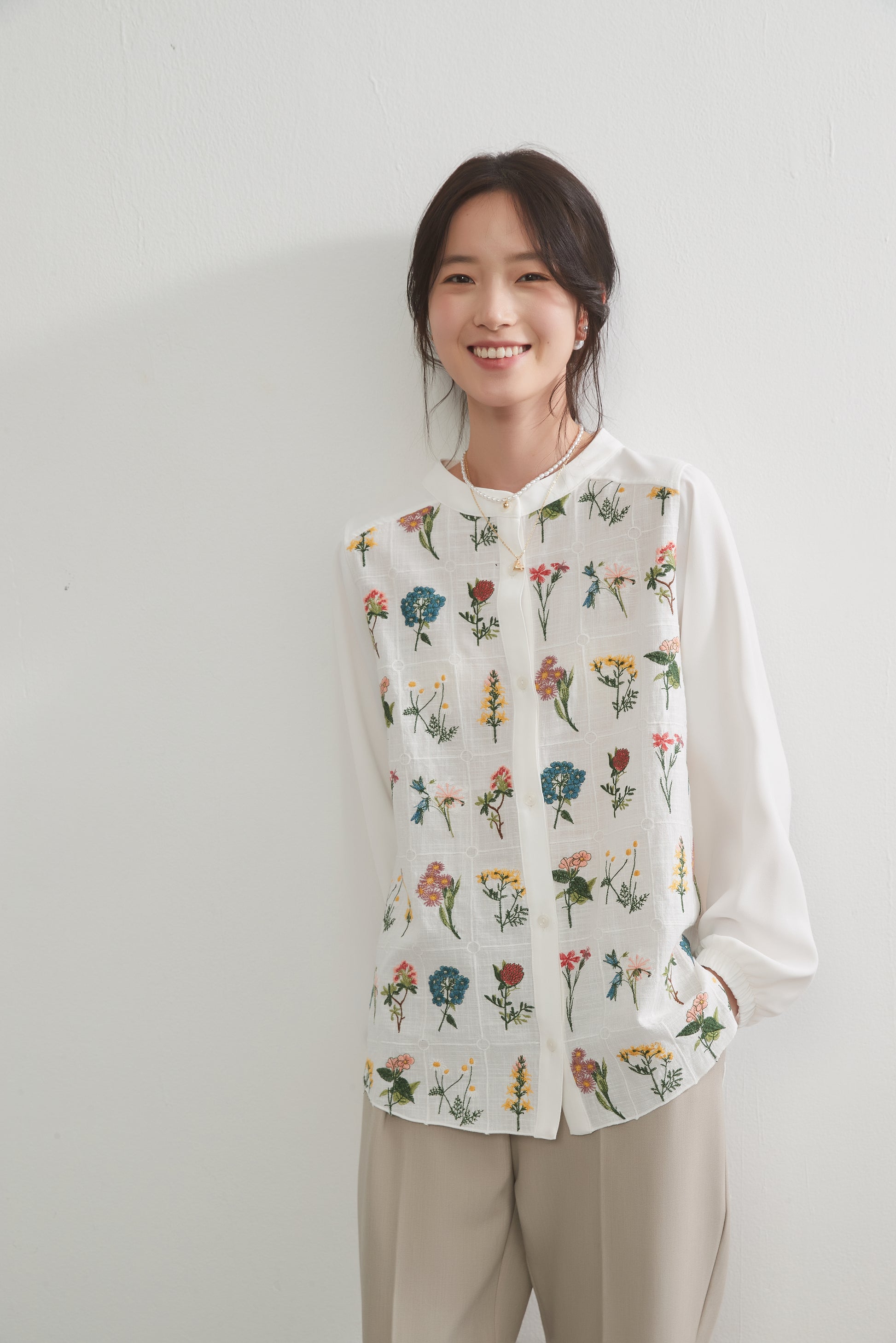 胸元から裾にかけて彩られた花柄刺繍が、ナチュラルでエレガントな雰囲気を演出するブラウスです。シンプルなホワイトのベースに鮮やかな花々が映え、華やかさと上品さを両立させています。