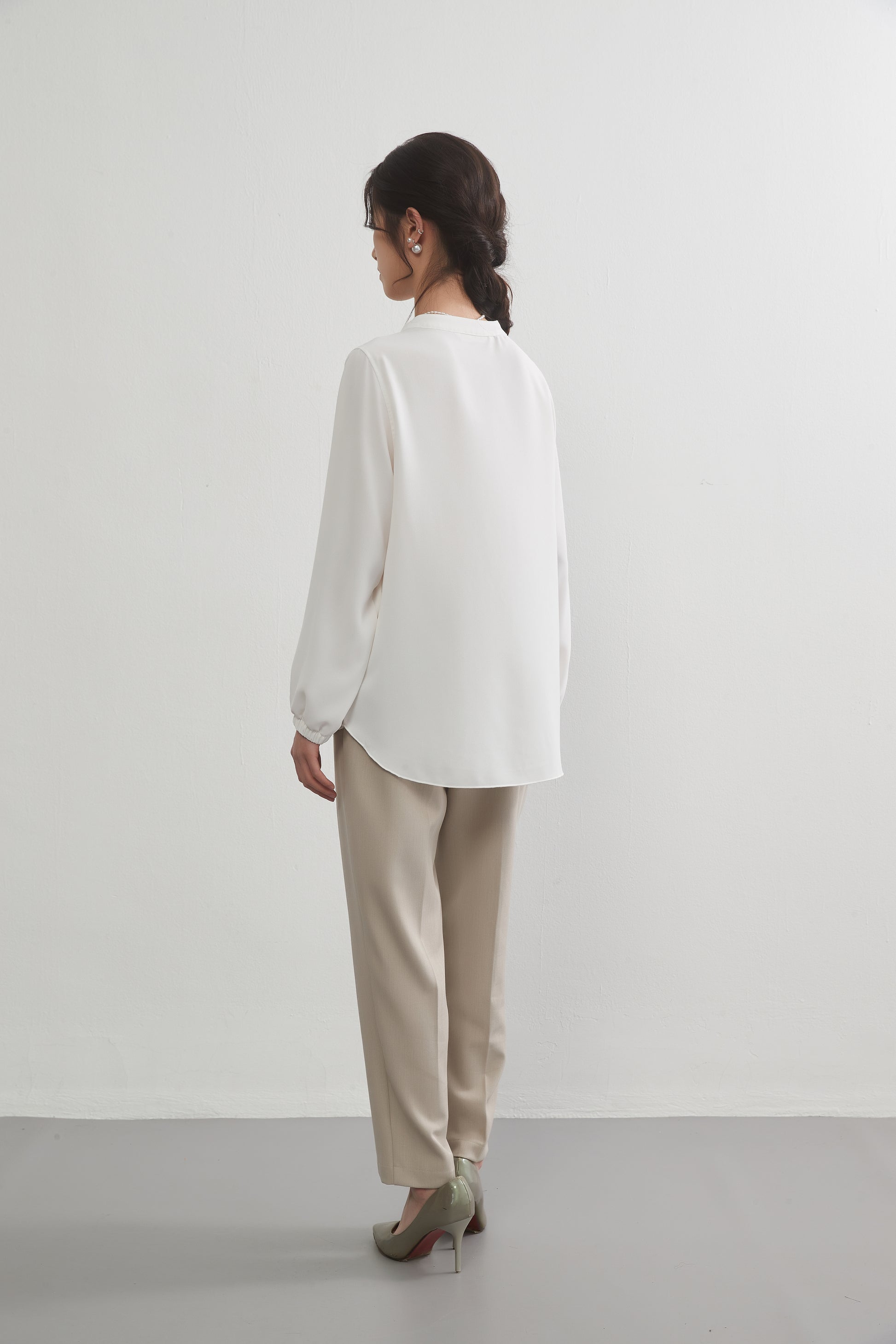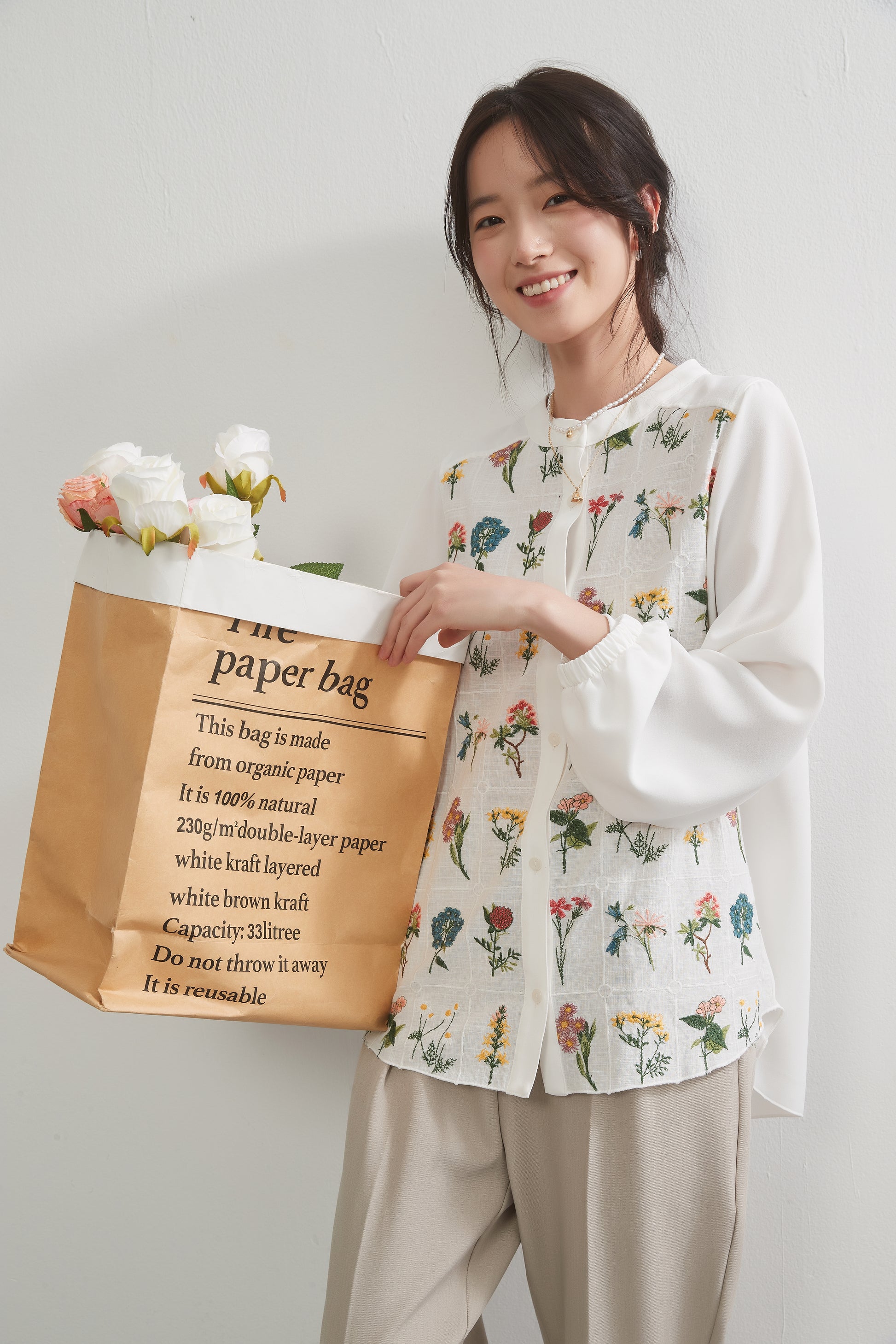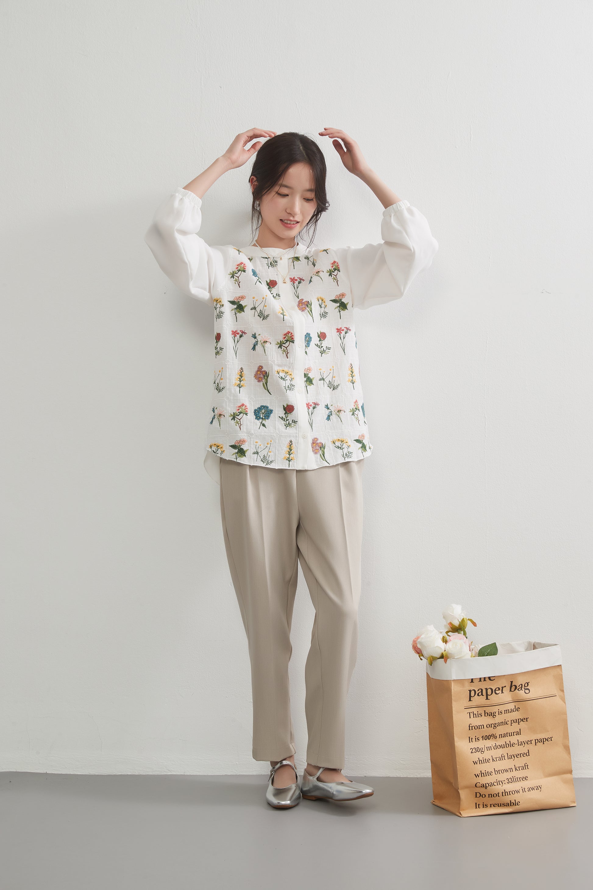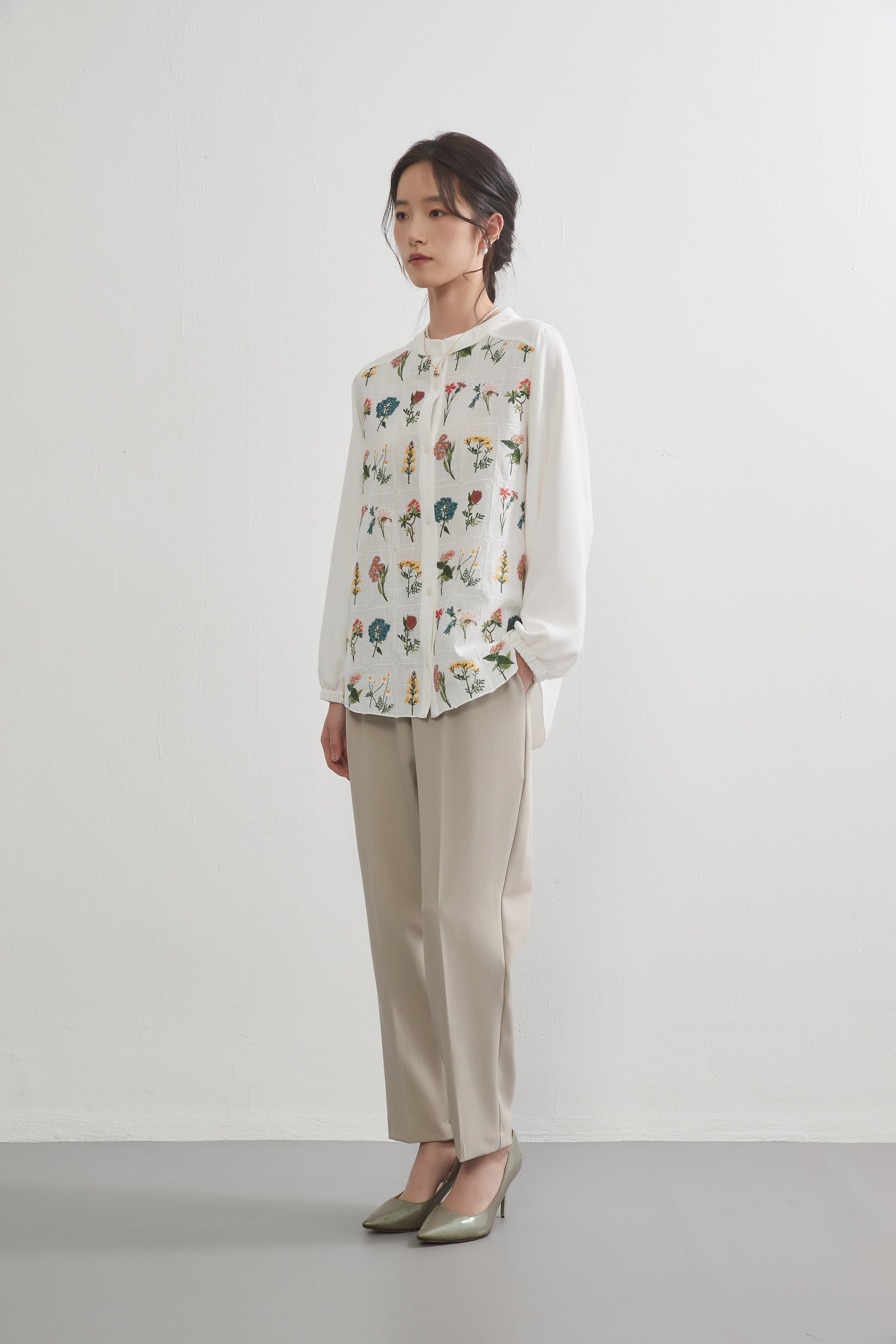 胸元から裾にかけて彩られた花柄刺繍が、ナチュラルでエレガントな雰囲気を演出するブラウスです。シンプルなホワイトのベースに鮮やかな花々が映え、華やかさと上品さを両立させています。
