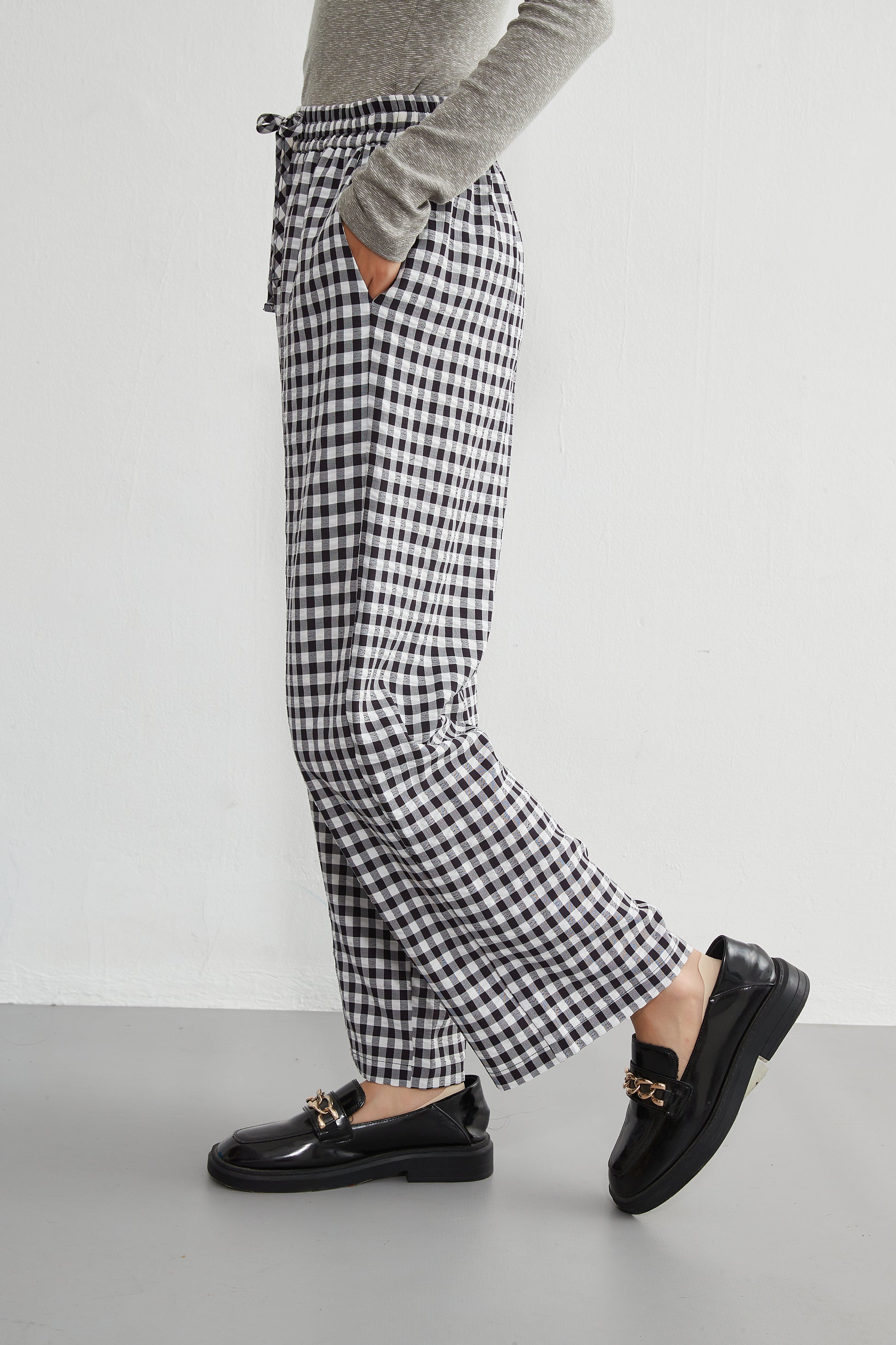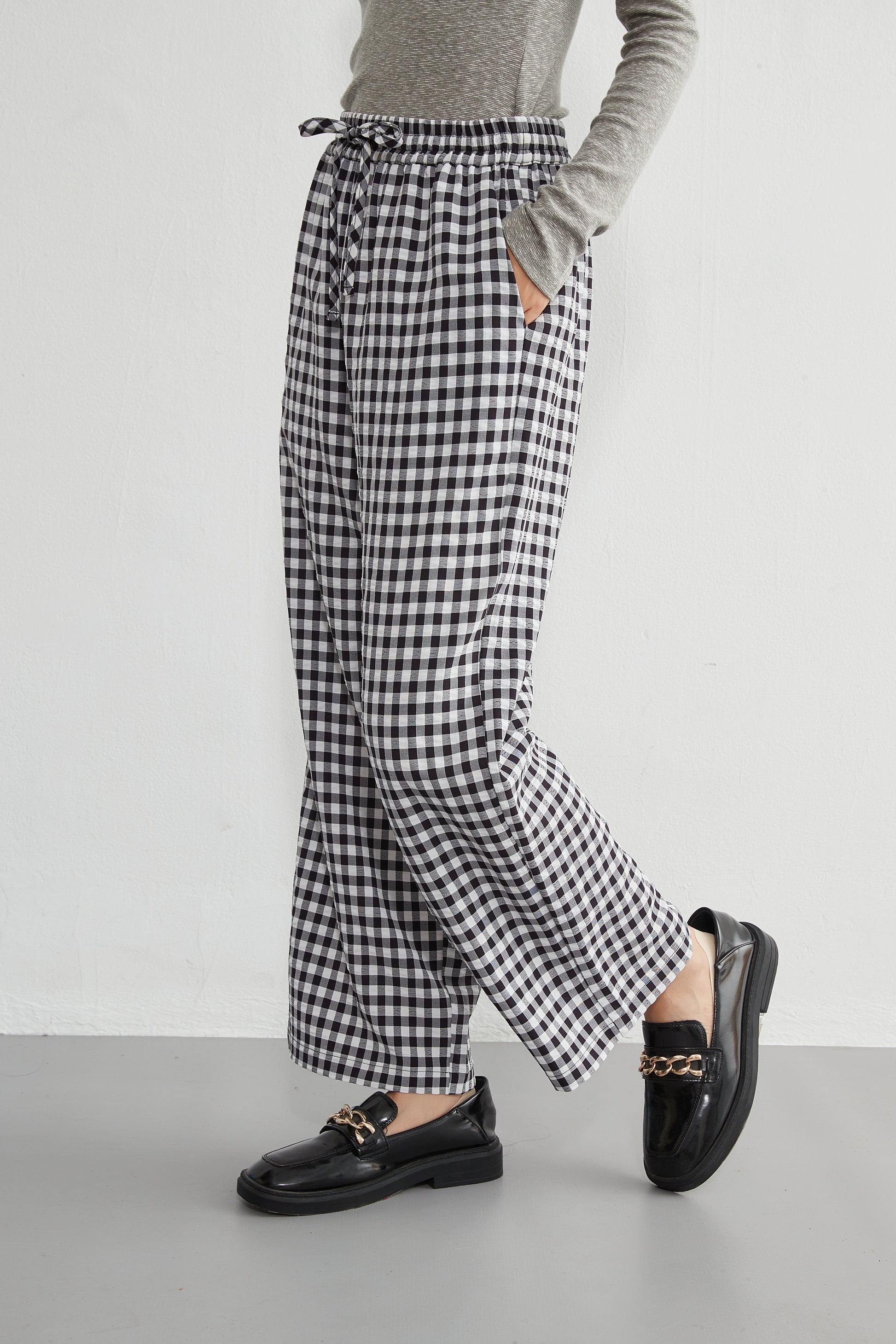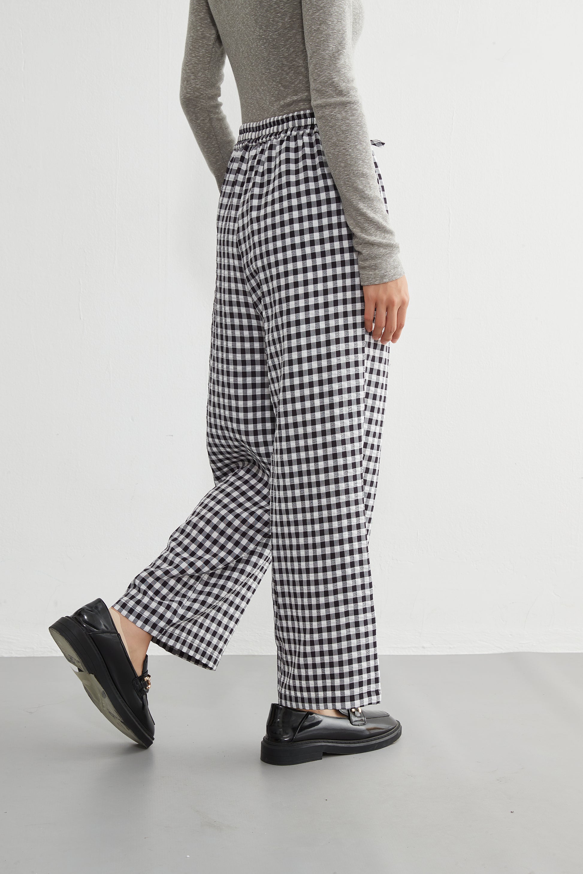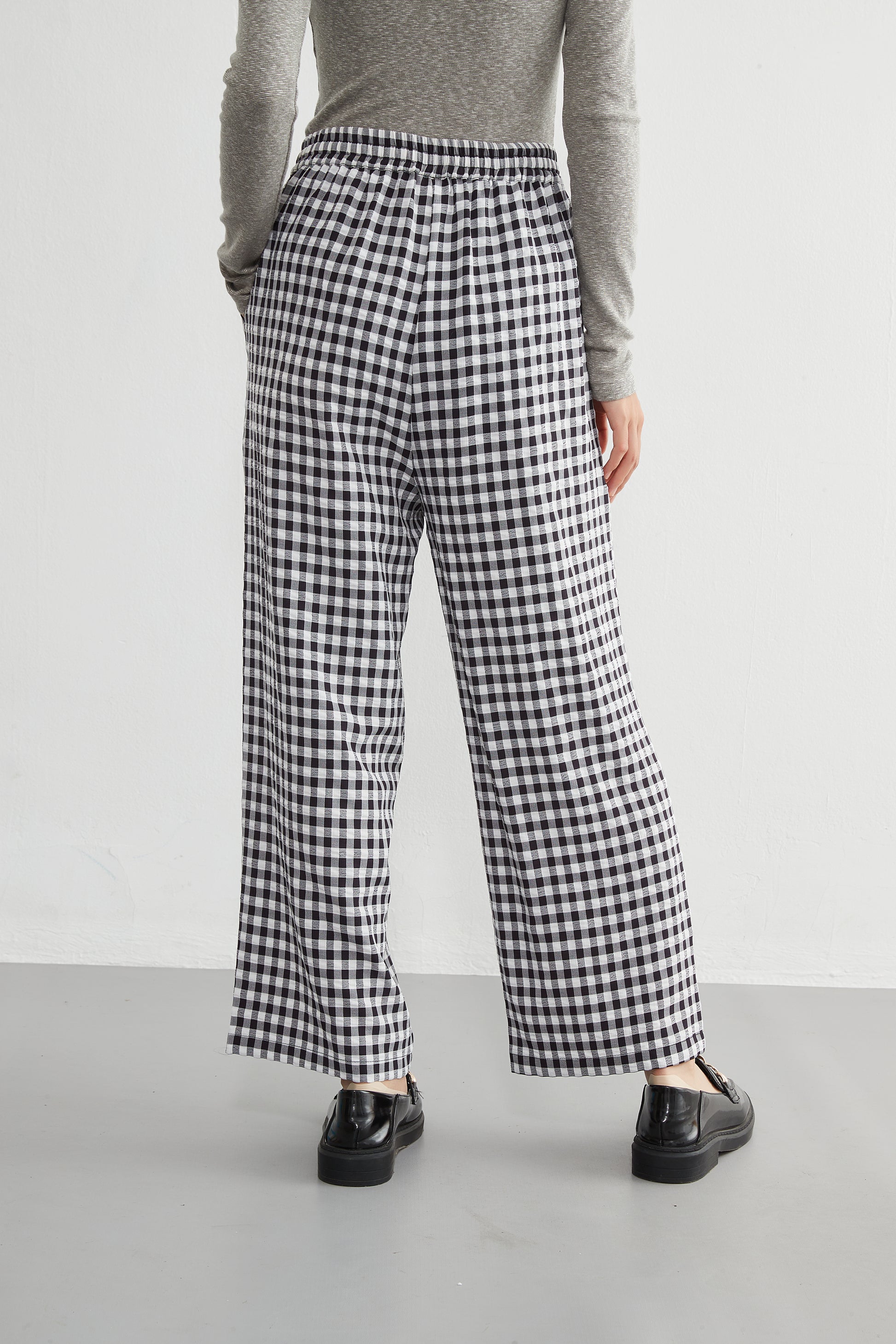 クラシカルなギンガムチェックが目を引く、リラックス感のあるストレートパンツ。すとんと落ちるストレートシルエットで脚のラインを拾いにくく、快適さときちんと感を両立。ウエストは総ゴム仕様で着脱もらくちんです。