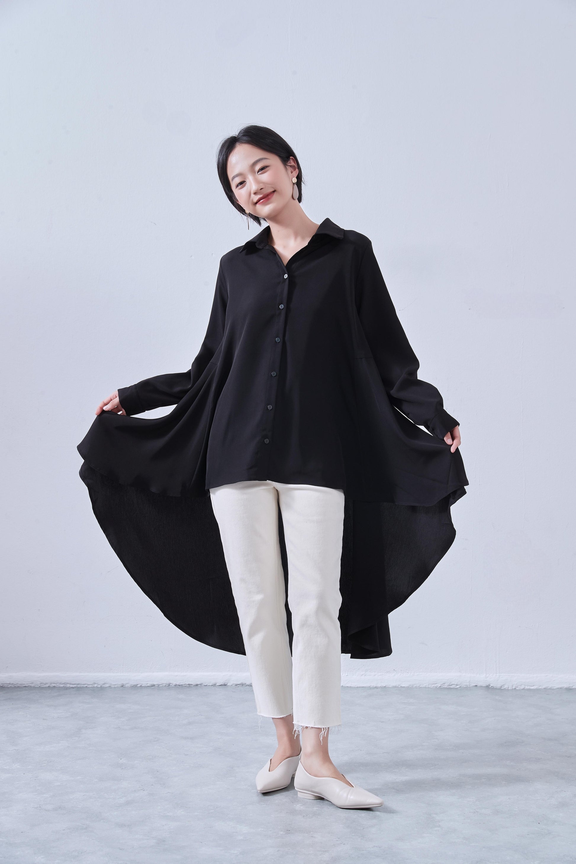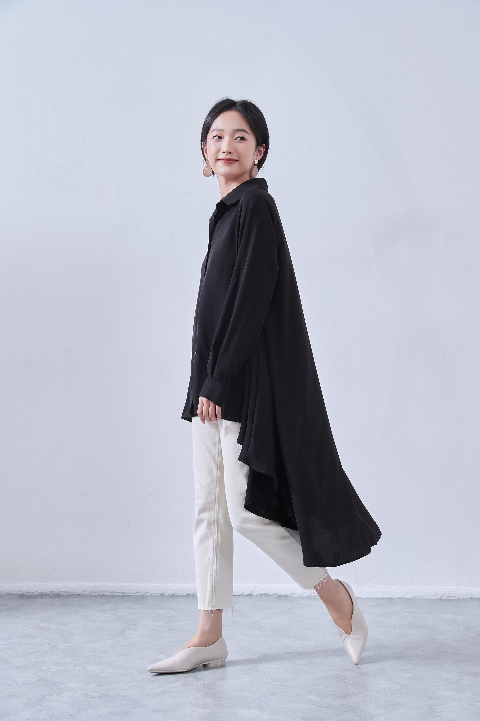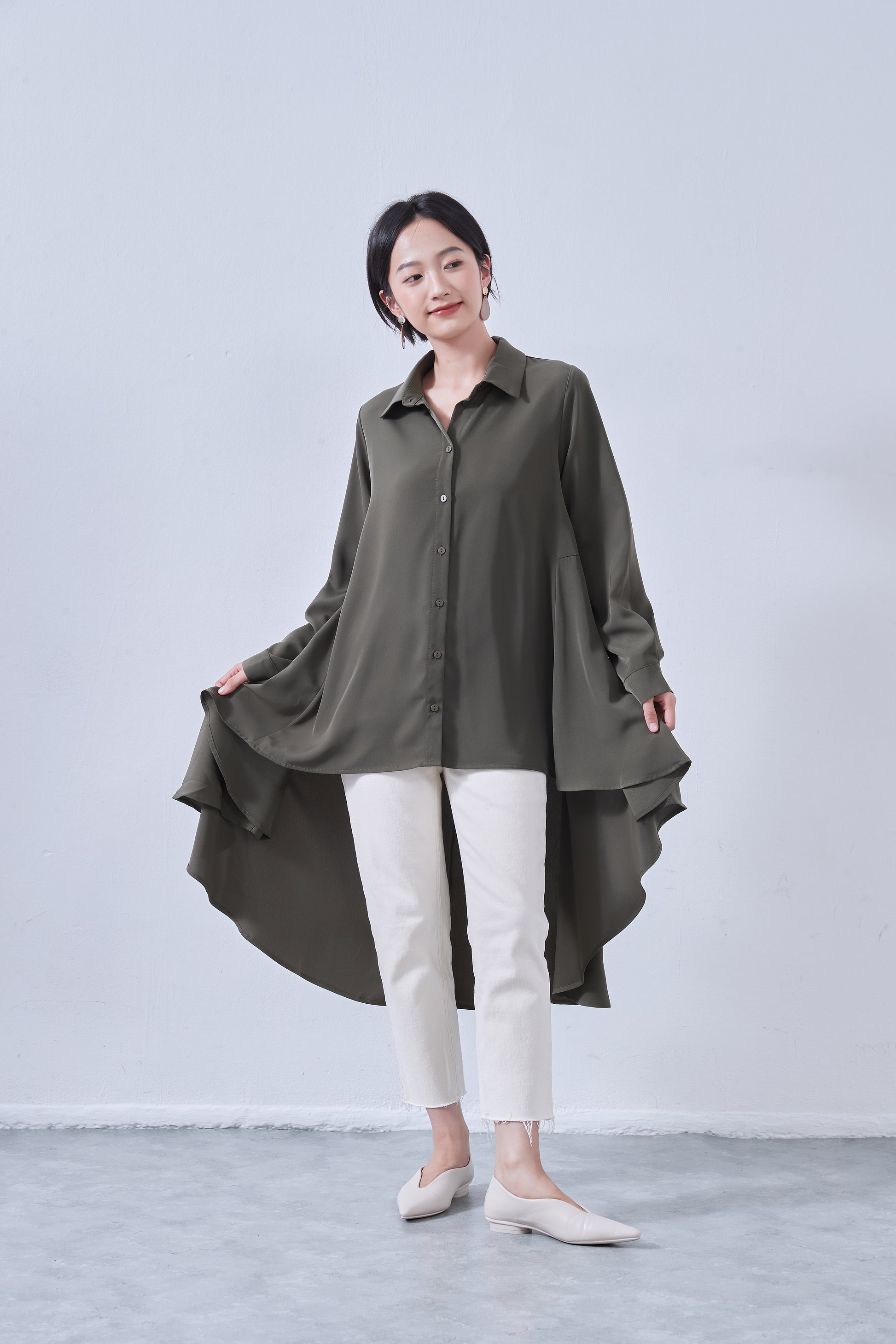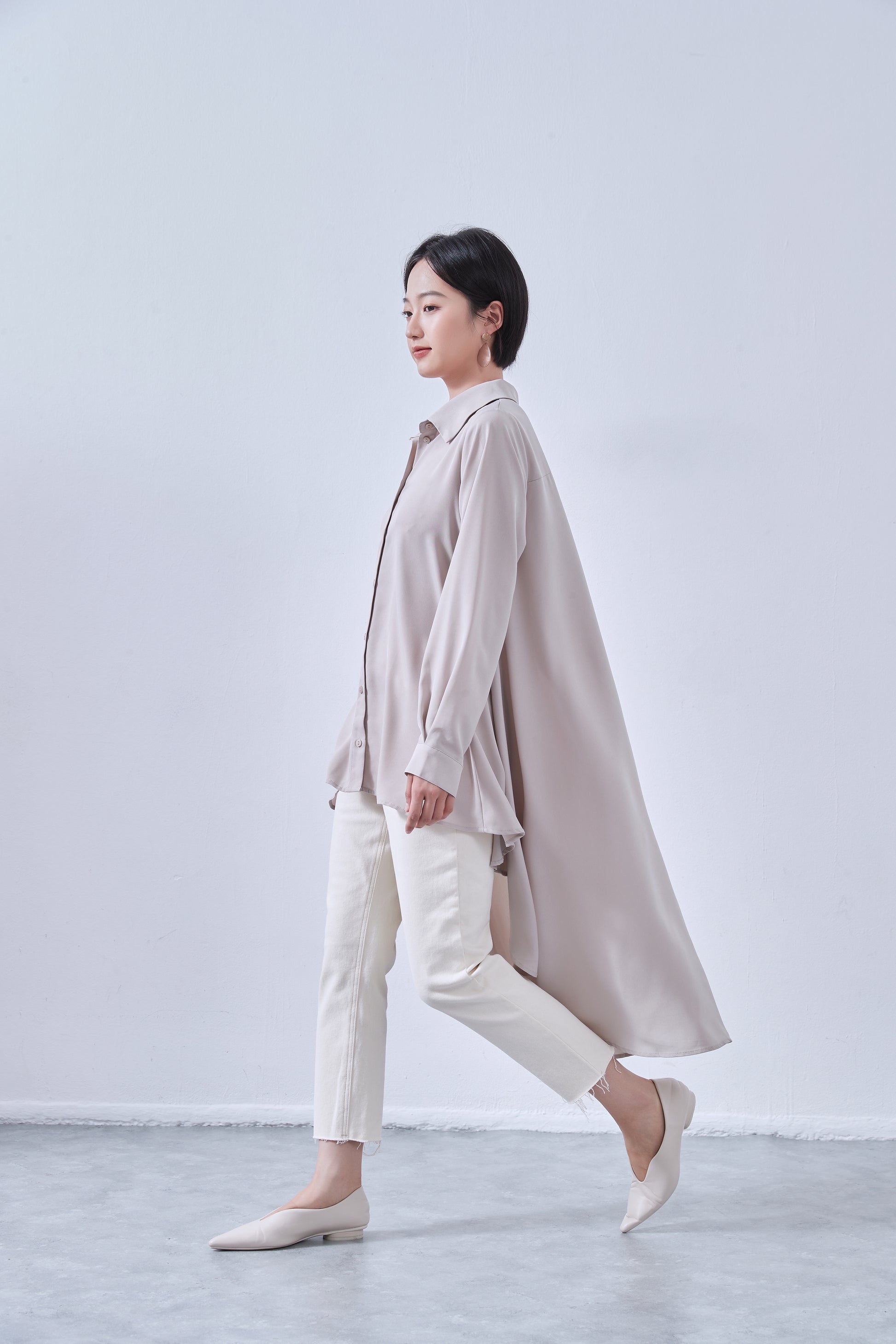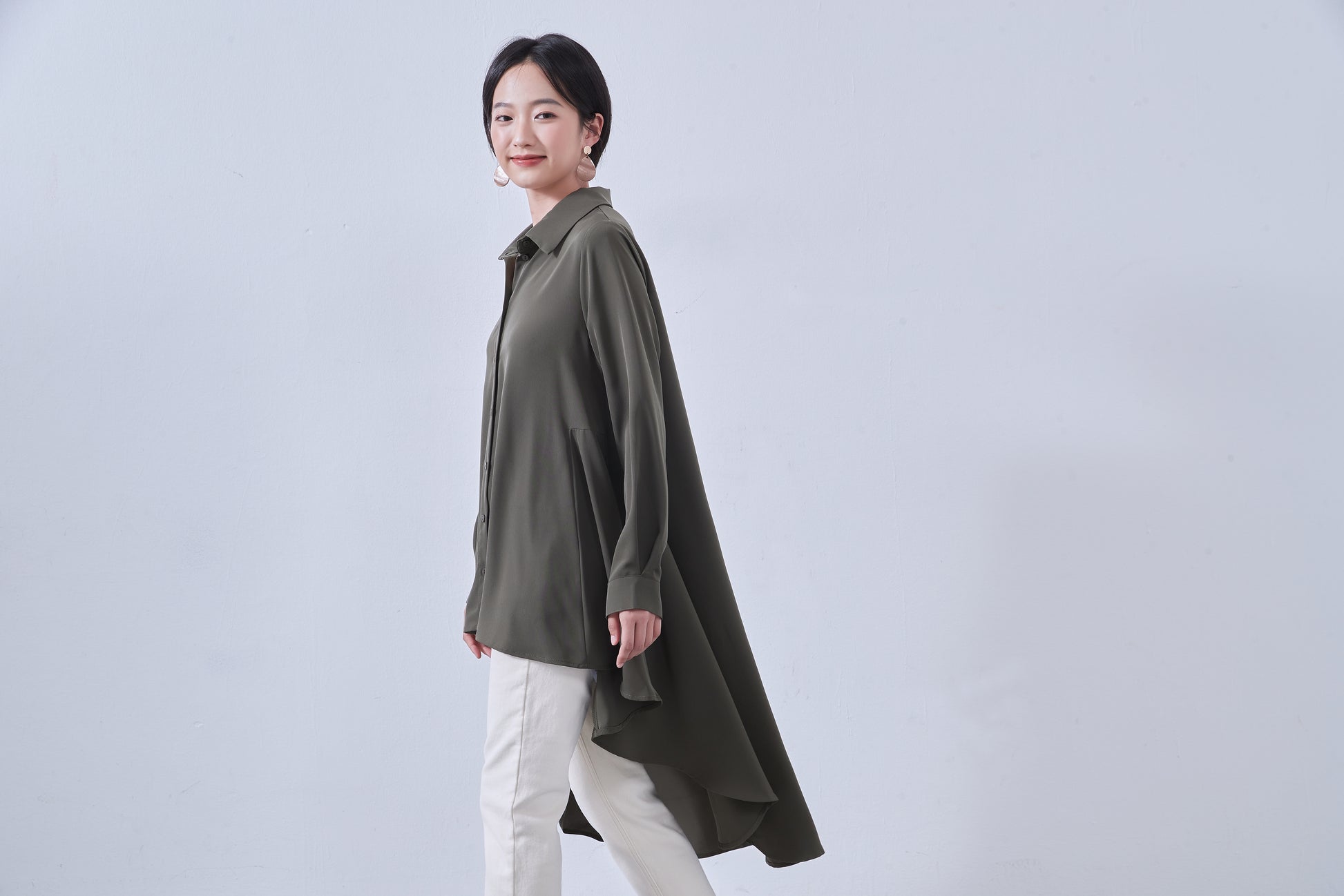 The elegant back flare long blouse is a dramatic long blouse with a curved hem that sways randomly. Its bold design and unique front and back lengths make it a striking piece that will make an impact. The front of the shirt has a classic silhouette, and the flare design that gently spreads out towards the back creates a style with a random swaying movement. This unique design brings out a charm that you won't find in ordinary shirts.