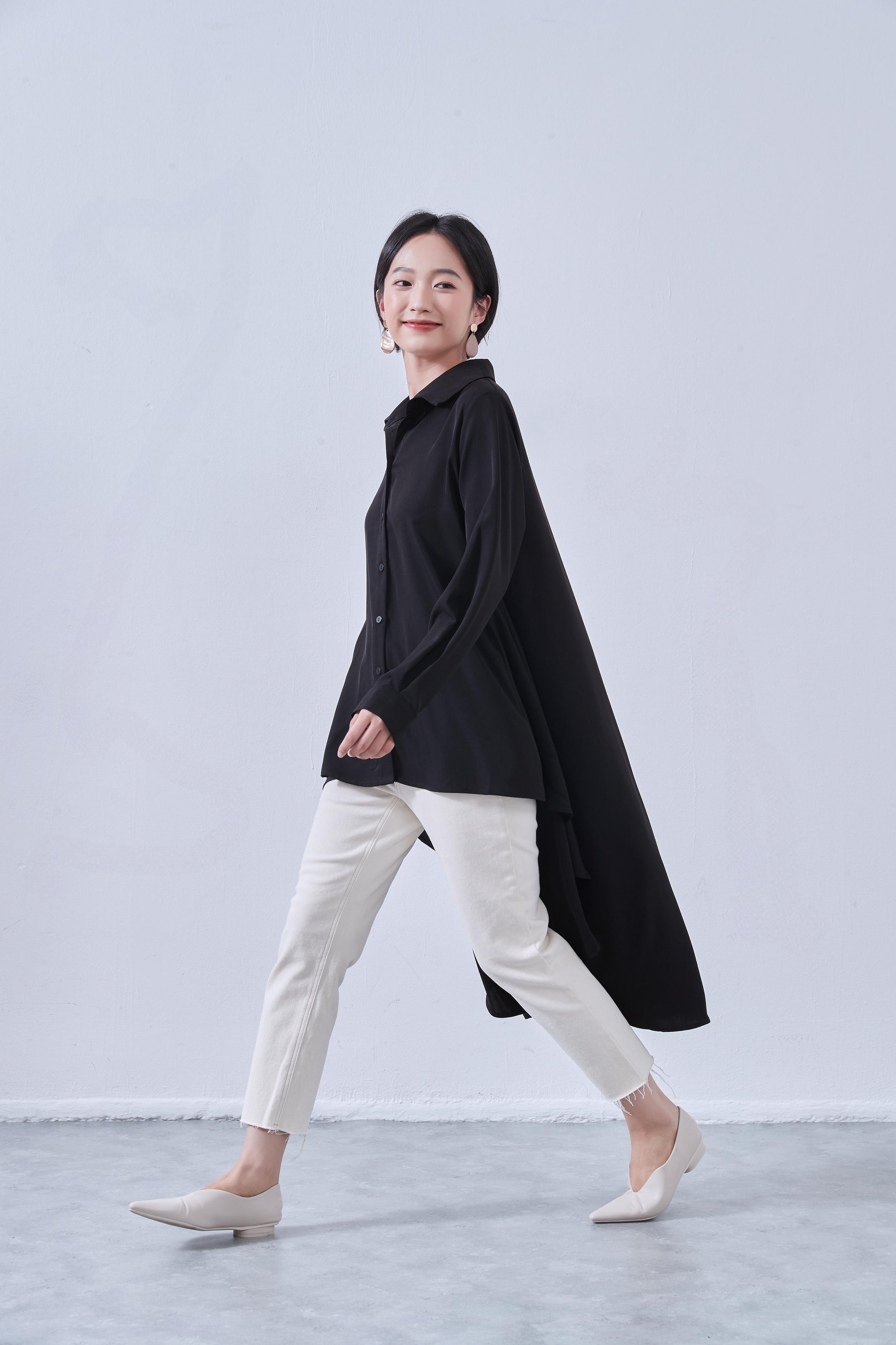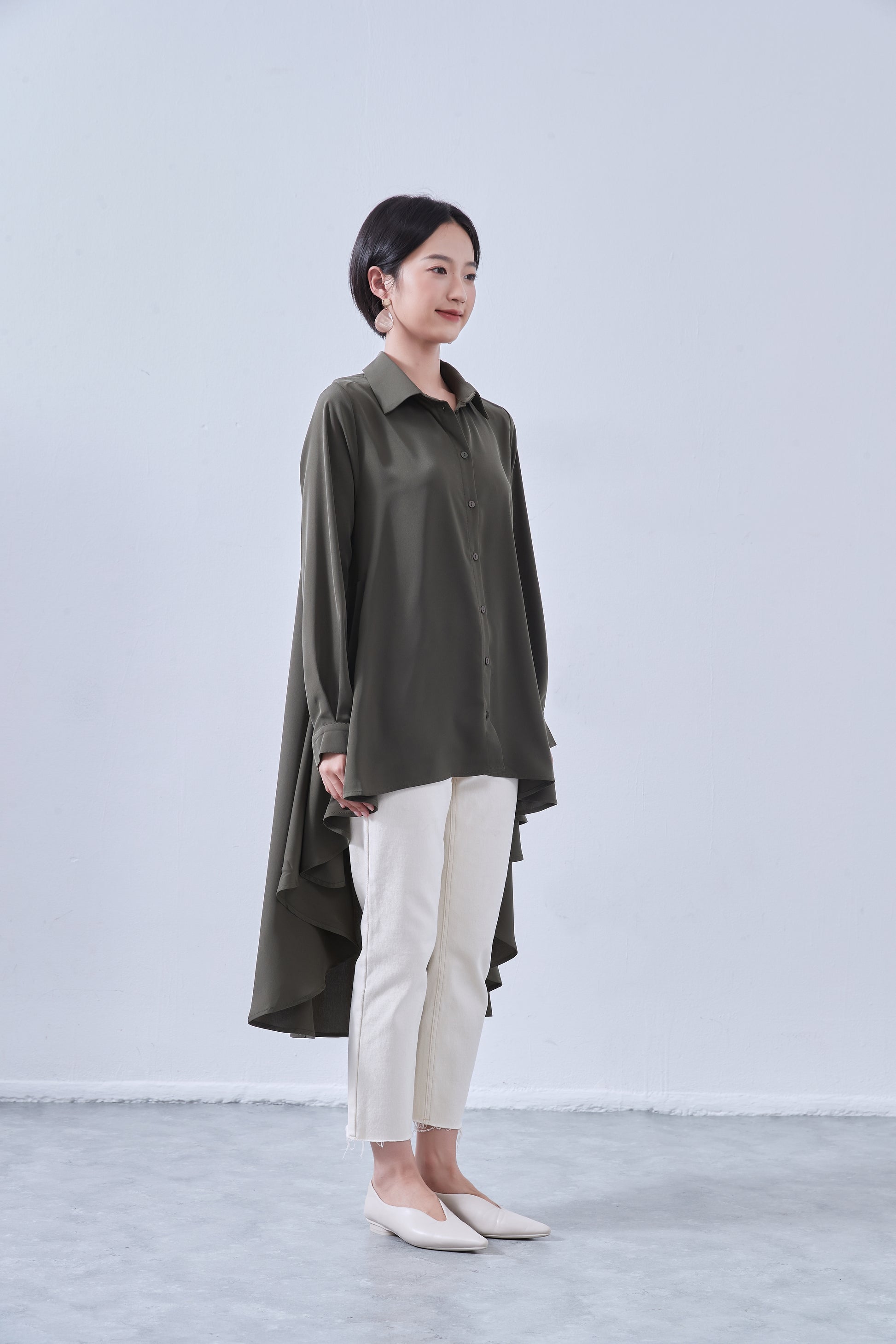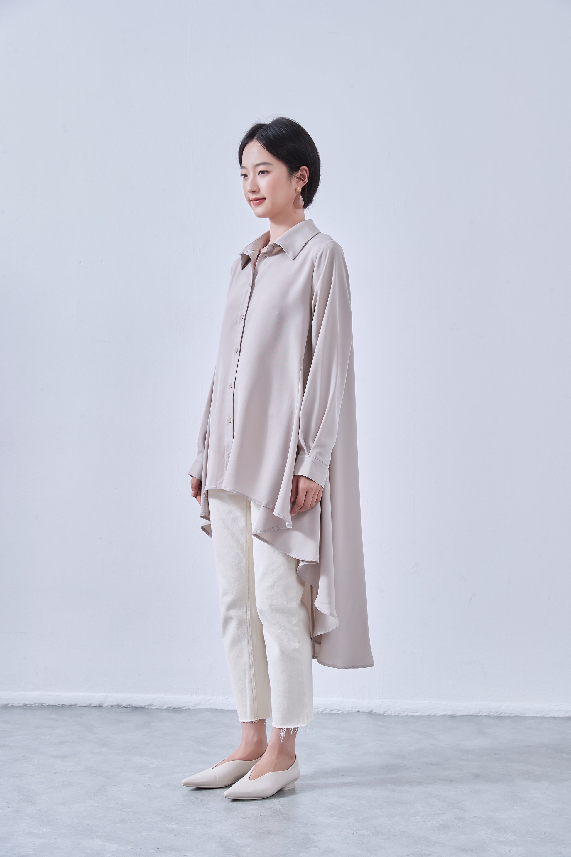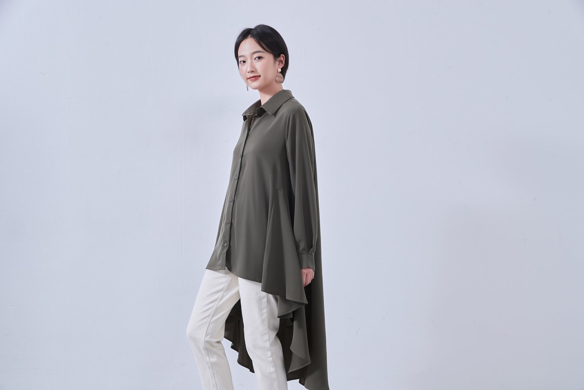 The elegant back flare long blouse is a dramatic long blouse with a curved hem that sways randomly. Its bold design and unique front and back lengths make it a striking piece that will make an impact. The front of the shirt has a classic silhouette, and the flare design that gently spreads out towards the back creates a style with a random swaying movement. This unique design brings out a charm that you won't find in ordinary shirts.