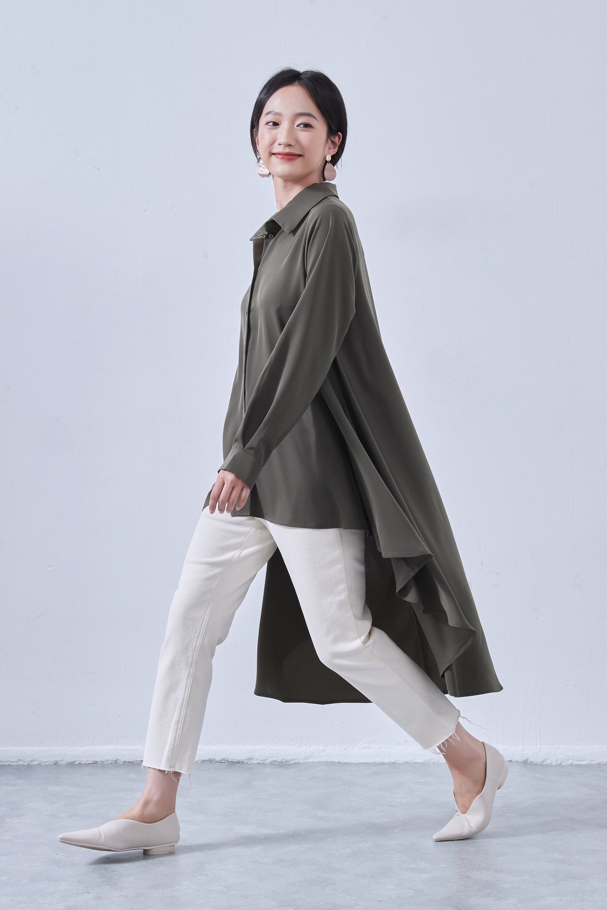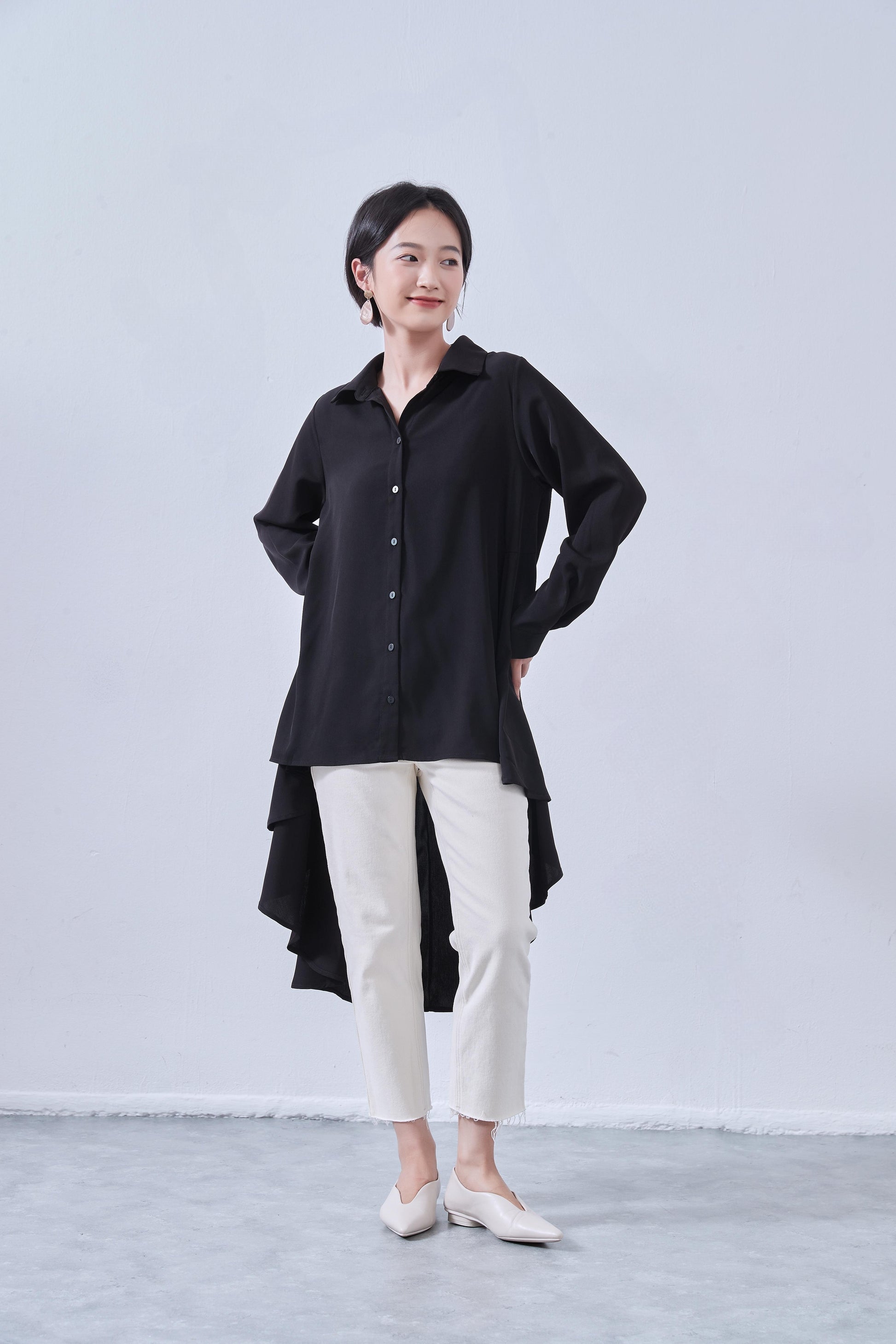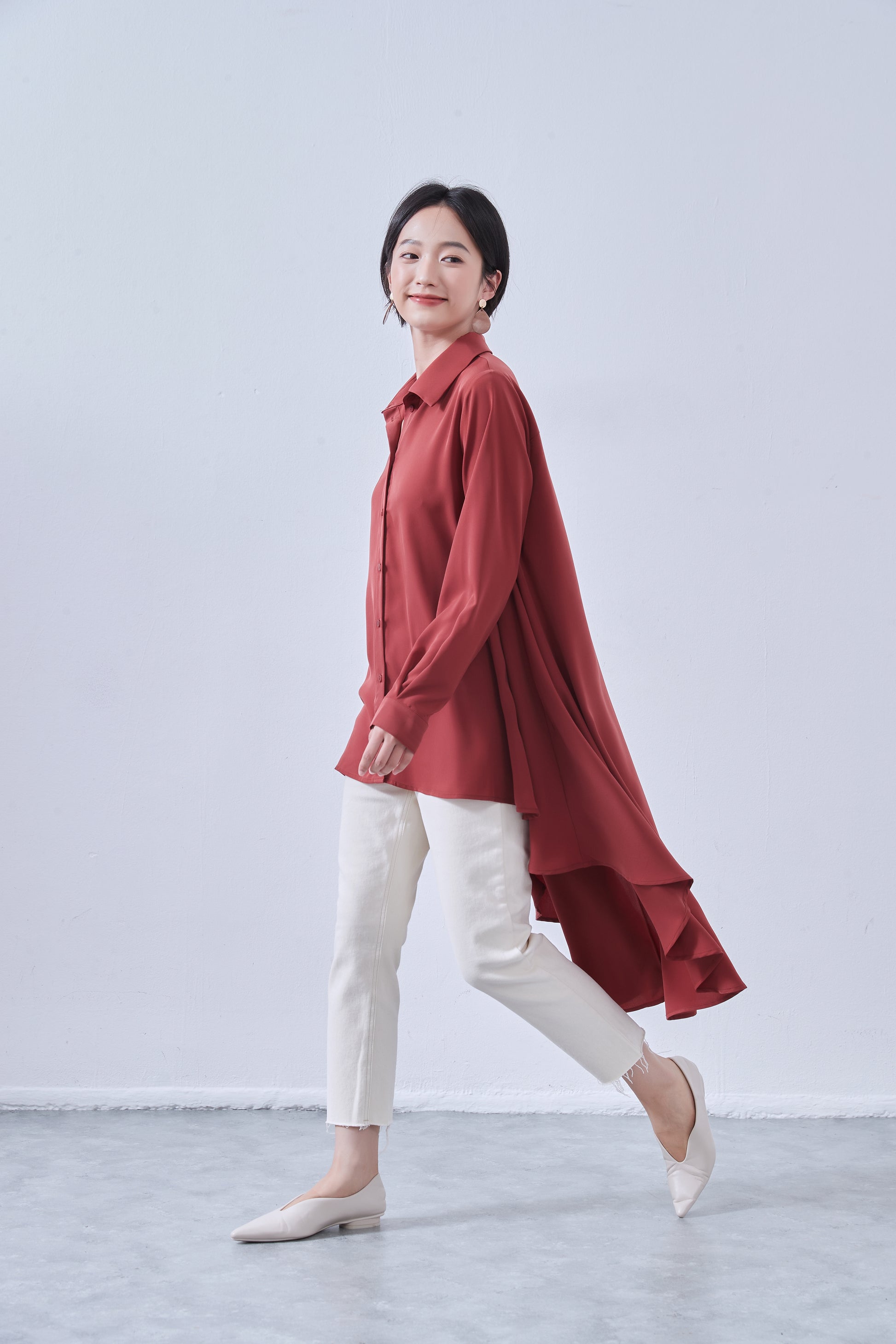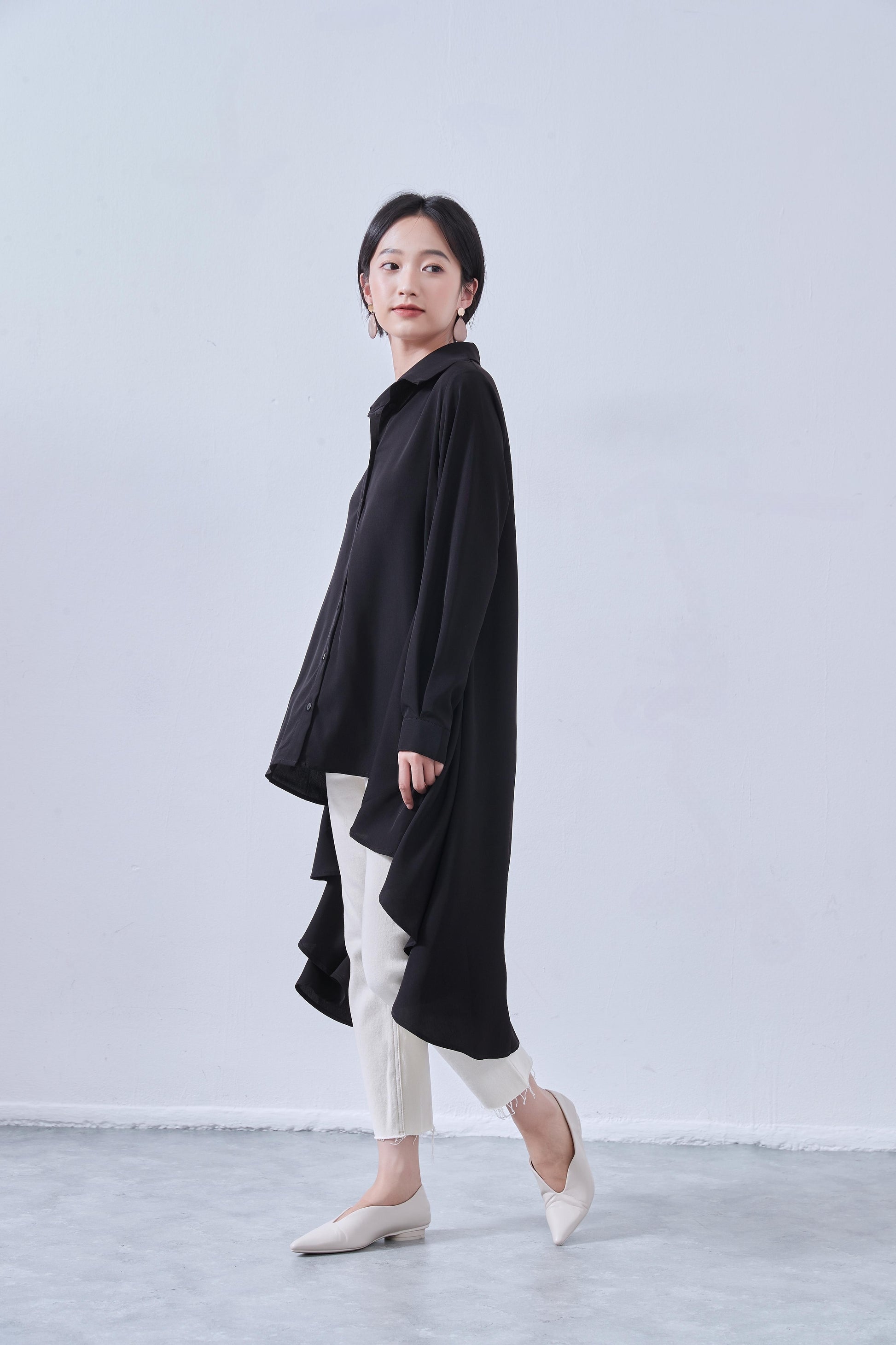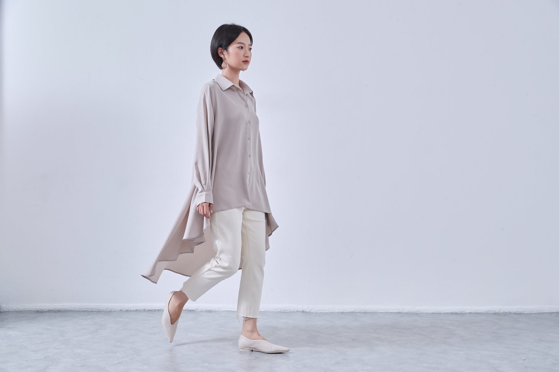 The elegant back flare long blouse is a dramatic long blouse with a curved hem that sways randomly. Its bold design and unique front and back lengths make it a striking piece that will make an impact. The front of the shirt has a classic silhouette, and the flare design that gently spreads out towards the back creates a style with a random swaying movement. This unique design brings out a charm that you won't find in ordinary shirts.