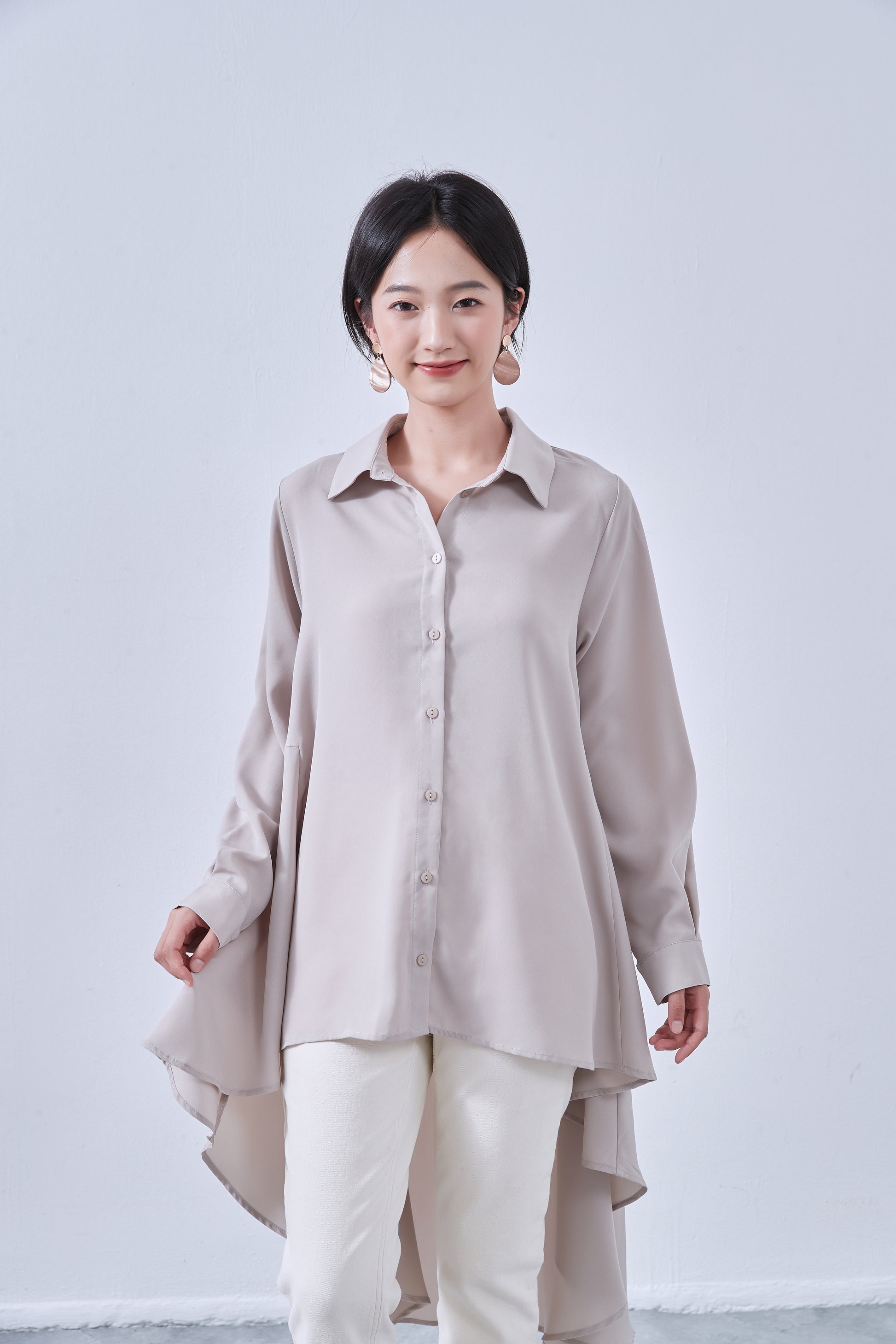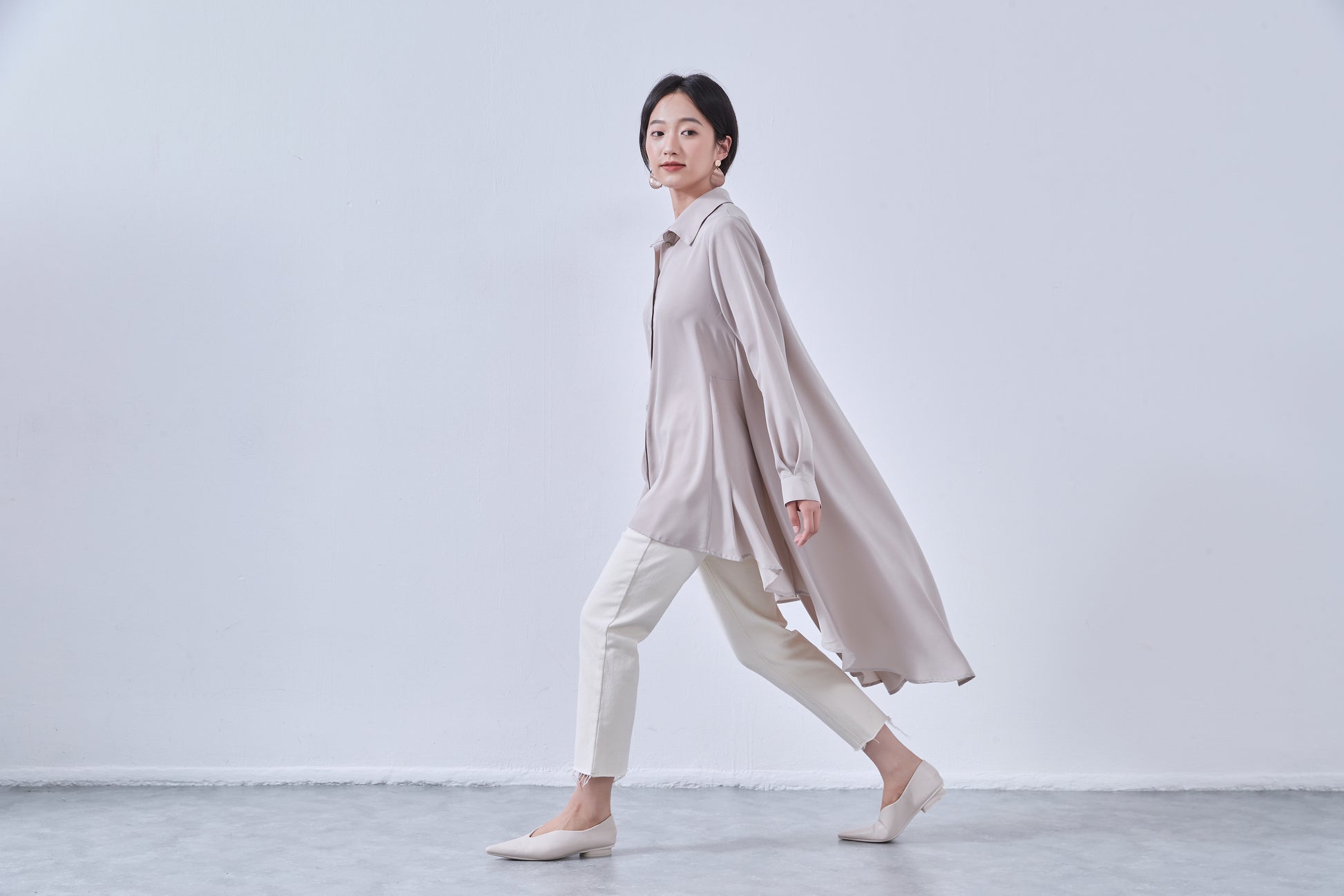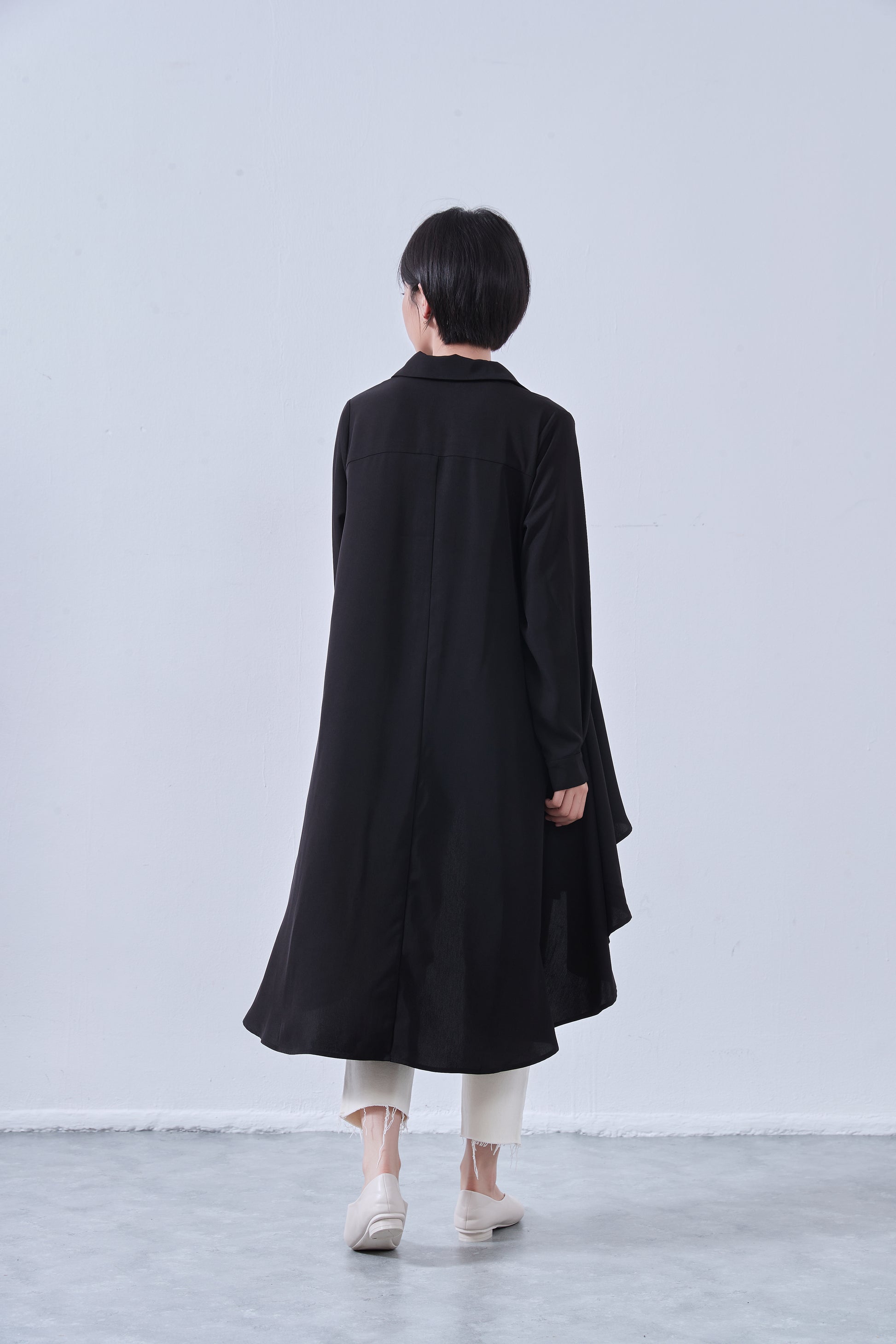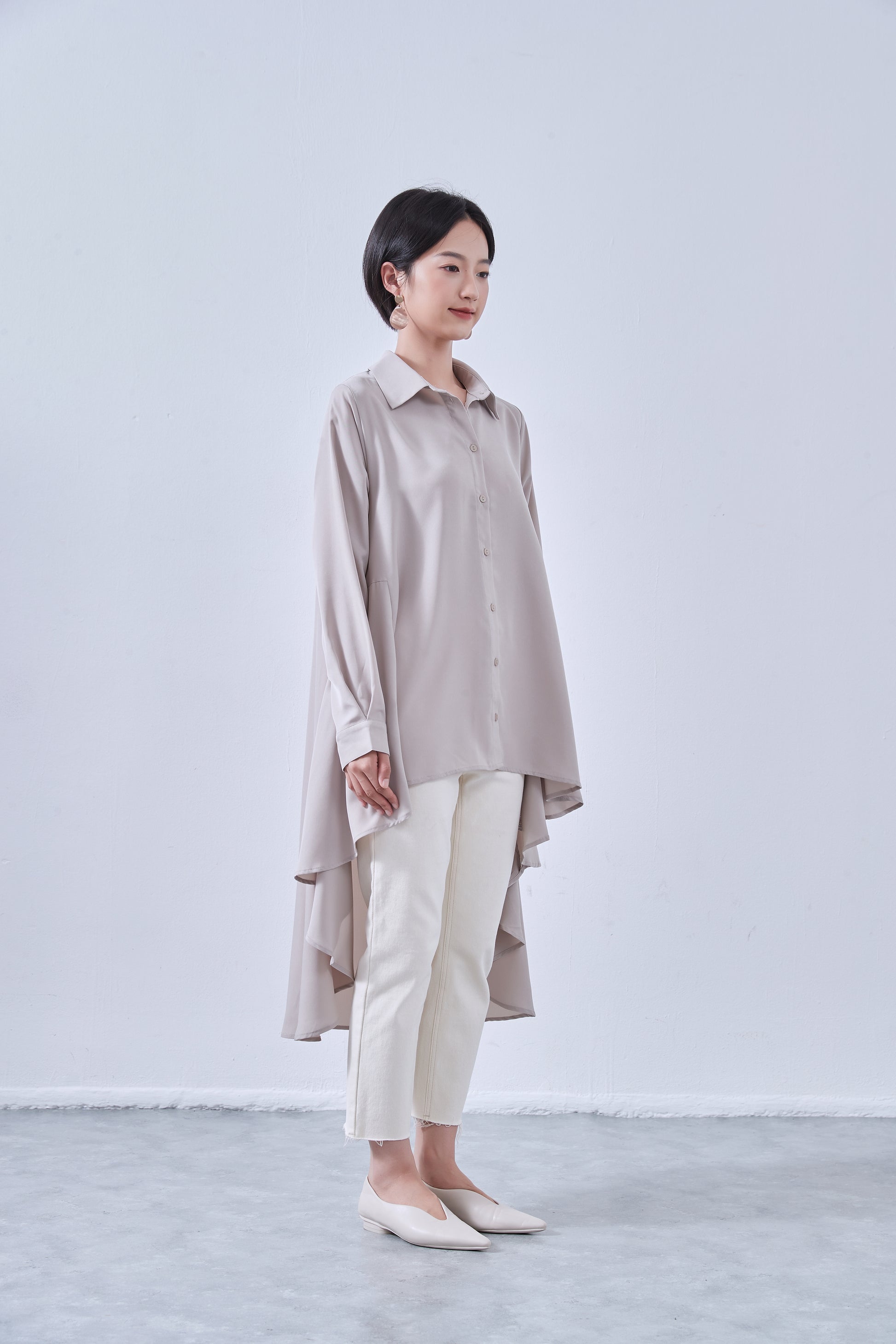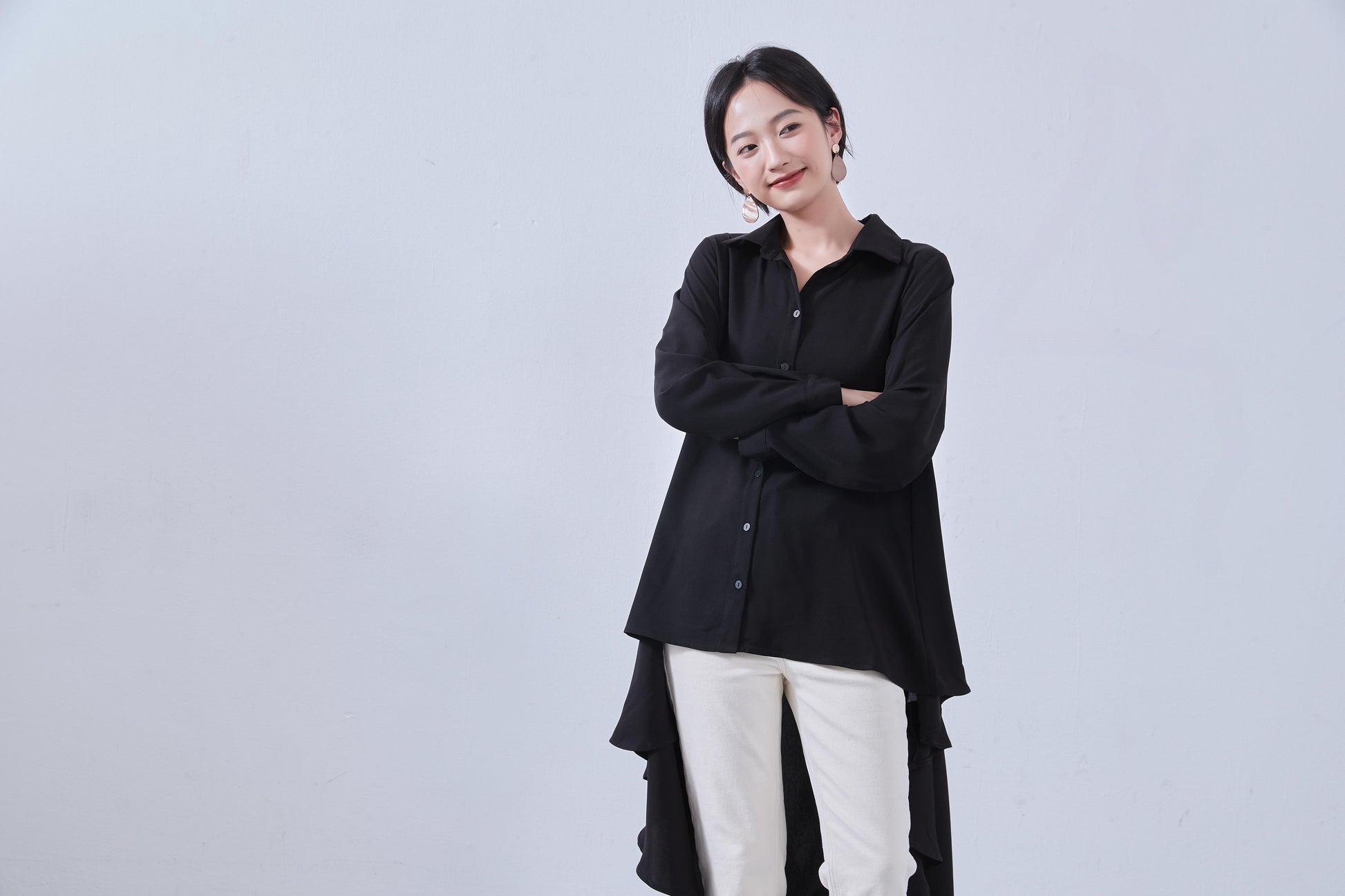 The elegant back flare long blouse is a dramatic long blouse with a curved hem that sways randomly. Its bold design and unique front and back lengths make it a striking piece that will make an impact. The front of the shirt has a classic silhouette, and the flare design that gently spreads out towards the back creates a style with a random swaying movement. This unique design brings out a charm that you won't find in ordinary shirts.