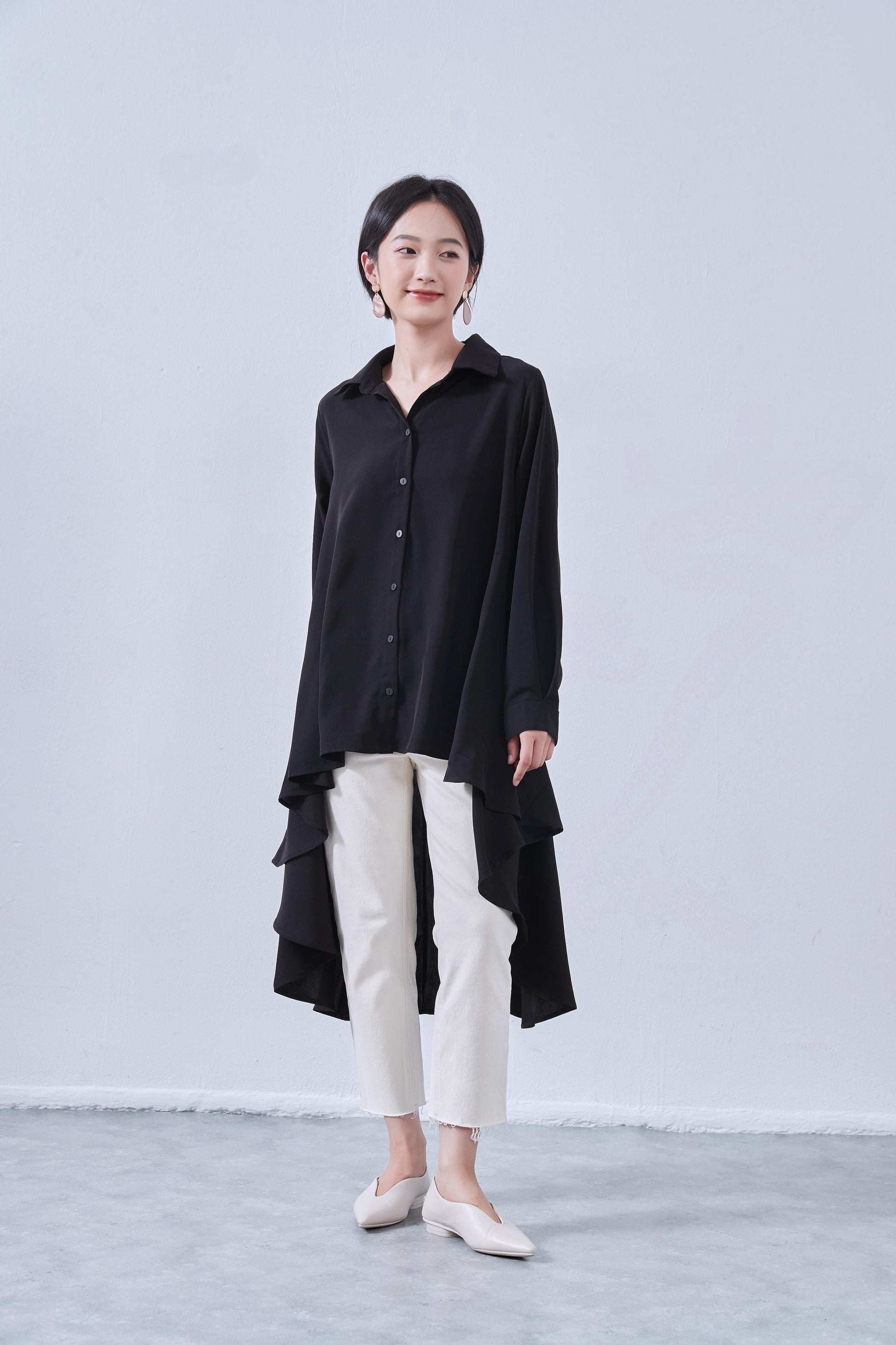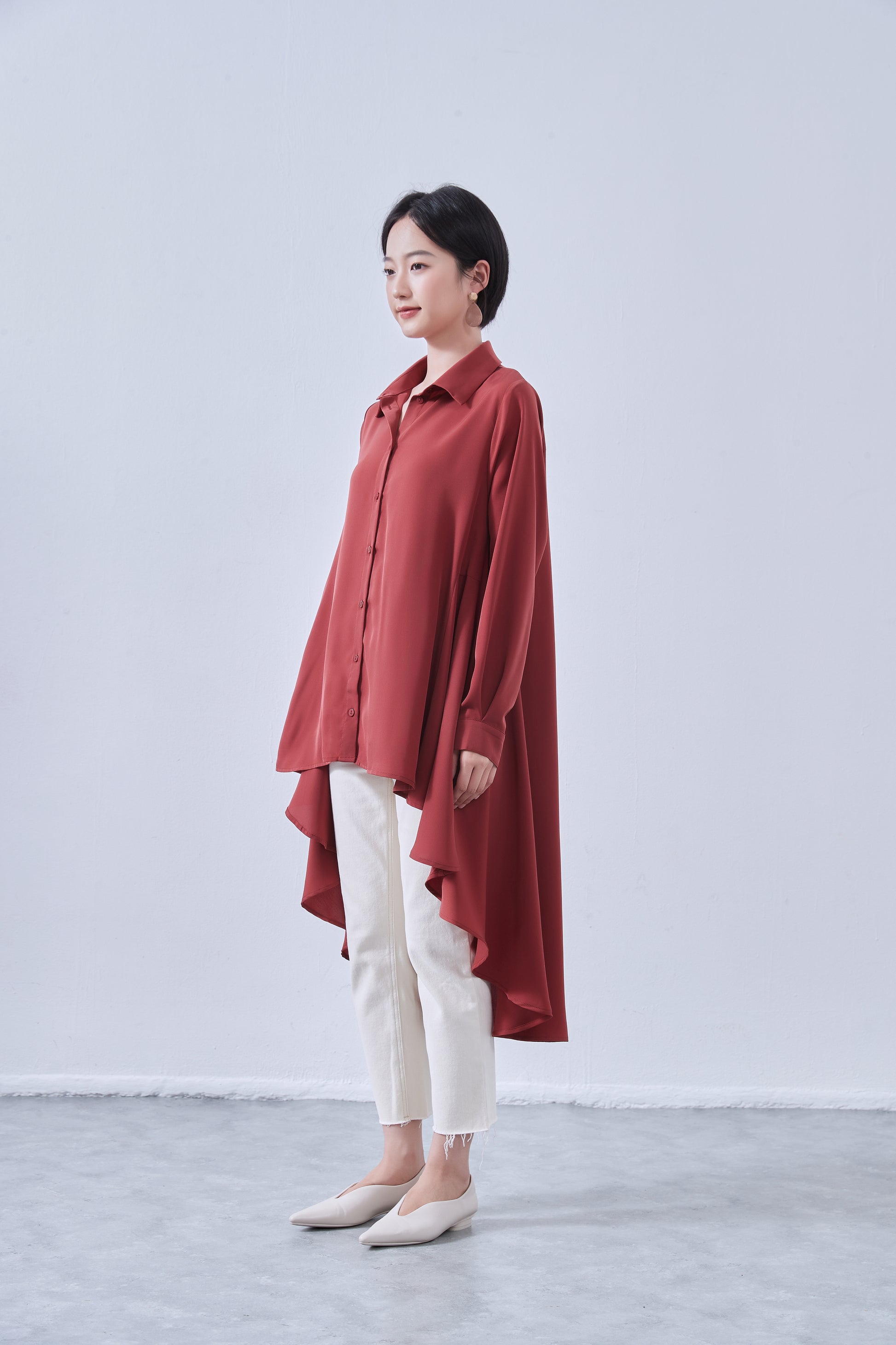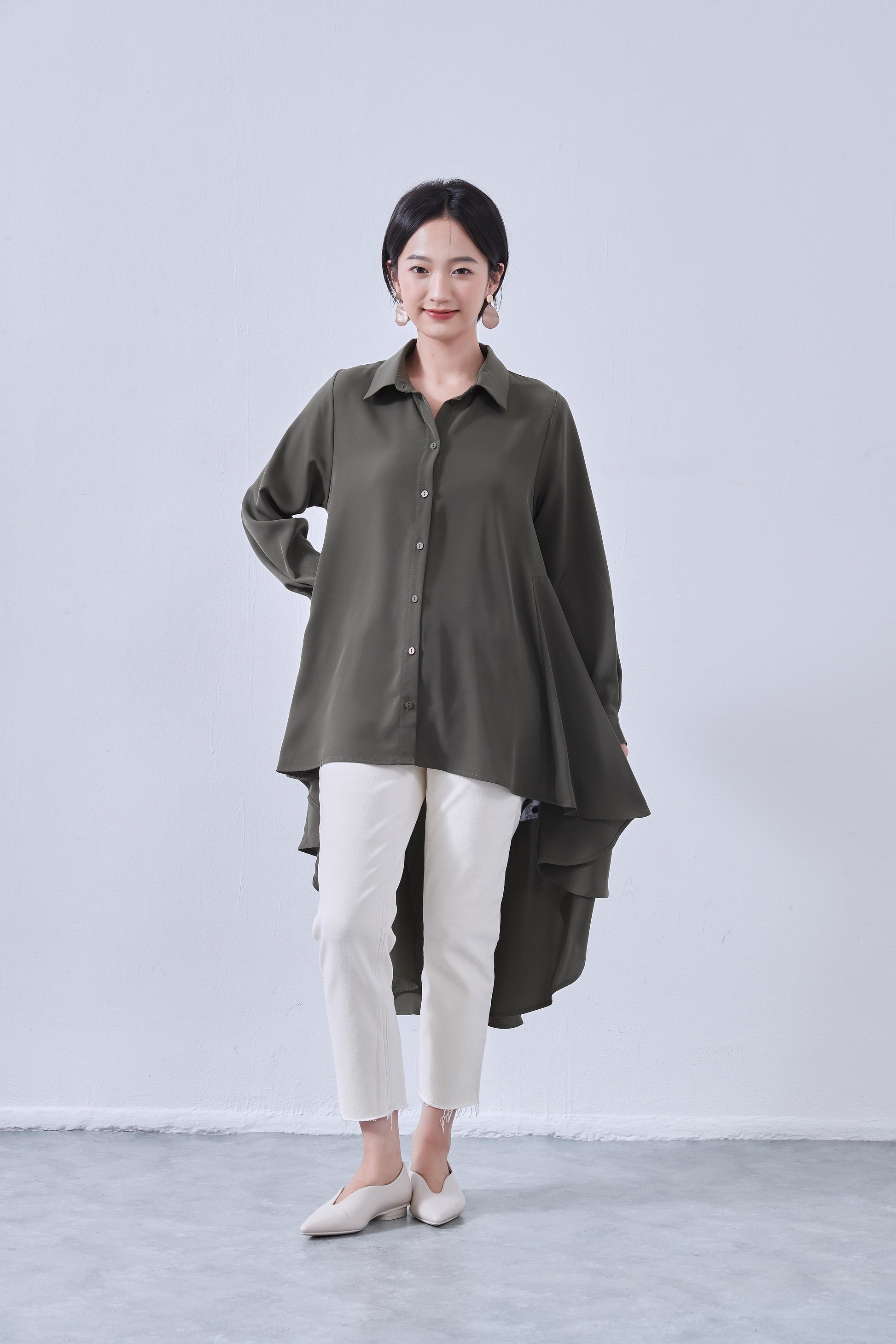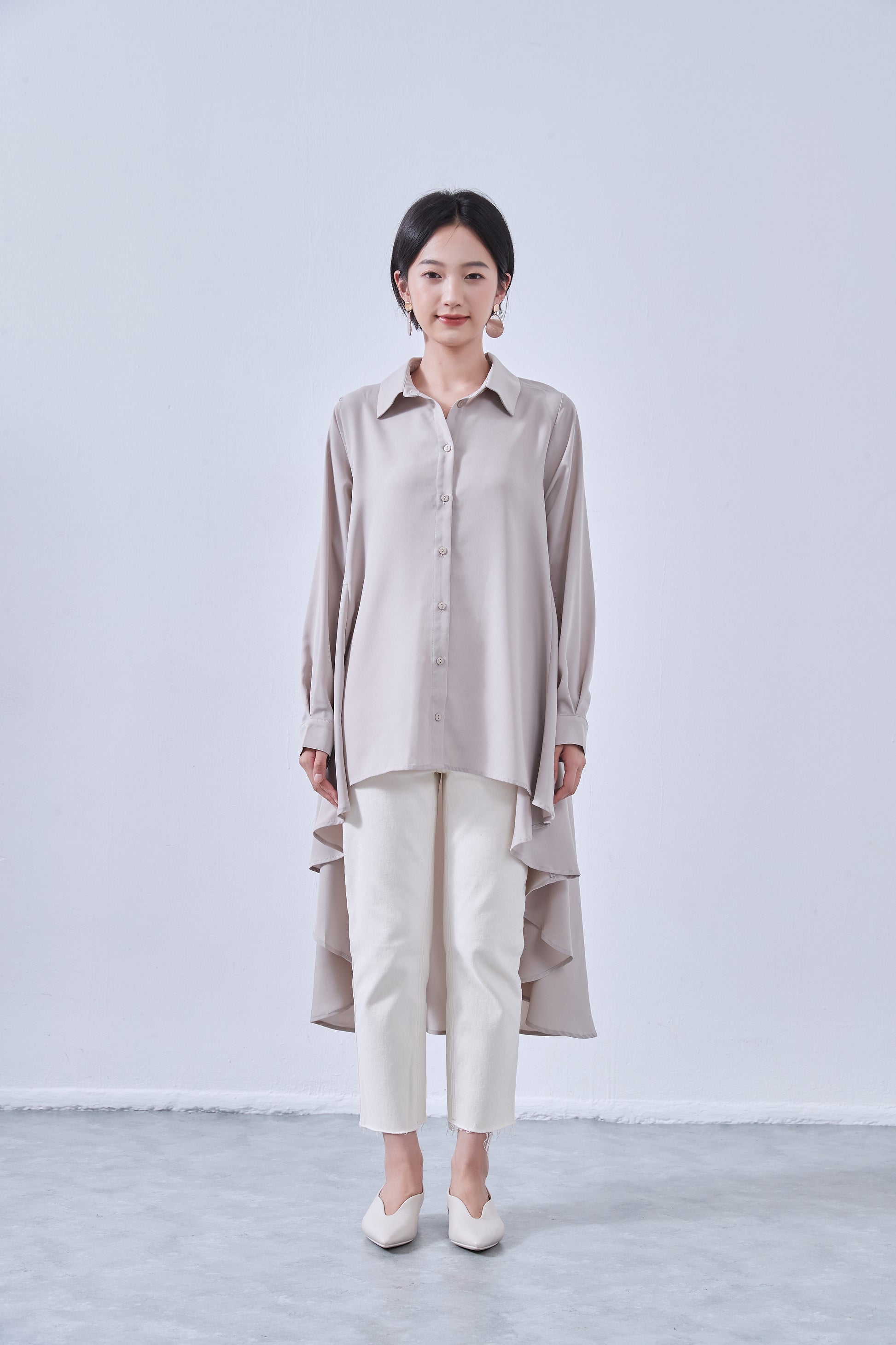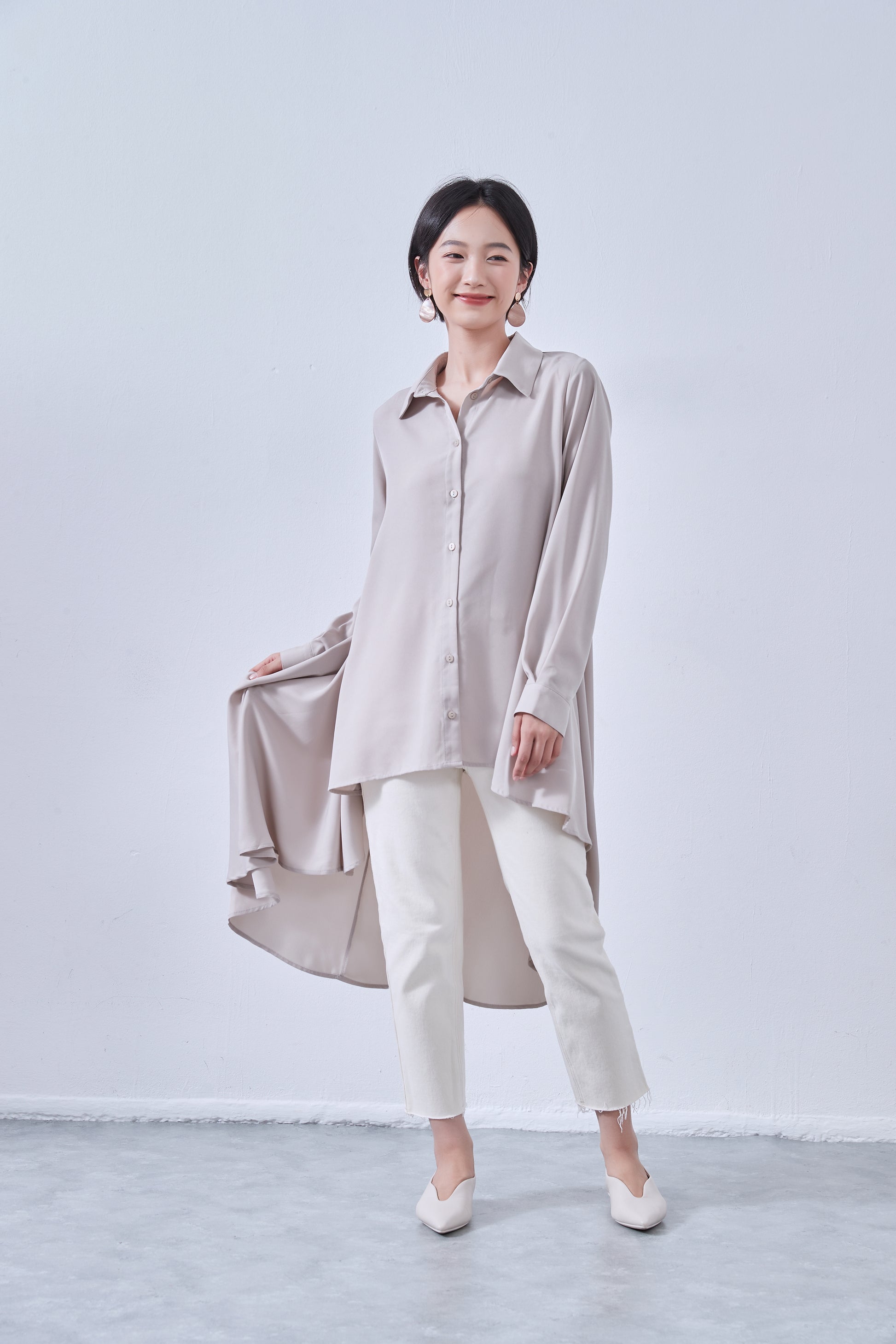 The elegant back flare long blouse is a dramatic long blouse with a curved hem that sways randomly. Its bold design and unique front and back lengths make it a striking piece that will make an impact. The front of the shirt has a classic silhouette, and the flare design that gently spreads out towards the back creates a style with a random swaying movement. This unique design brings out a charm that you won't find in ordinary shirts.