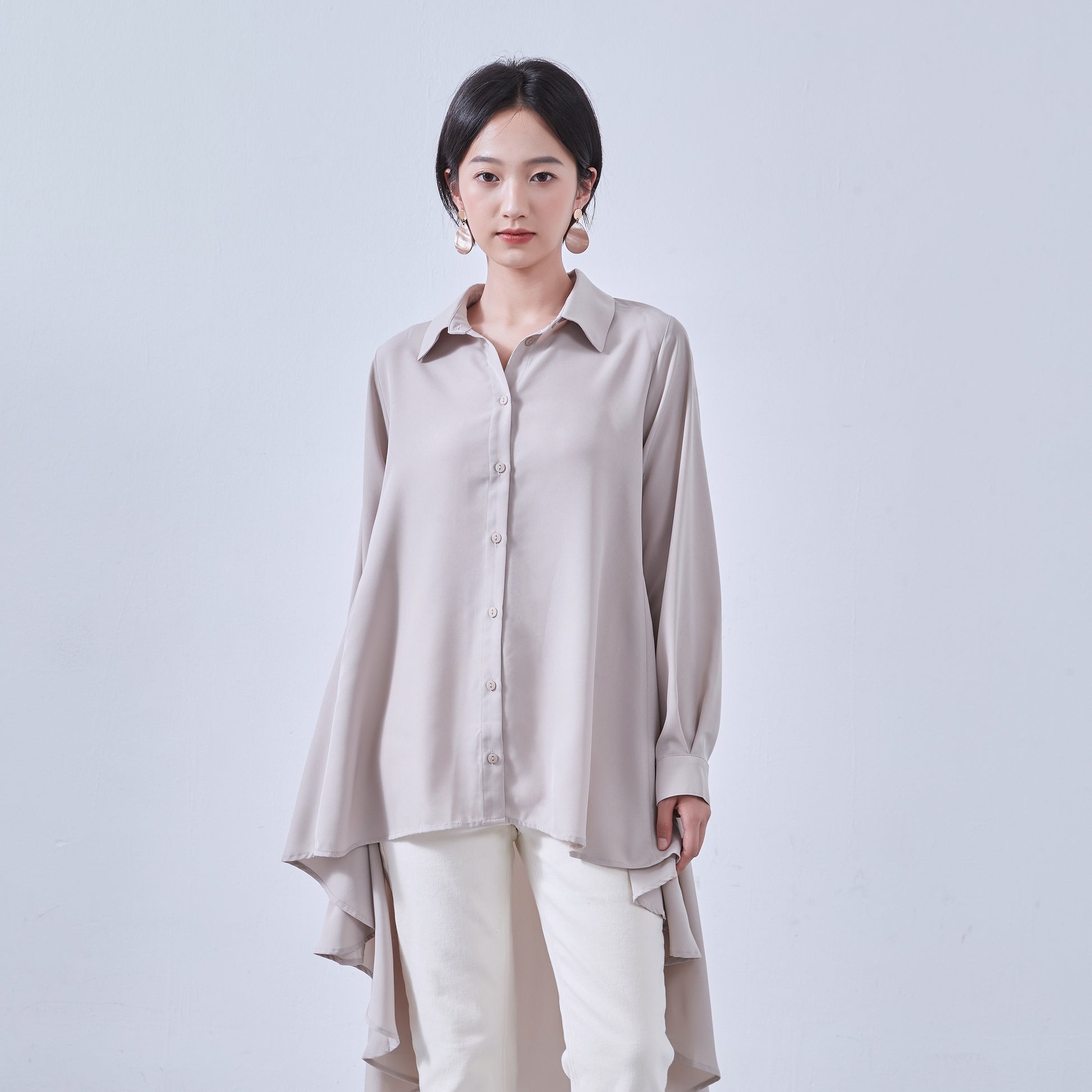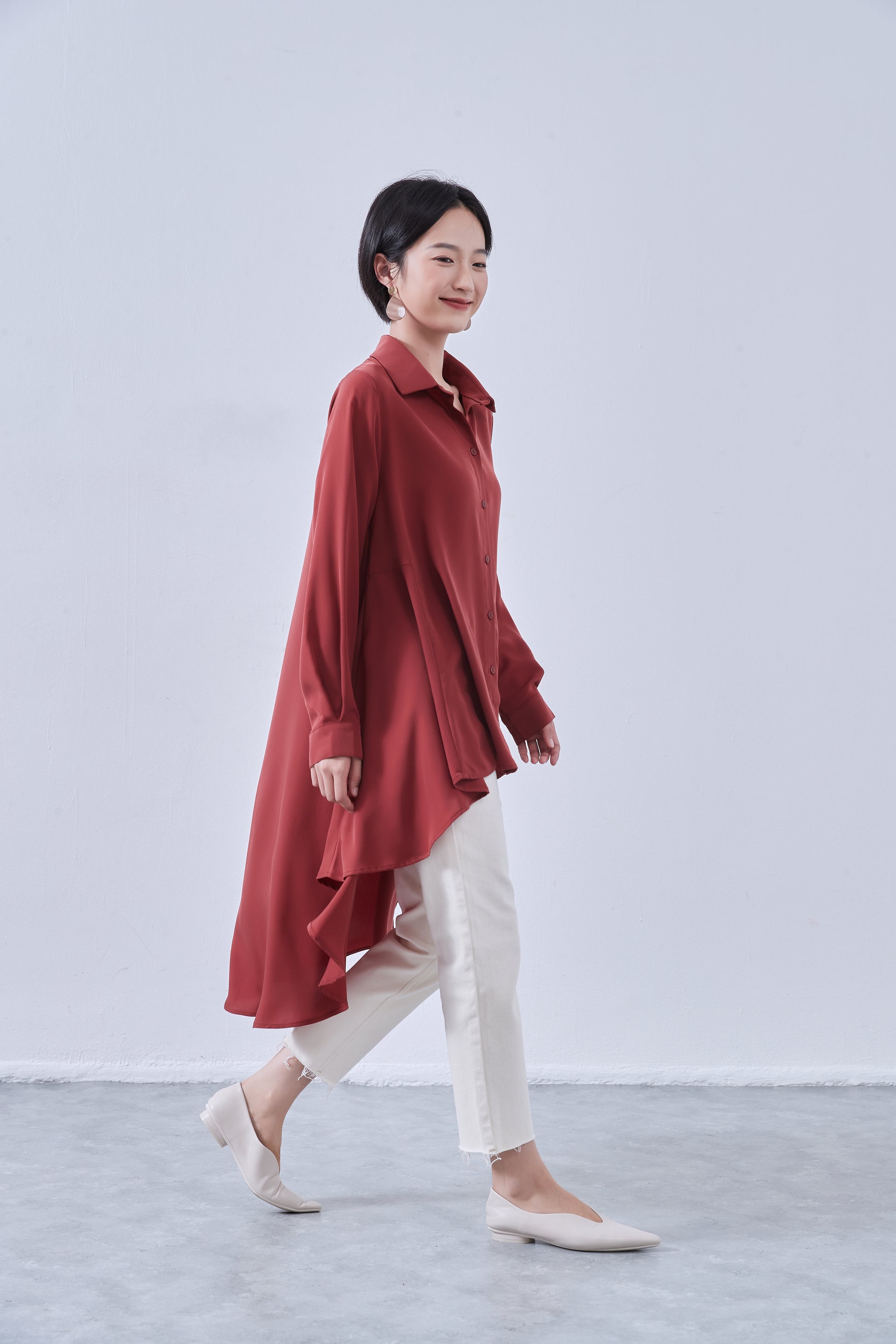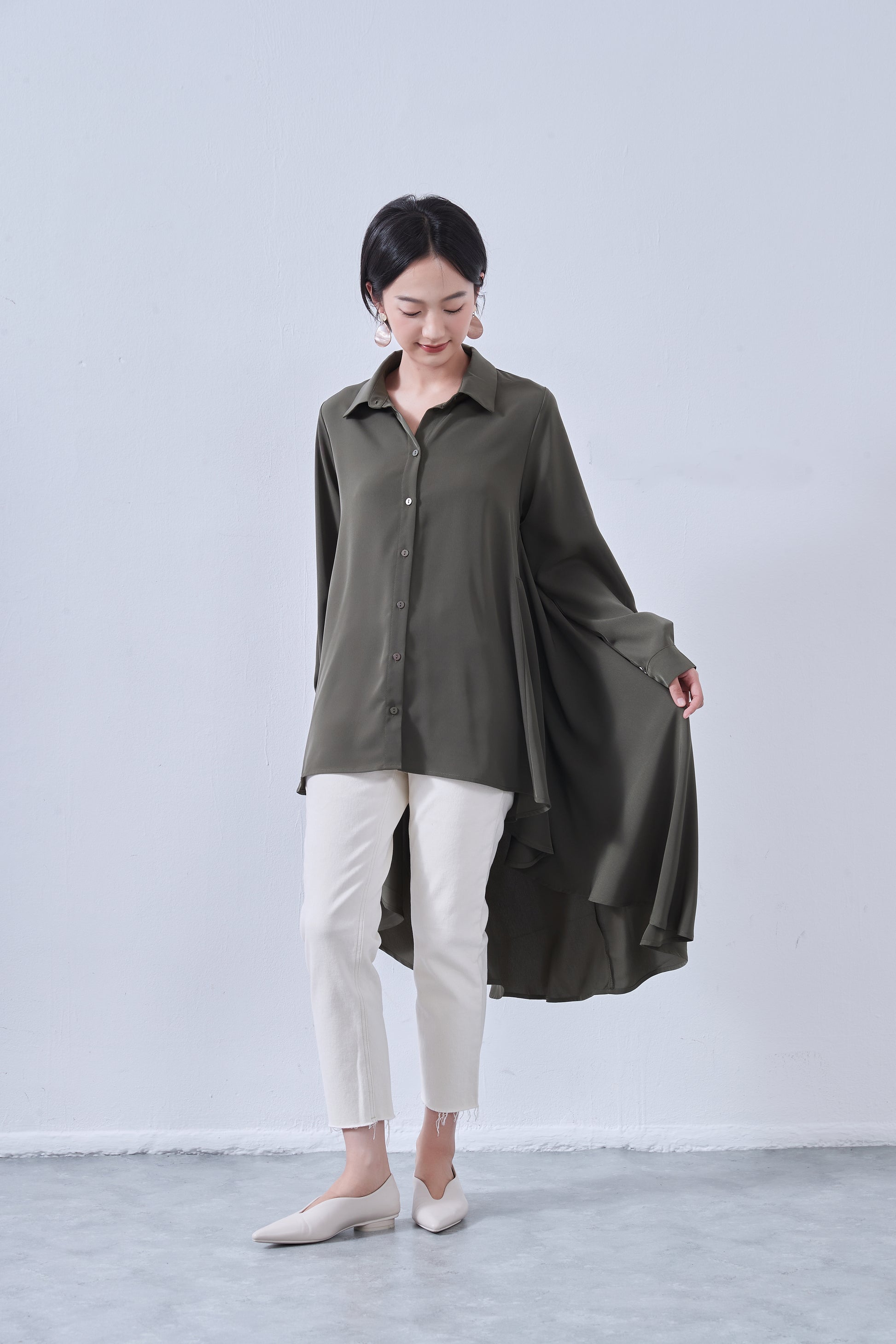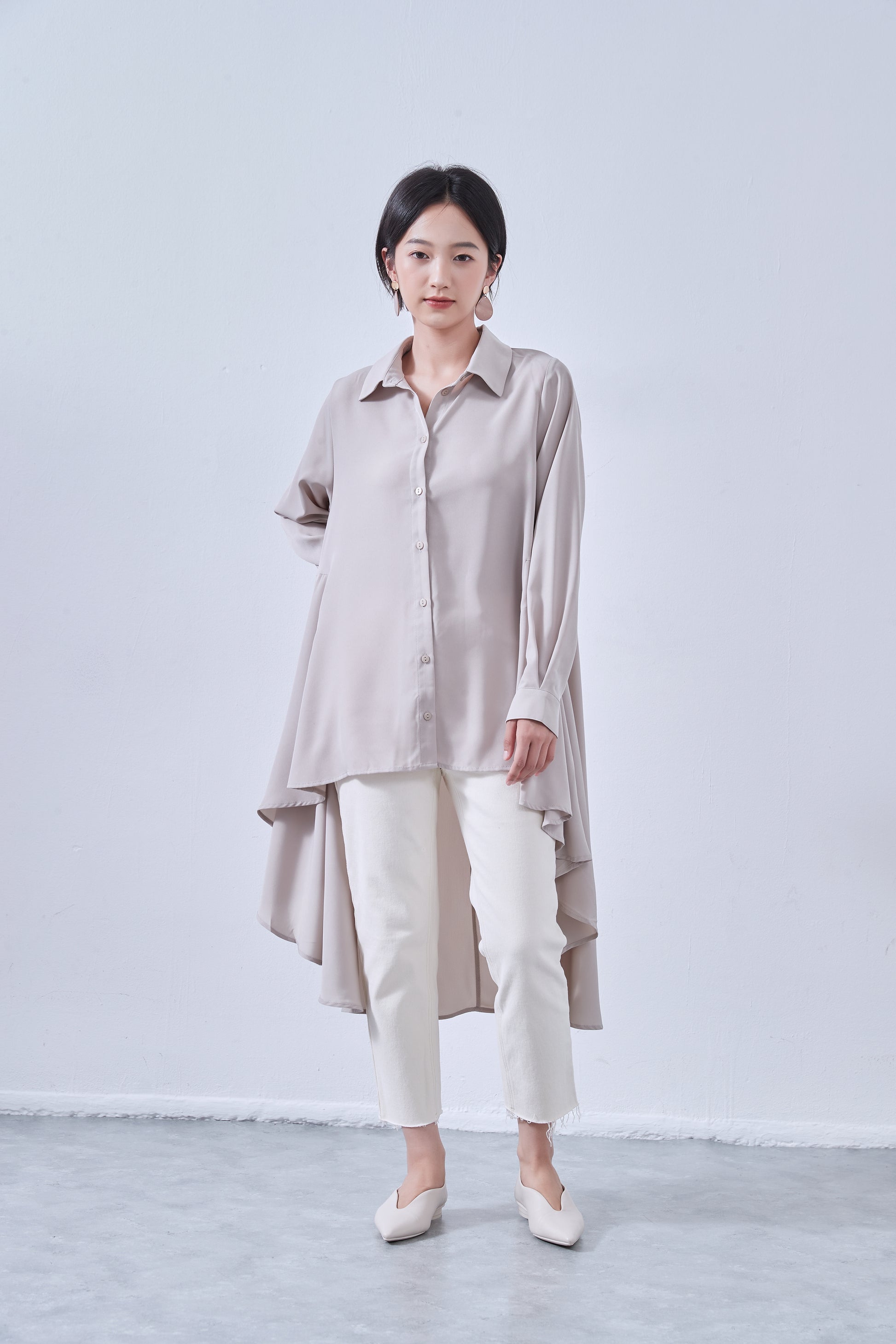 The elegant back flare long blouse is a dramatic long blouse with a curved hem that sways randomly. Its bold design and unique front and back lengths make it a striking piece that will make an impact. The front of the shirt has a classic silhouette, and the flare design that gently spreads out towards the back creates a style with a random swaying movement. This unique design brings out a charm that you won't find in ordinary shirts.