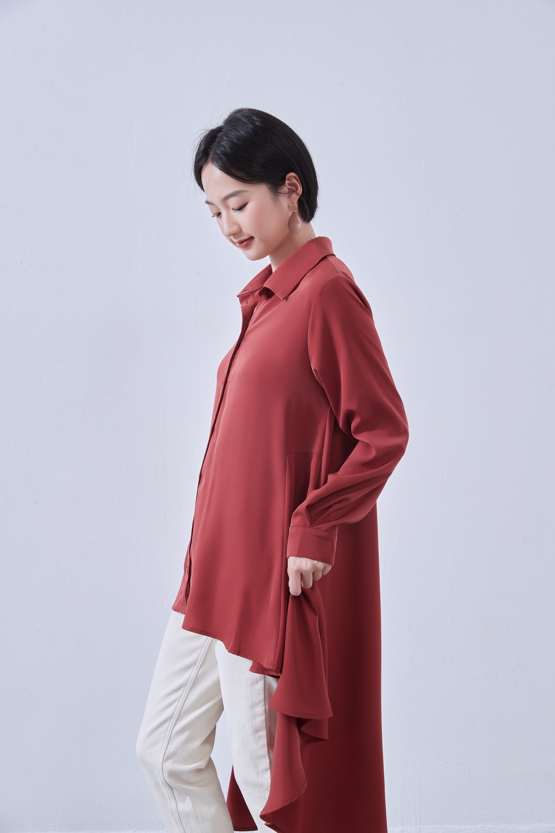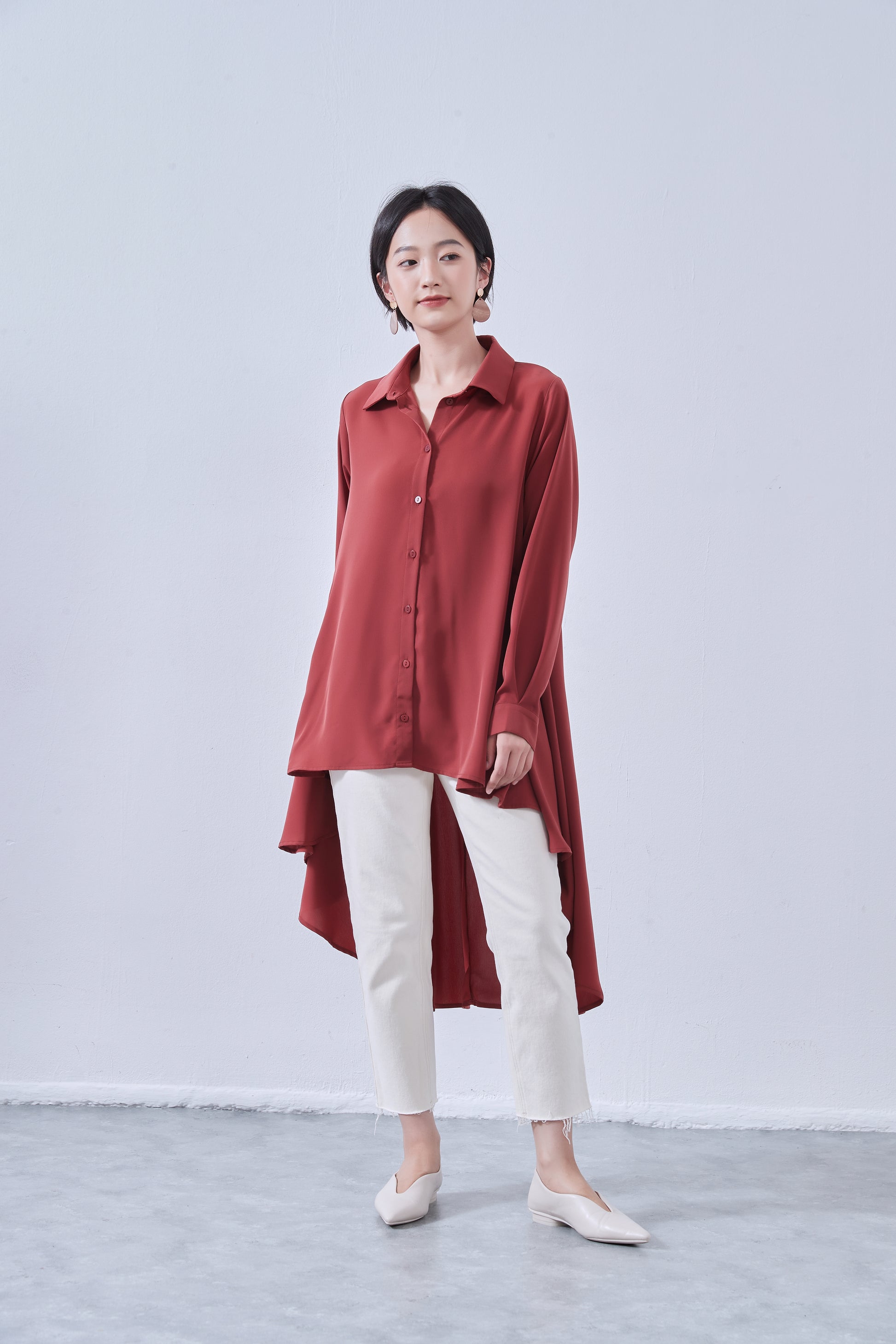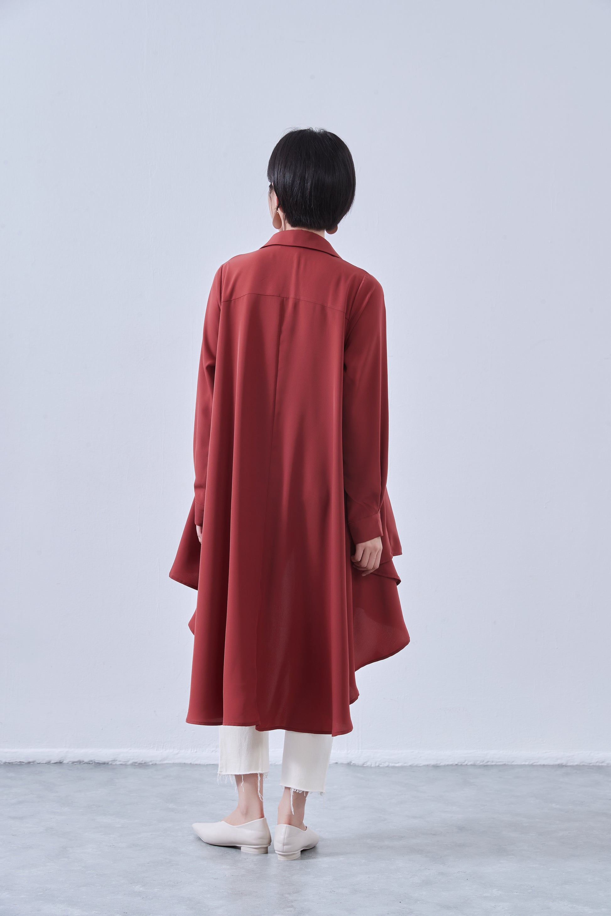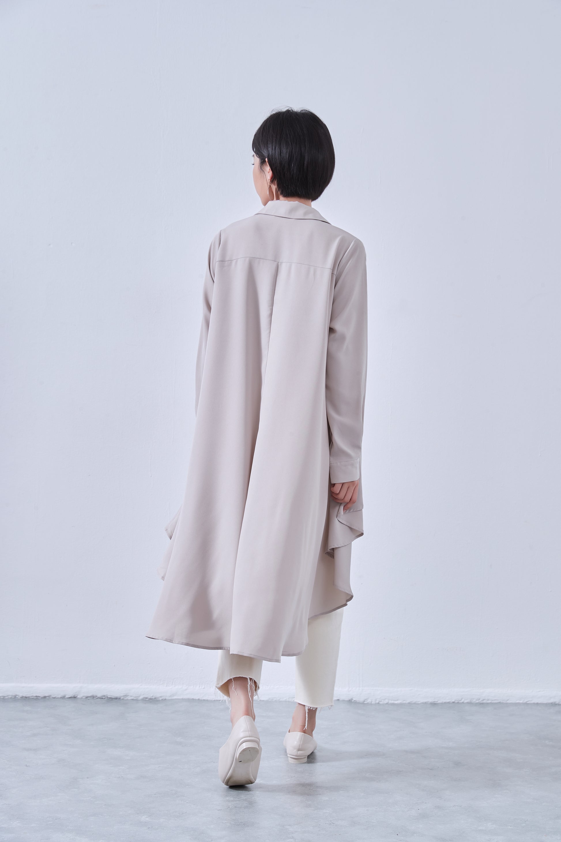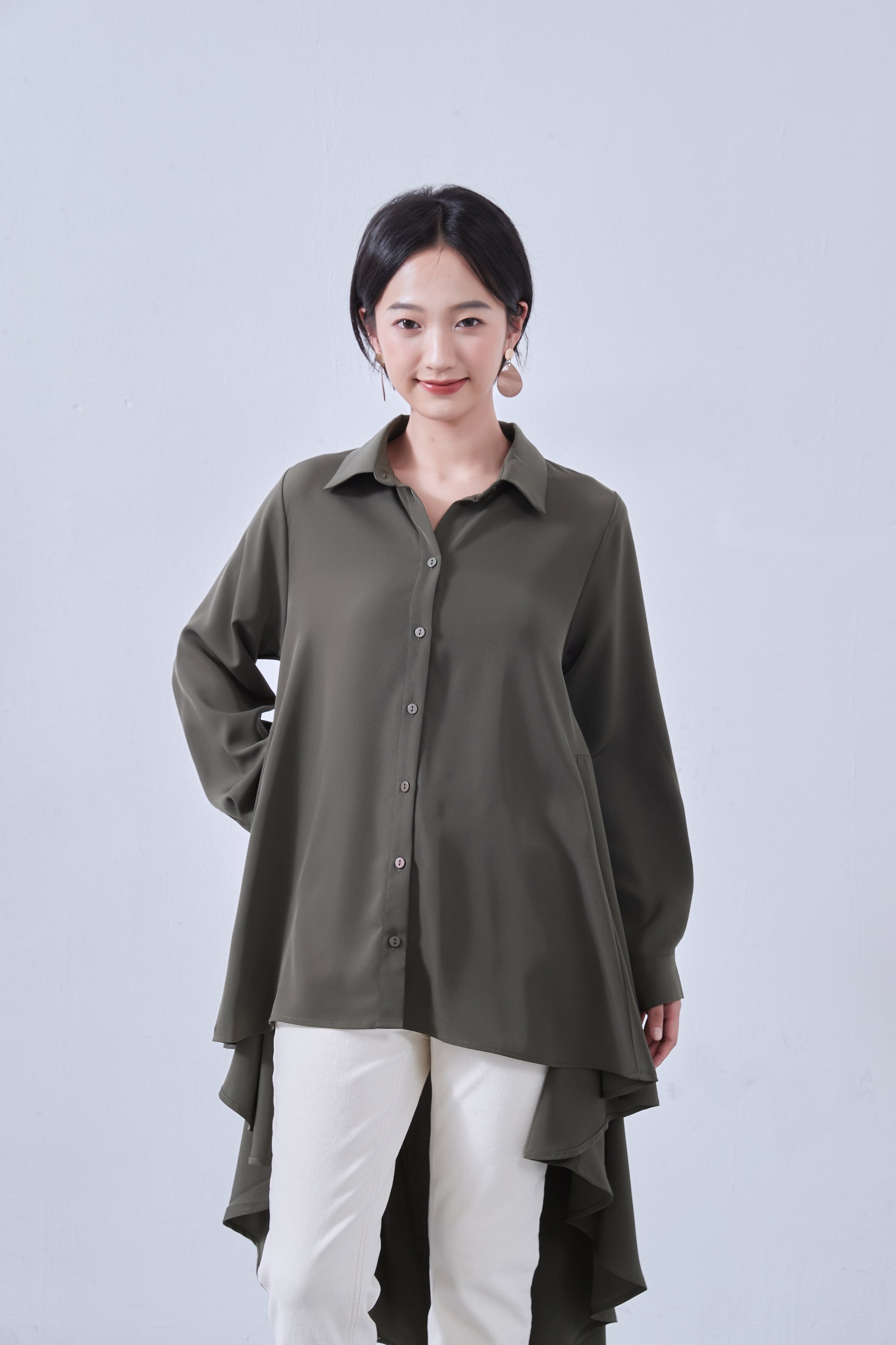 The elegant back flare long blouse is a dramatic long blouse with a curved hem that sways randomly. Its bold design and unique front and back lengths make it a striking piece that will make an impact. The front of the shirt has a classic silhouette, and the flare design that gently spreads out towards the back creates a style with a random swaying movement. This unique design brings out a charm that you won't find in ordinary shirts.