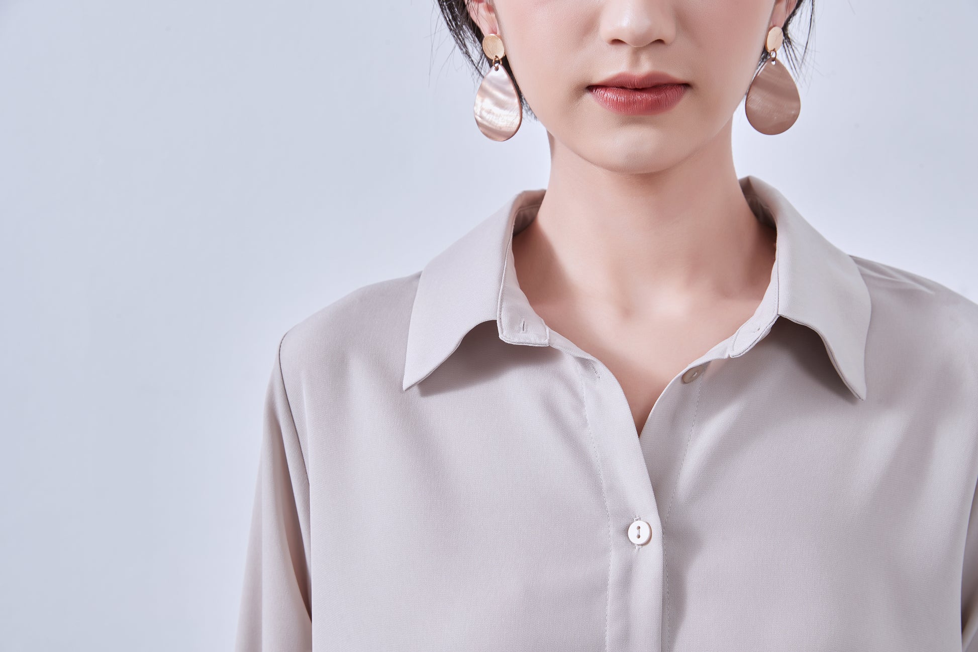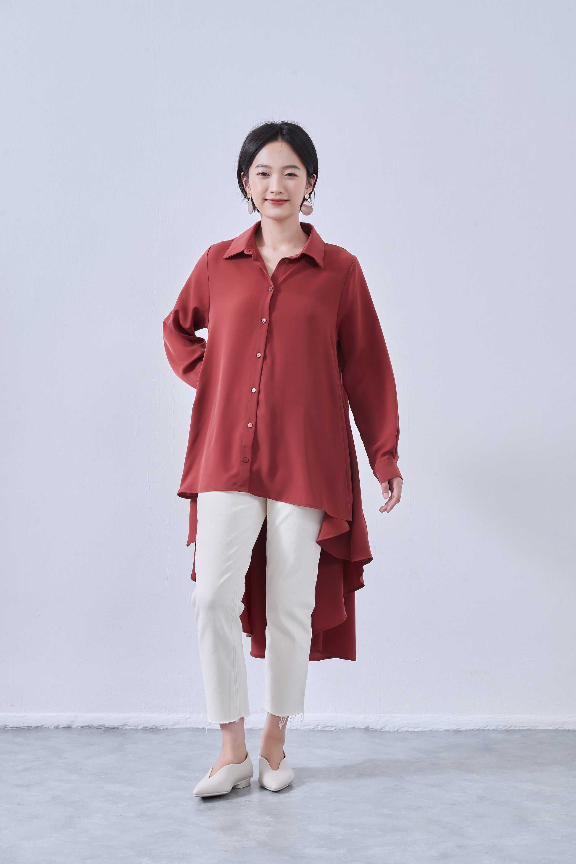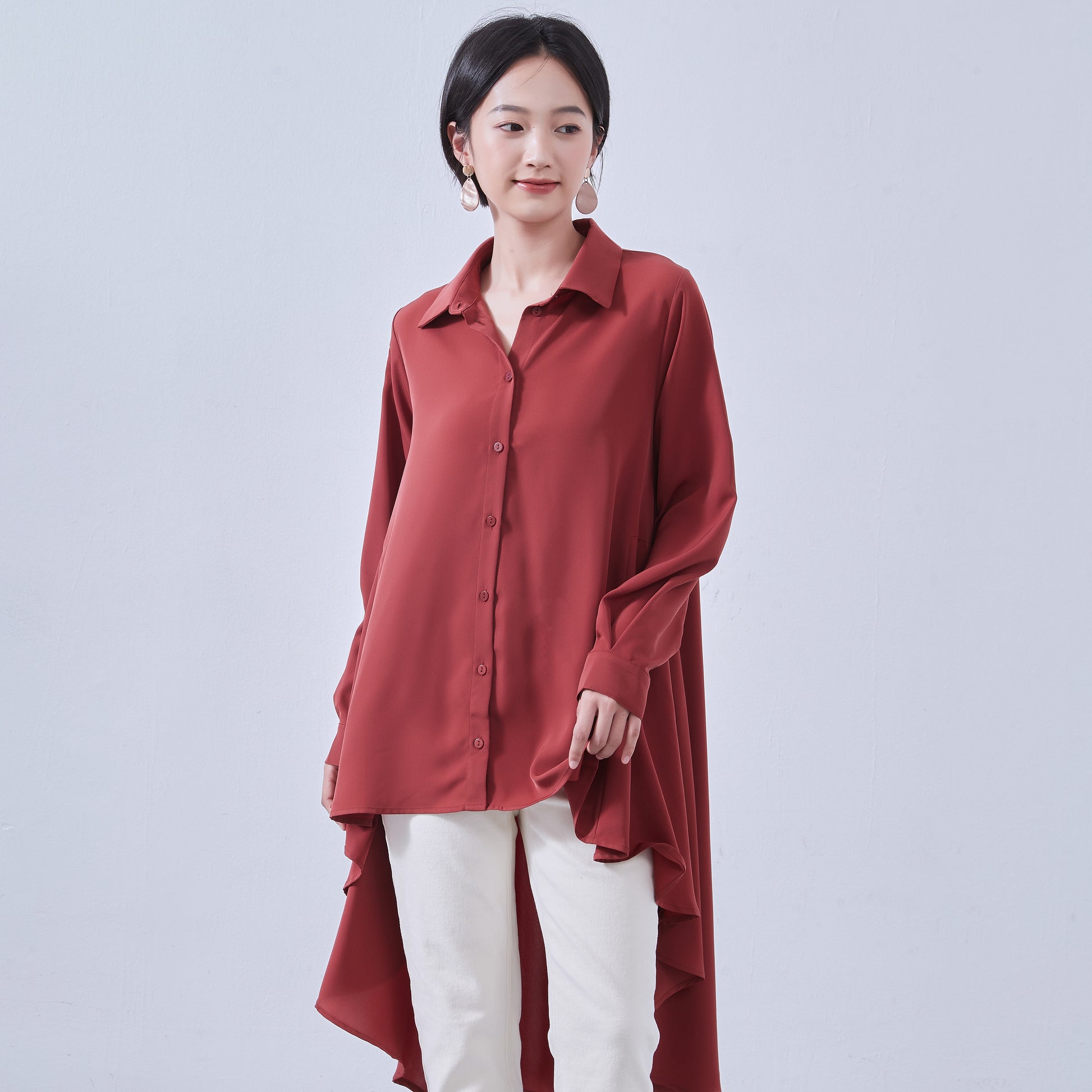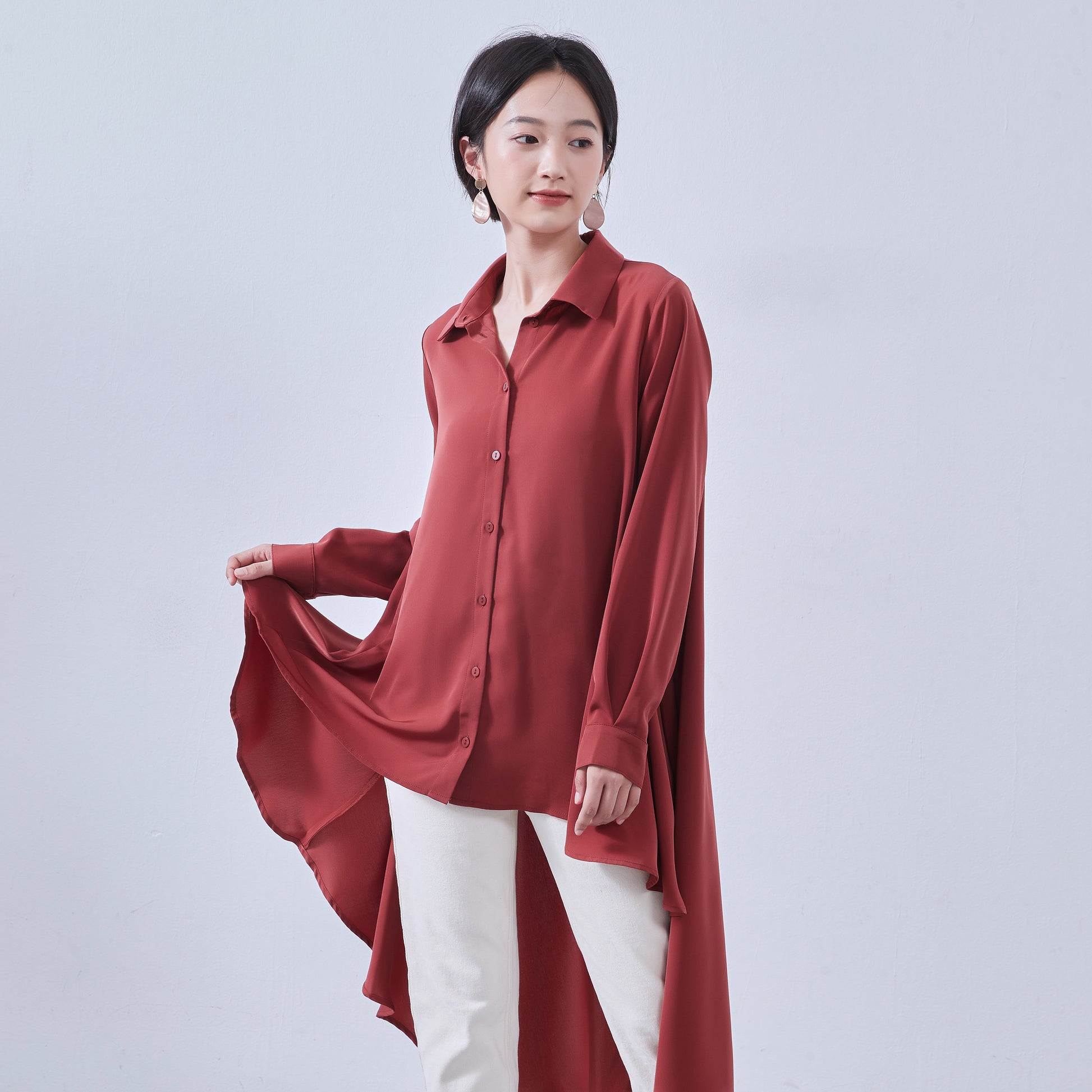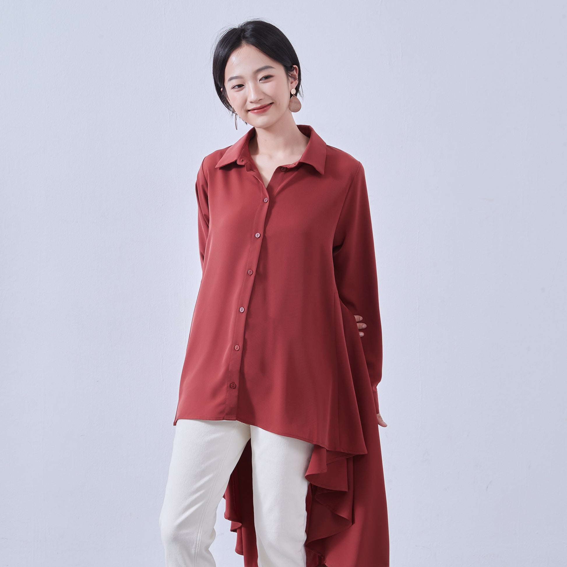 The elegant back flare long blouse is a dramatic long blouse with a curved hem that sways randomly. Its bold design and unique front and back lengths make it a striking piece that will make an impact. The front of the shirt has a classic silhouette, and the flare design that gently spreads out towards the back creates a style with a random swaying movement. This unique design brings out a charm that you won't find in ordinary shirts.