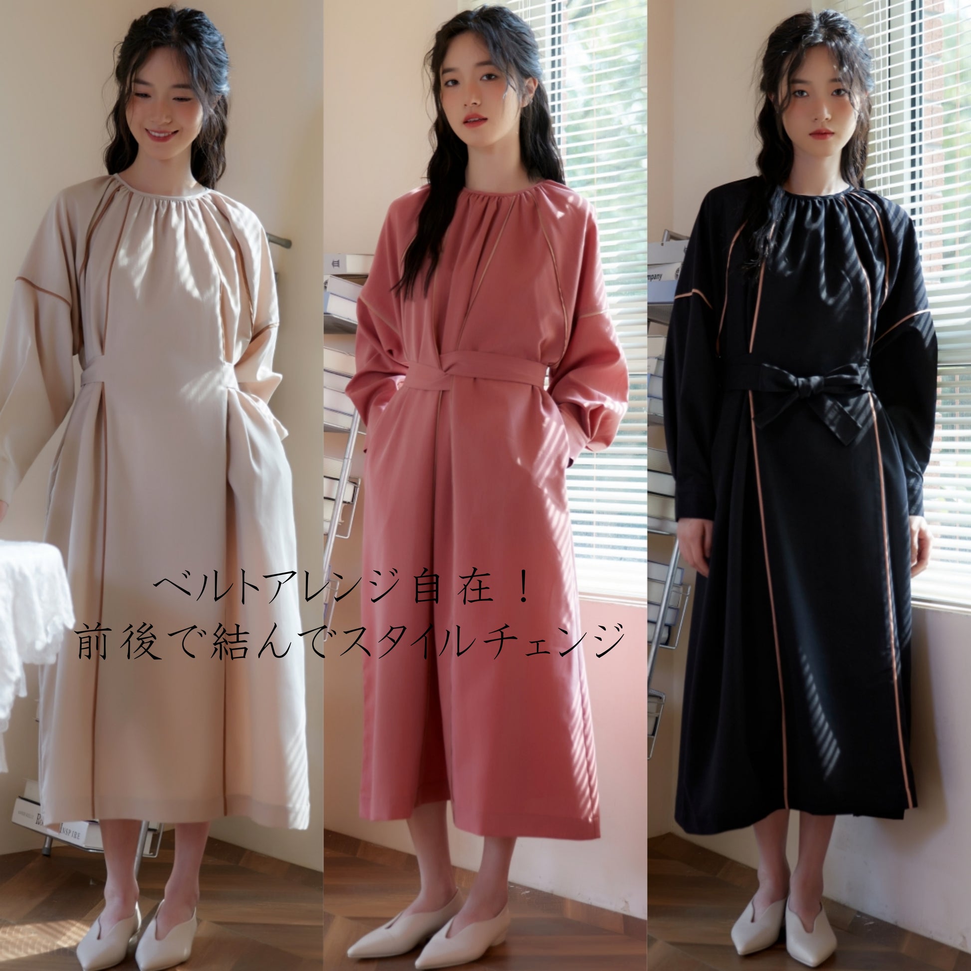 This dress features piping details and a belt, and the delicate piping details accentuate the design and create an elegant atmosphere. The belt can be tied in various ways, front and back, so you can enjoy various styles depending on how you arrange it. You can create an elegant occasion look by marking the waist of the dress with a belt and pairing it with heeled pumps or strap sandals, or you can add simple accessories and a clutch bag for a refined impression. It has pockets on both sides. Available in three colors: beige, black, and raspberry.