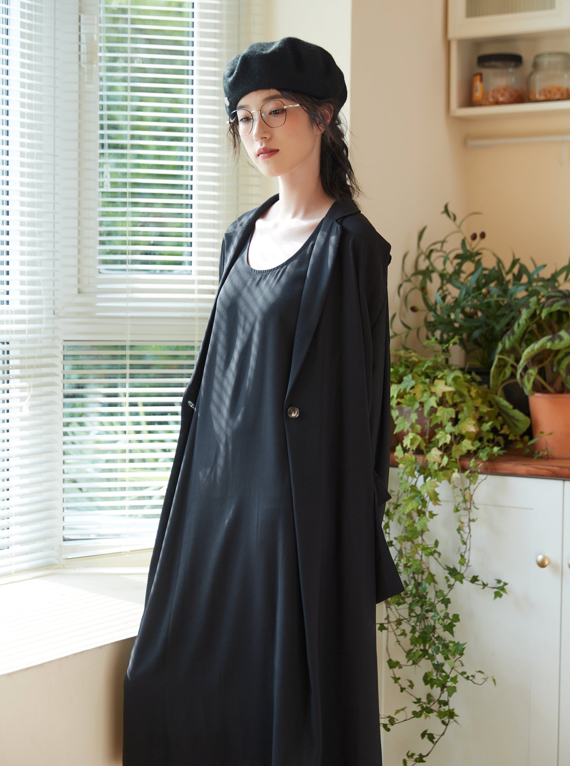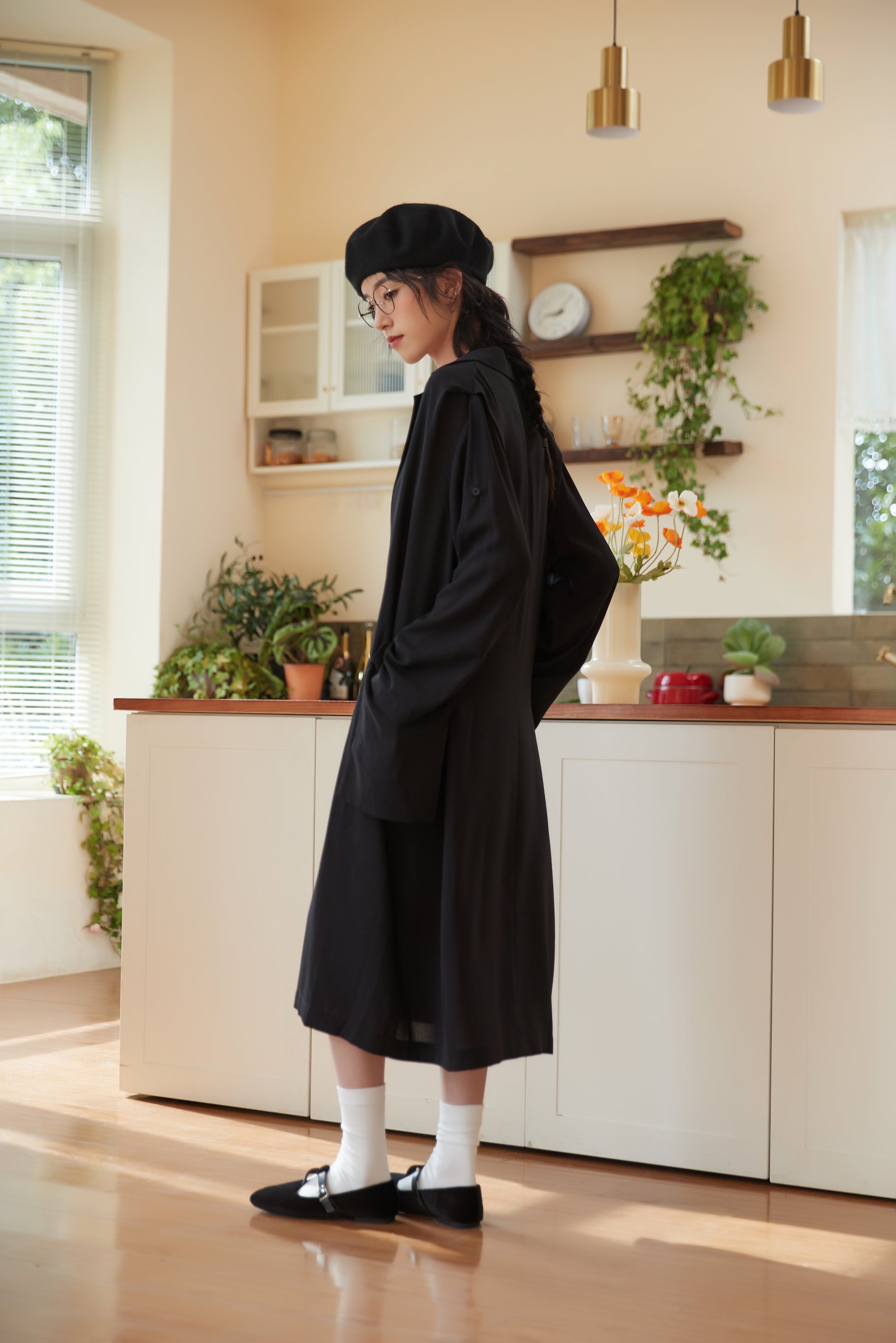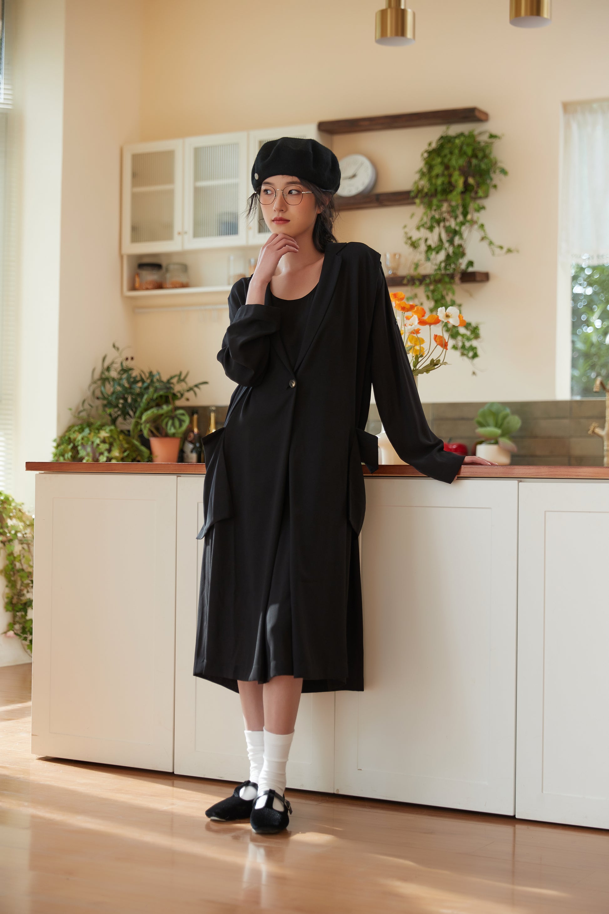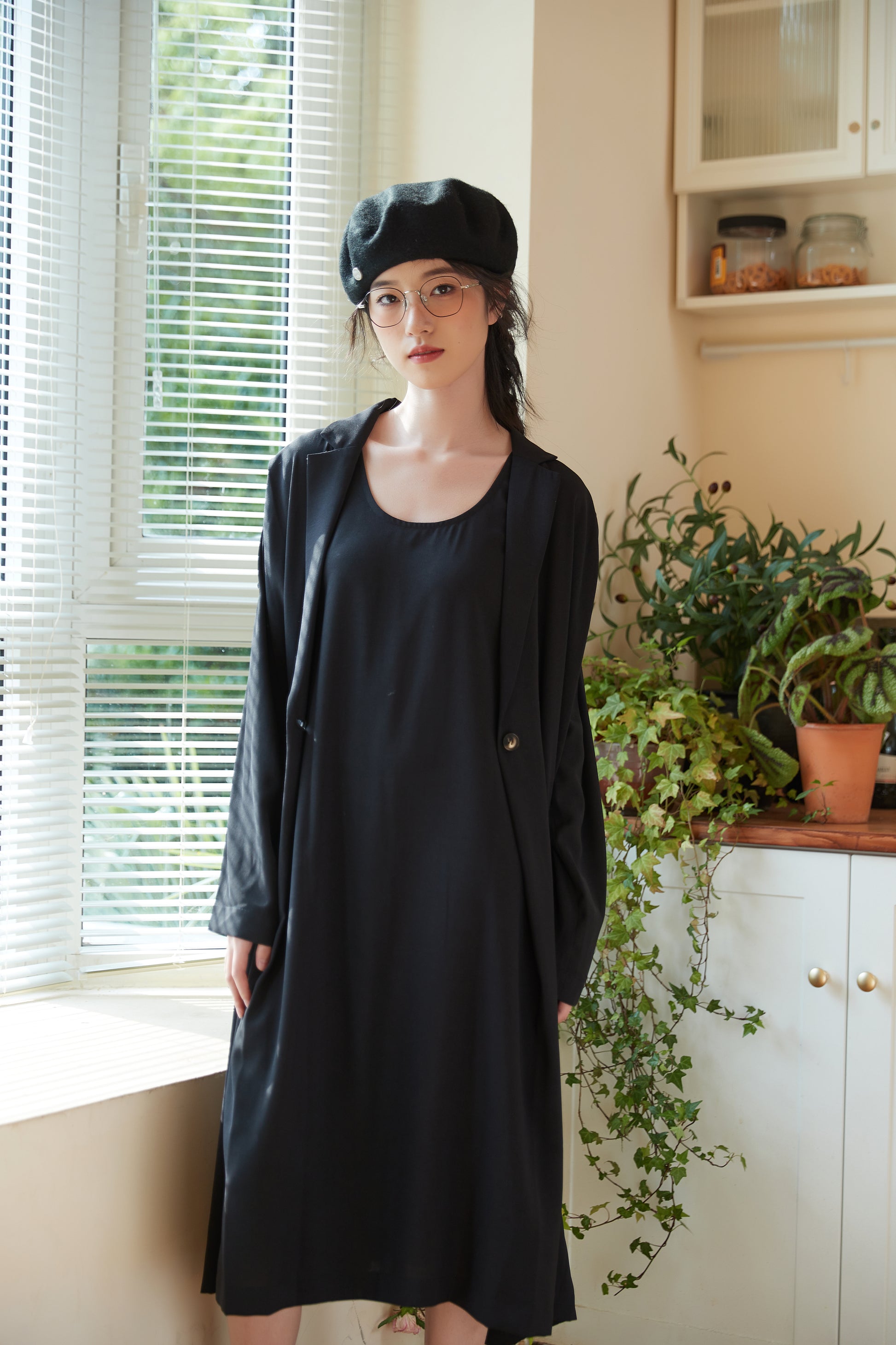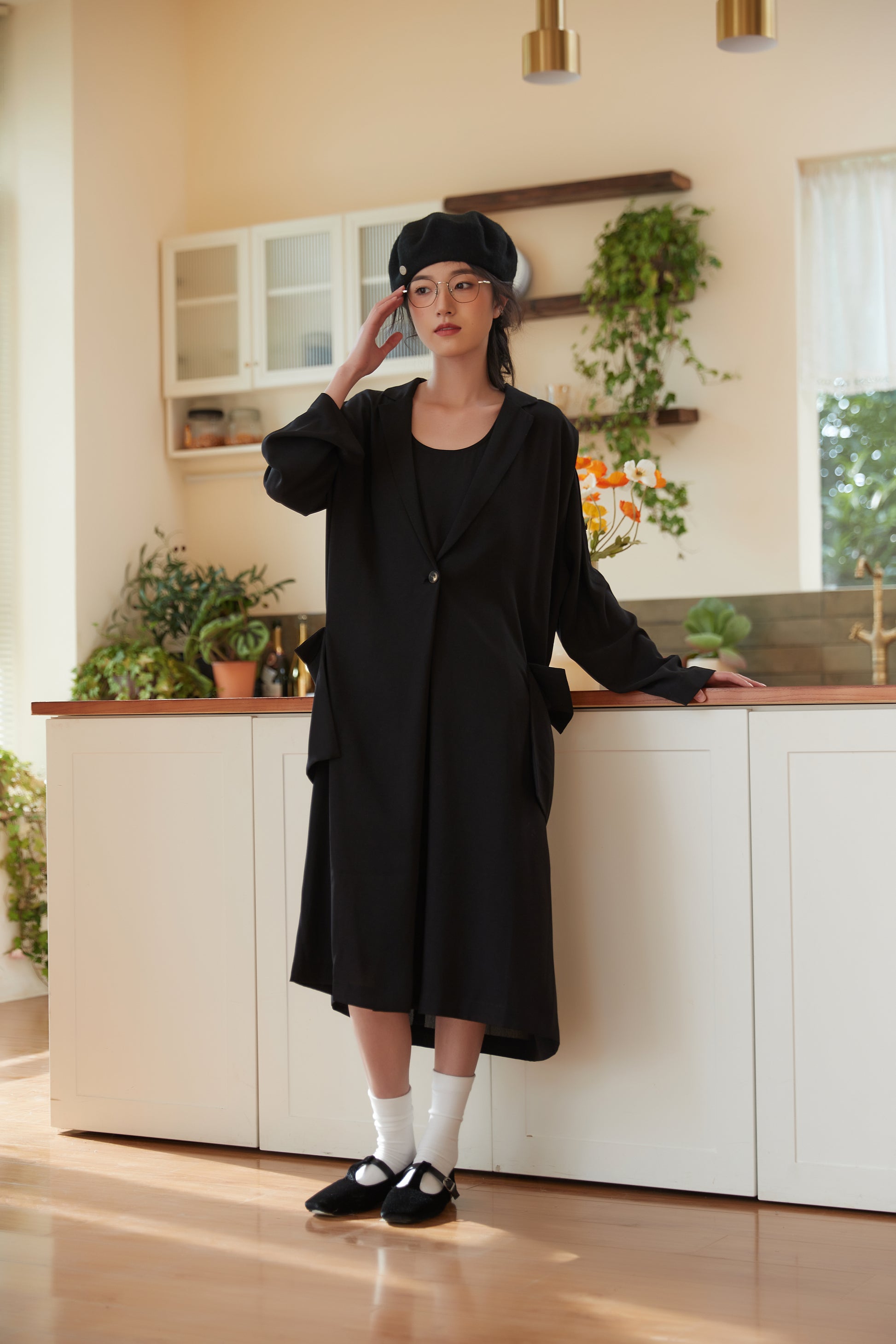 The key feature of this dress is the two-layered design. It looks like you're wearing a trench coat, but it's actually a single dress. When you open the buttons, the inner dress is exposed, and when you close the buttons, it looks like a layered look, so you can enjoy a unique coordination with the fake design. The material is easy to care for, with a drape that is just the right thickness for spring and autumn.