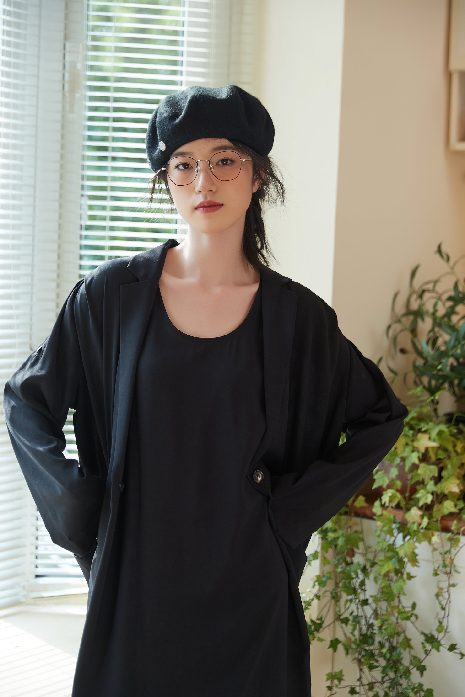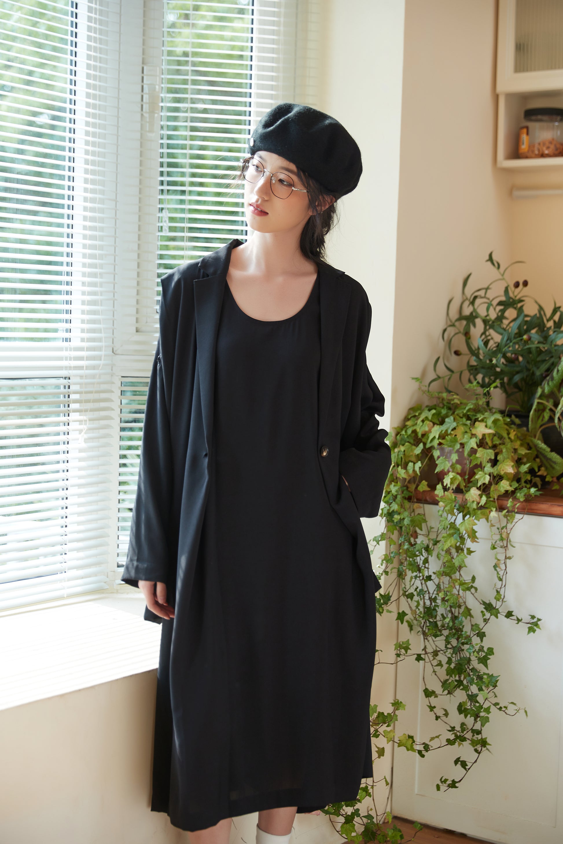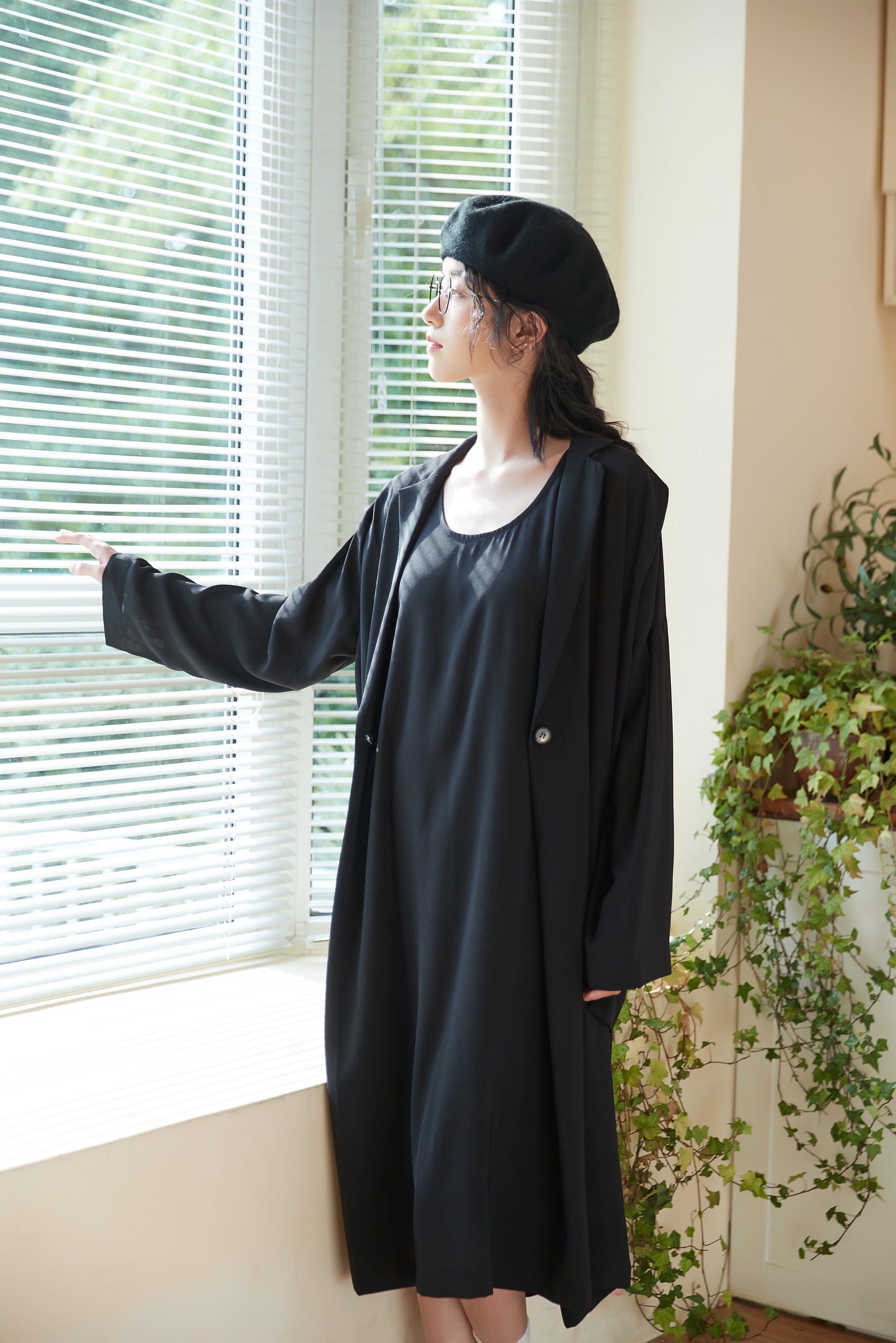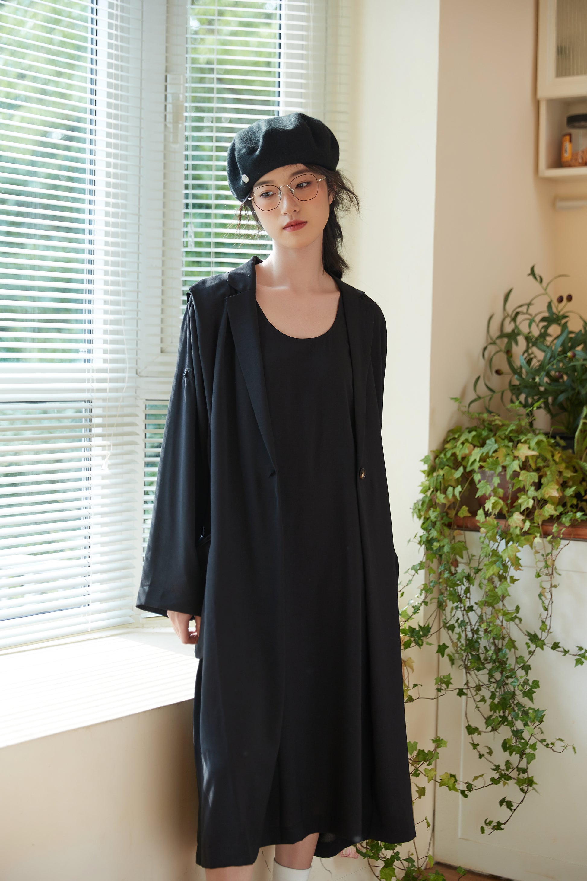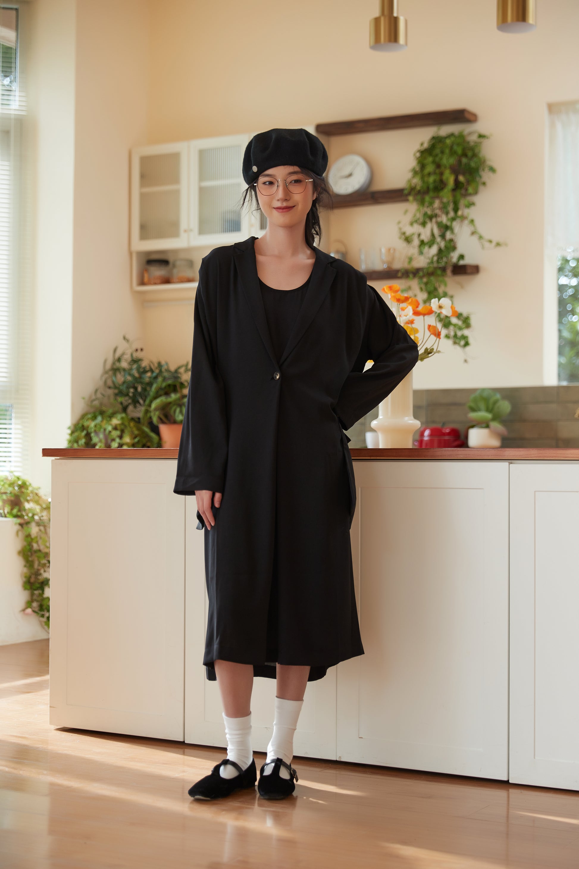 The key feature of this dress is the two-layered design. It looks like you're wearing a trench coat, but it's actually a single dress. When you open the buttons, the inner dress is exposed, and when you close the buttons, it looks like a layered look, so you can enjoy a unique coordination with the fake design. The material is easy to care for, with a drape that is just the right thickness for spring and autumn.