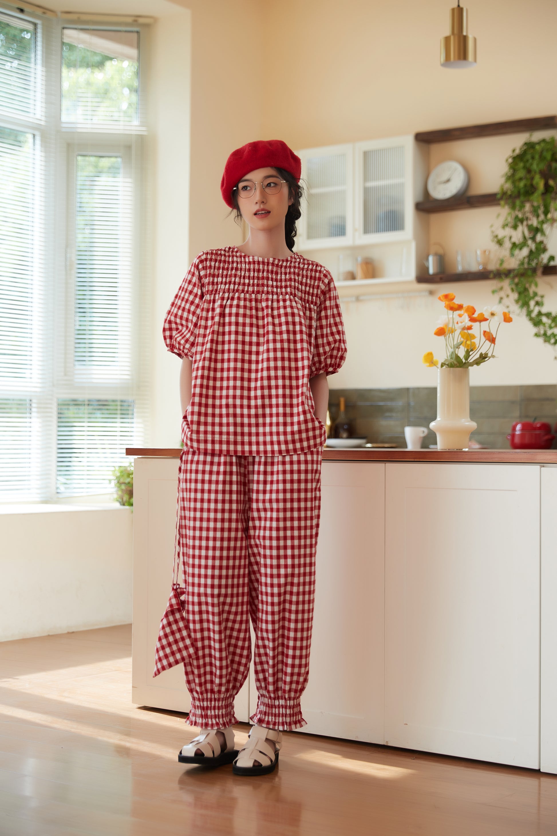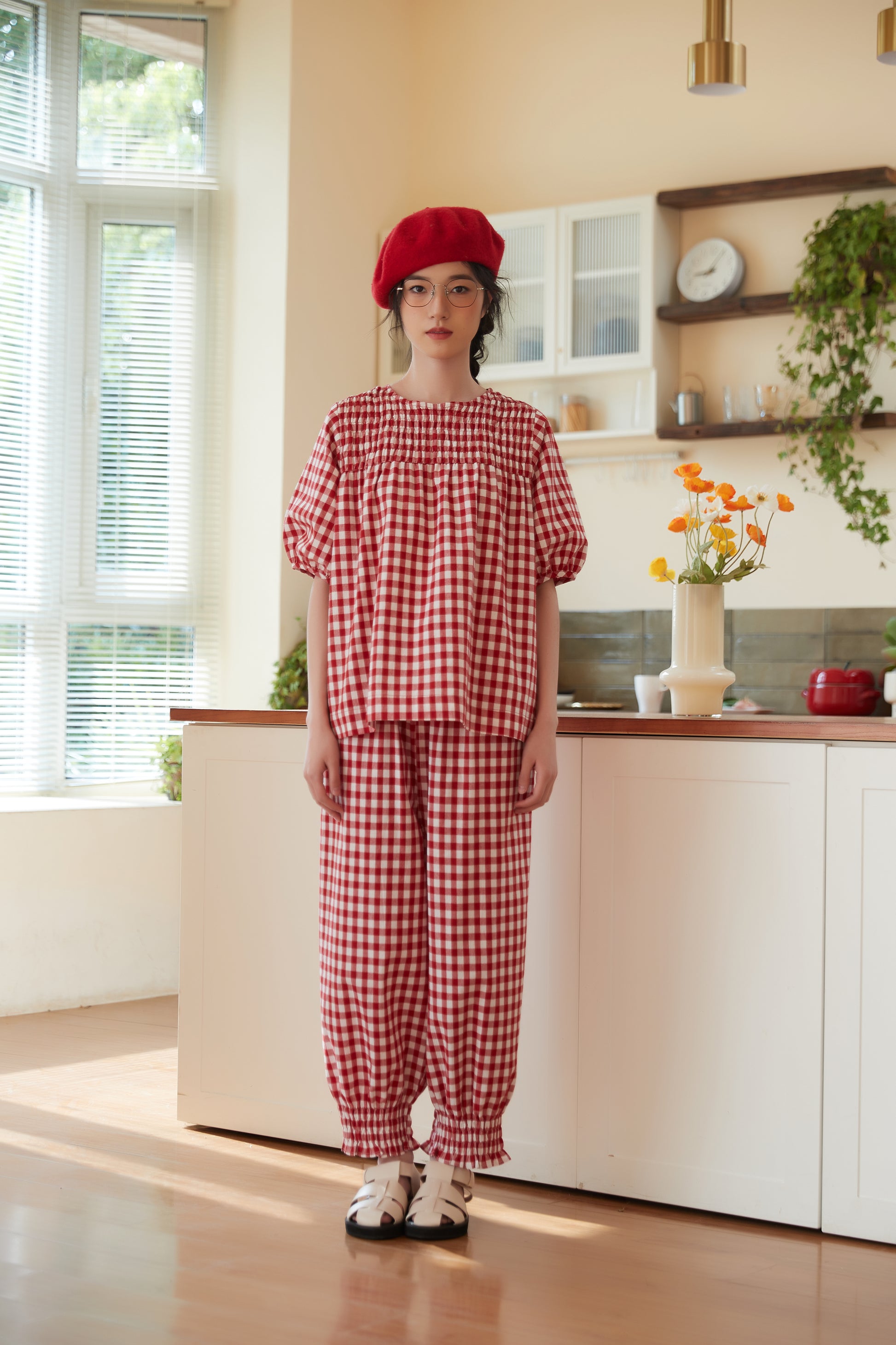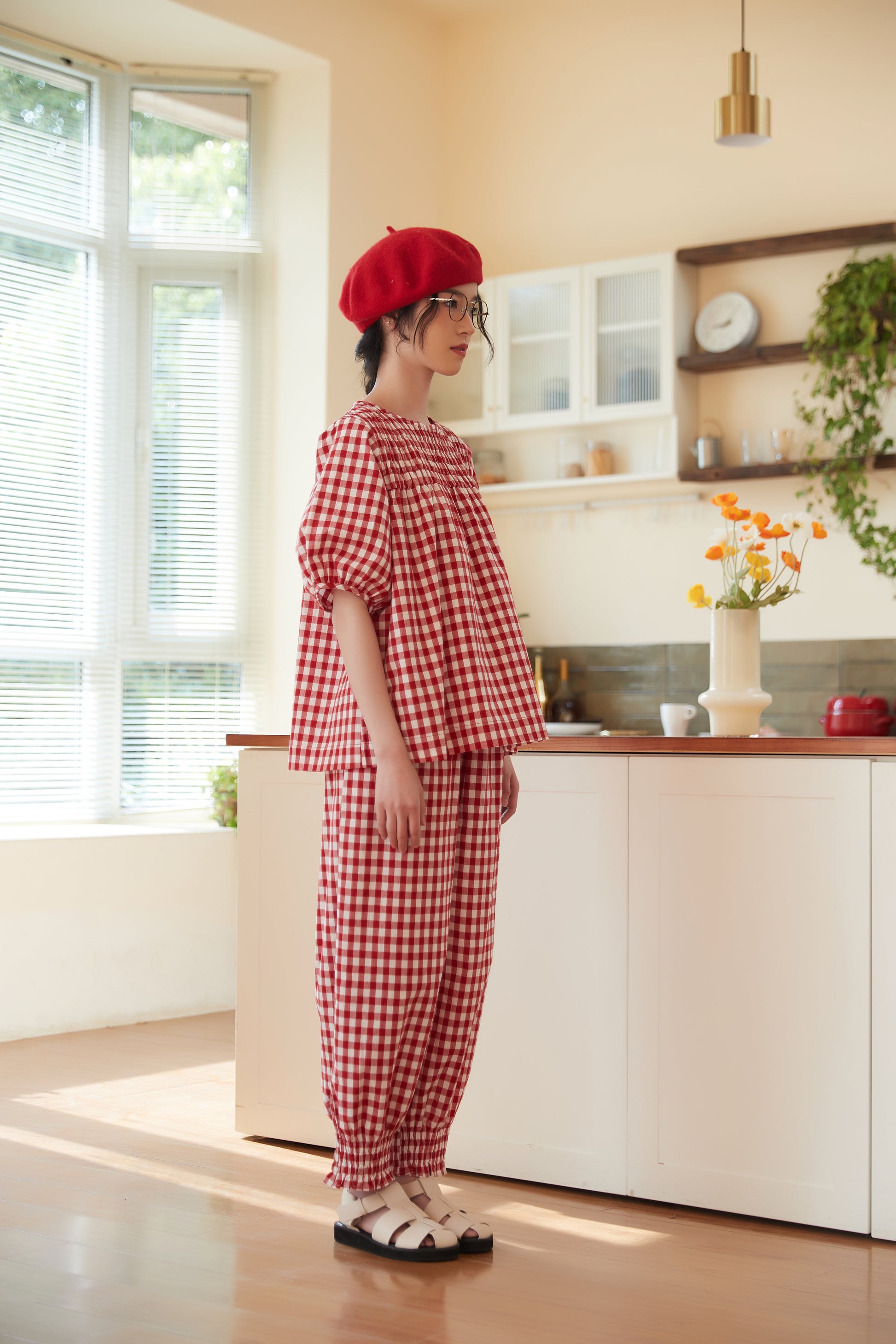 KNSP337-RED Gingham Check Smocking Embroidered Pumpkin Pants