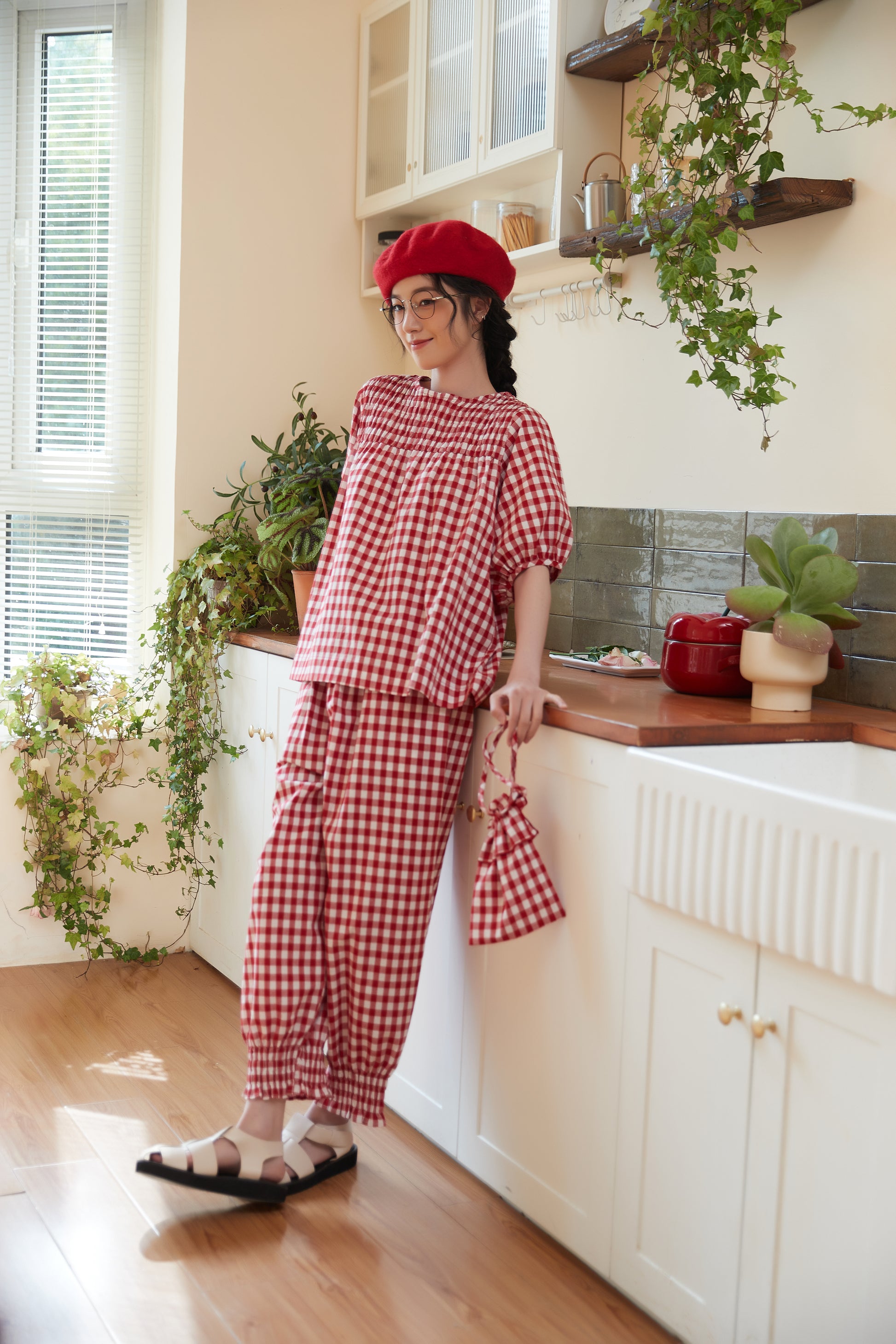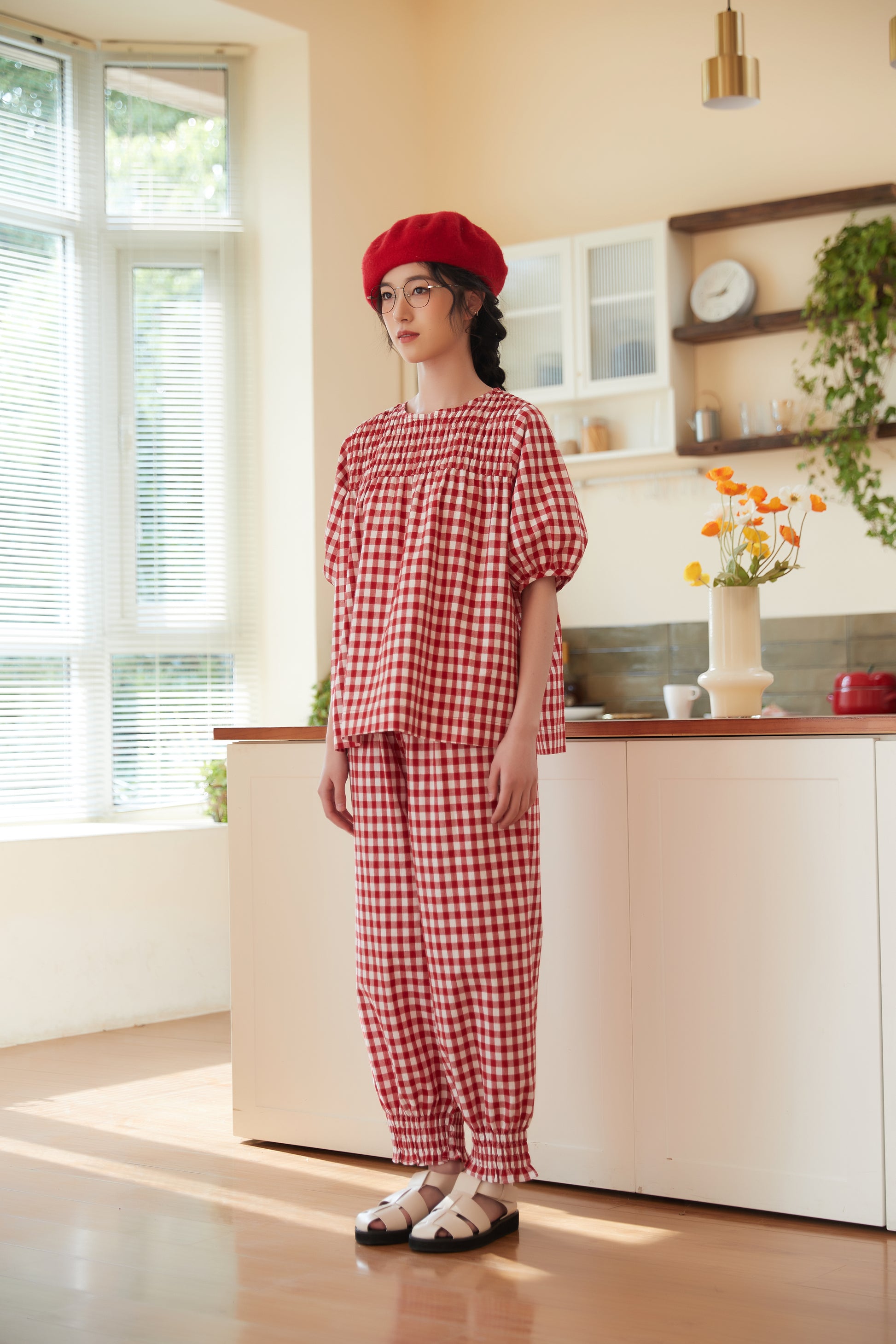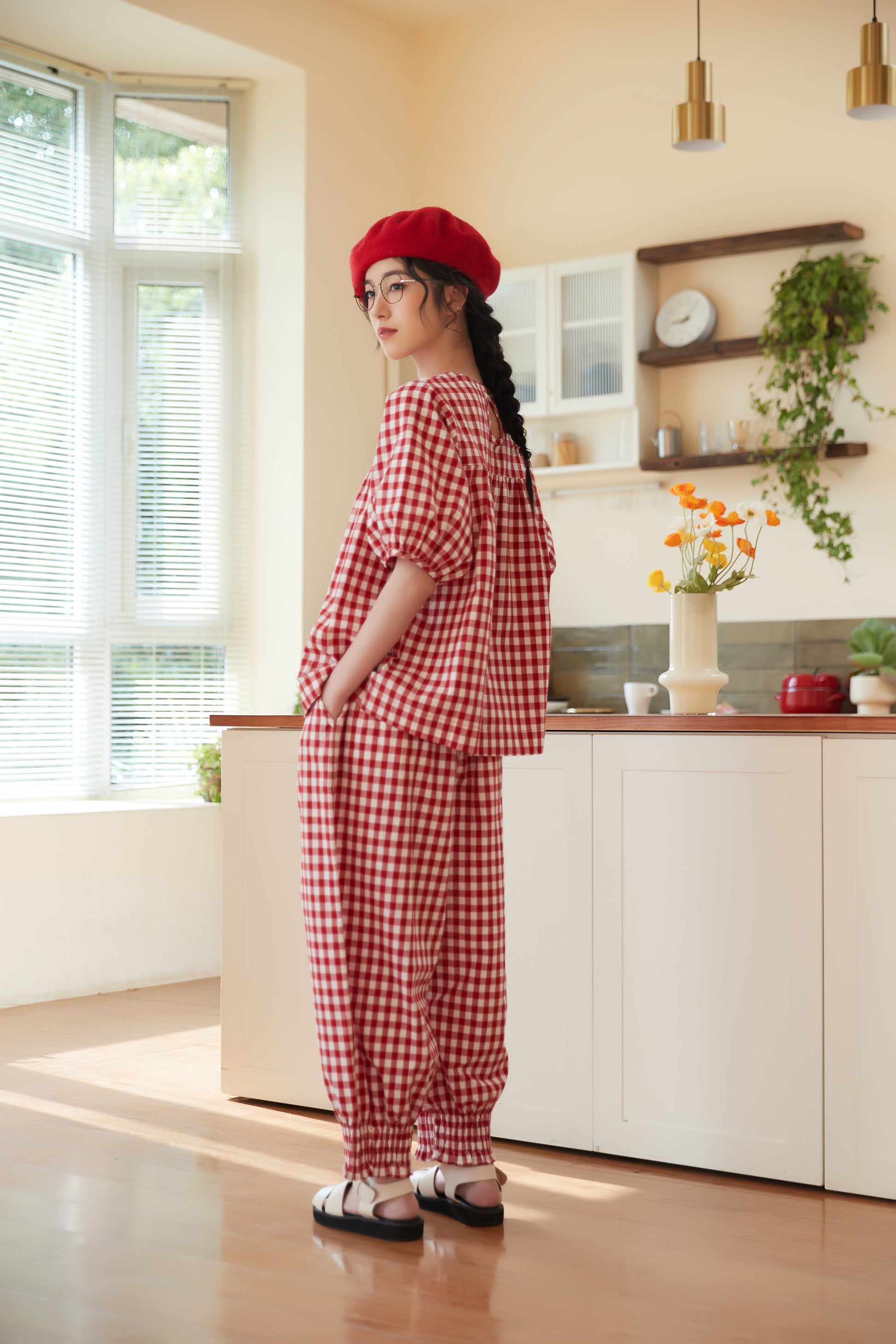 KNSP337-RED Gingham Check Smocking Embroidered Pumpkin Pants
