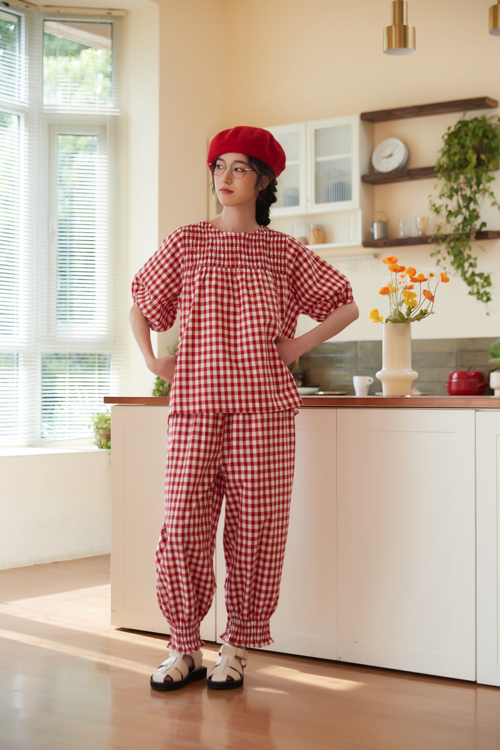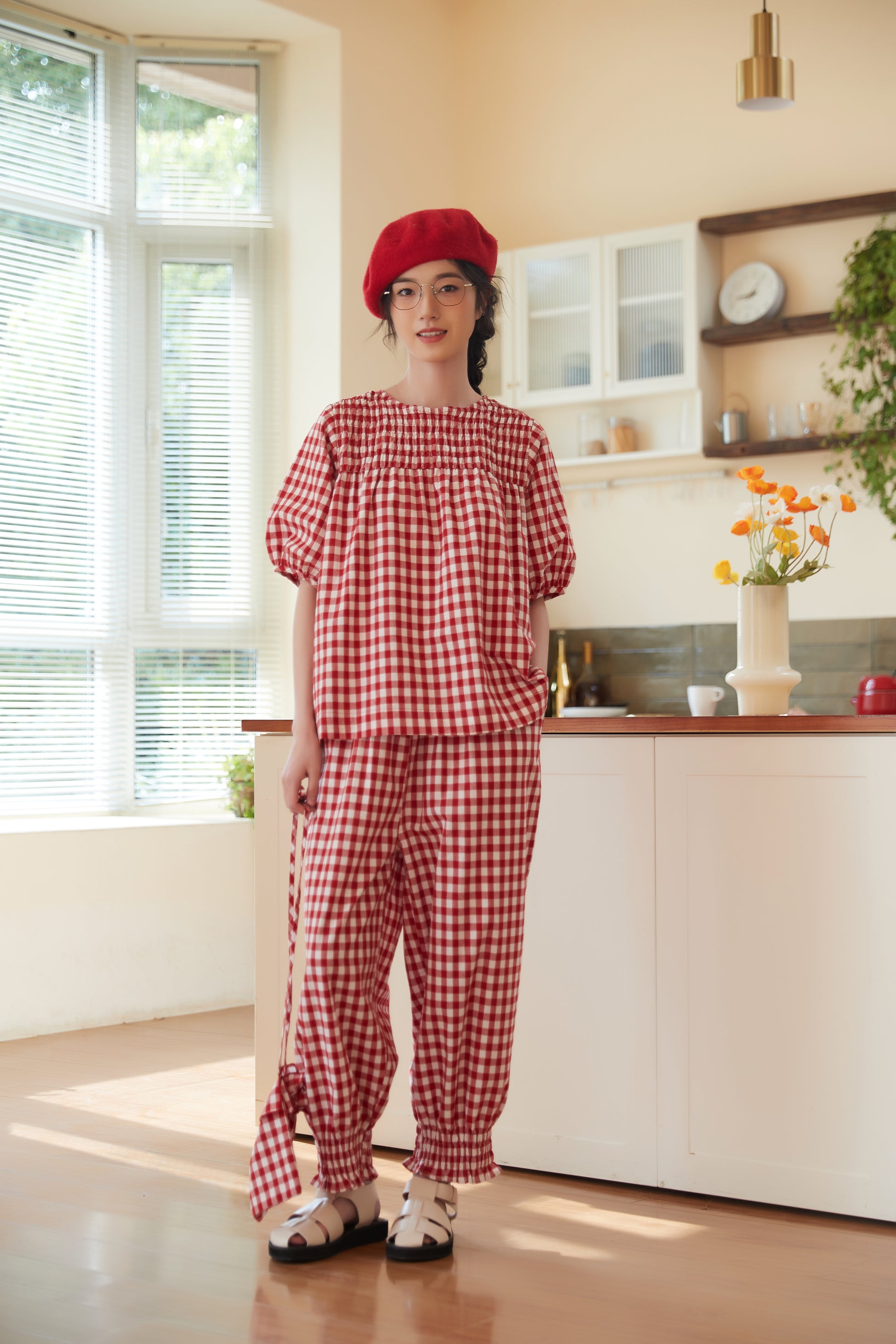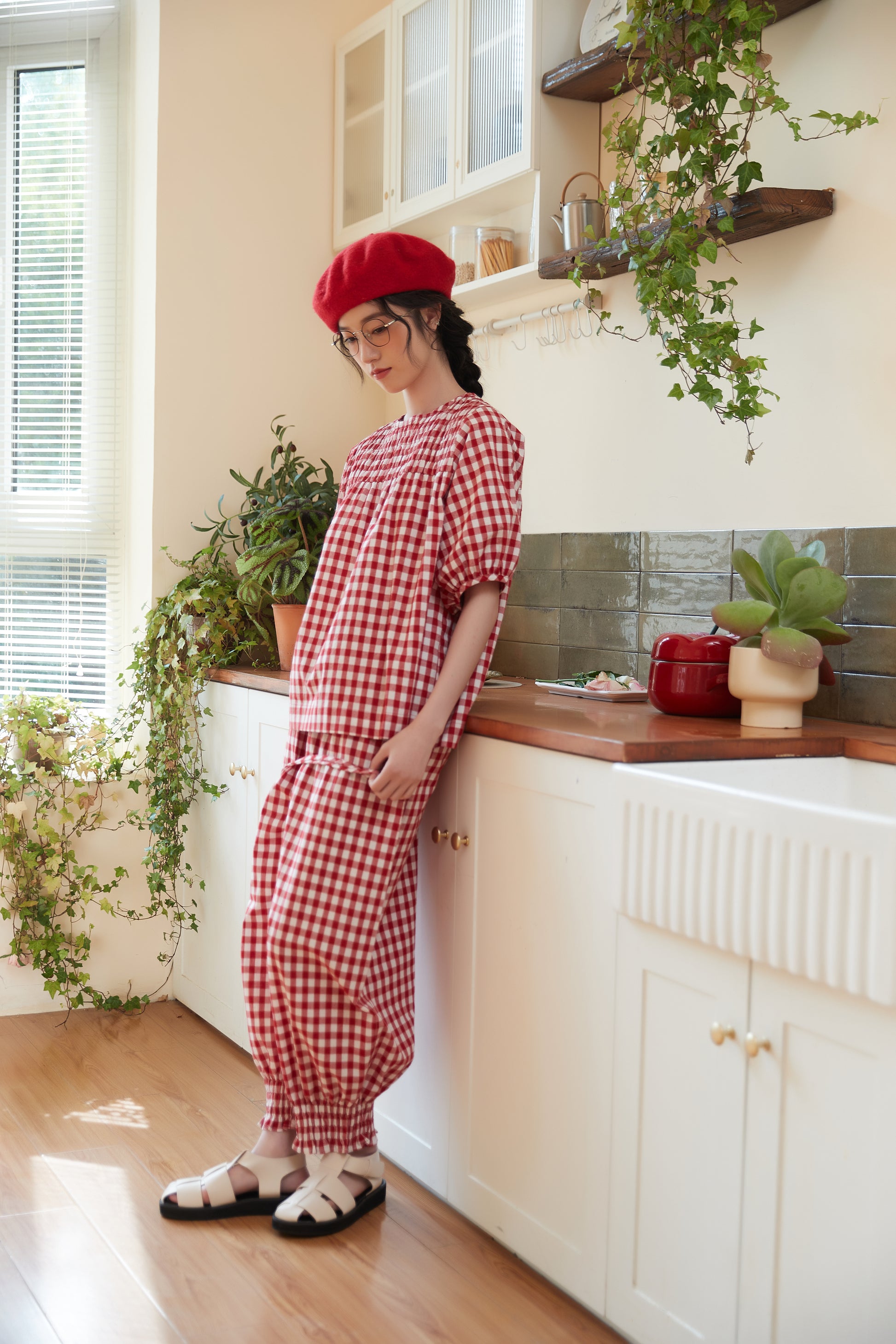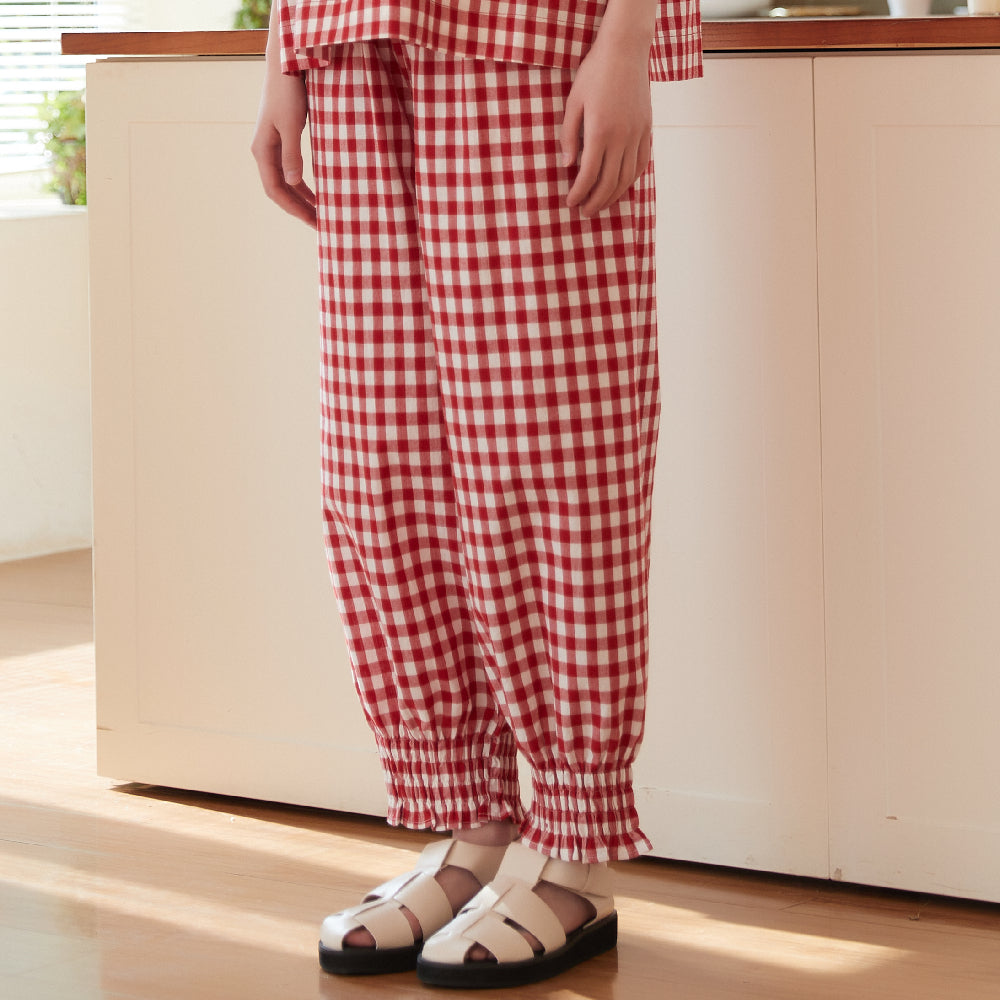 These cute pumpkin pants have a gingham check pattern. The hem is embroidered with smocking, and the frills make your feet look cute. The elastic waistband keeps you comfortable all day long. There are also pockets on both sides for your convenience. We also have a short-sleeved top with smocking embroidery in the same pattern that can be paired with the pants. This is a highly recommended item that you can wear as loungewear or go out in.