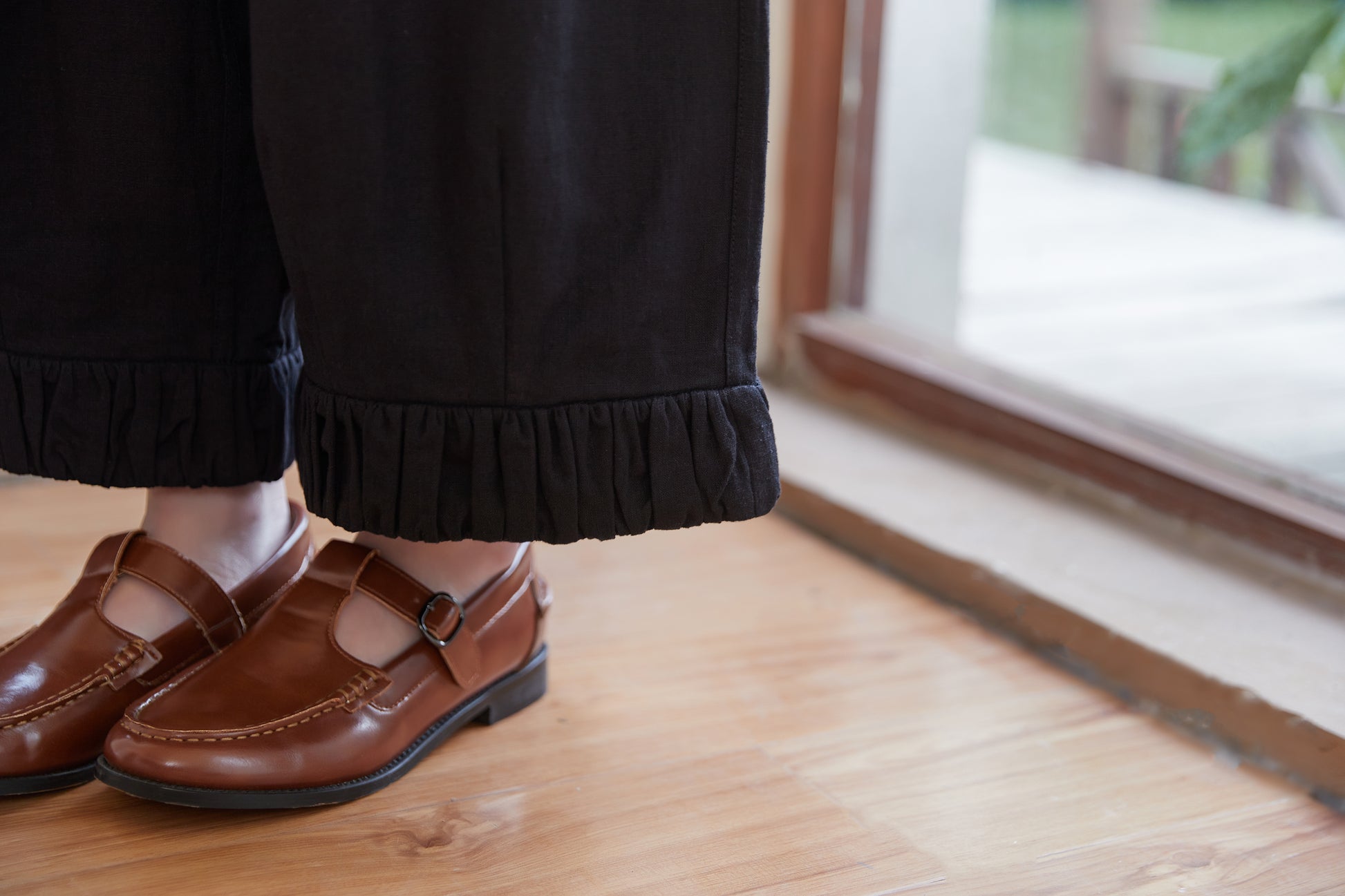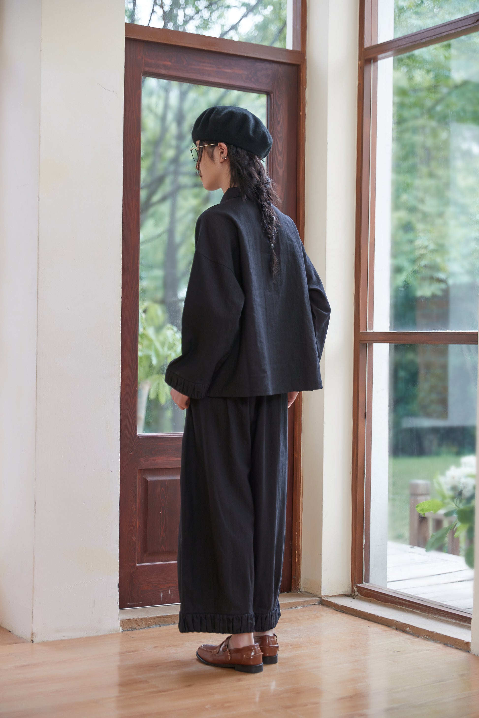 KNSP347-BLACK Gathered hem linen cotton wide pants set