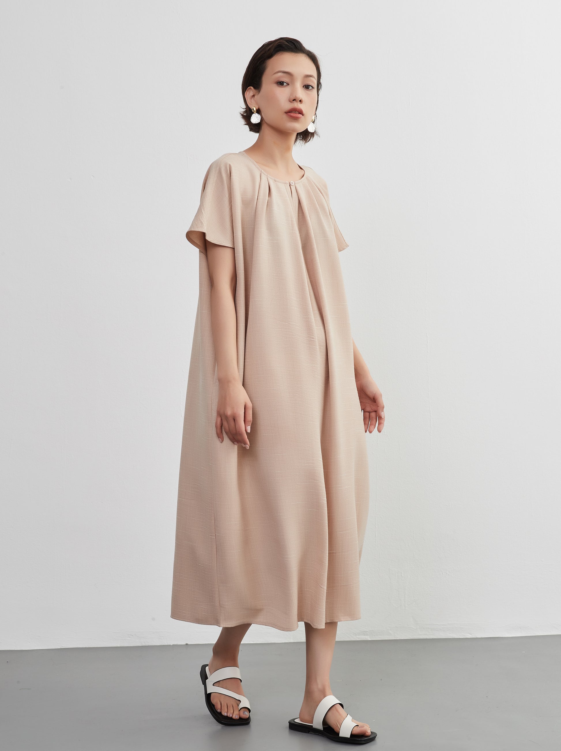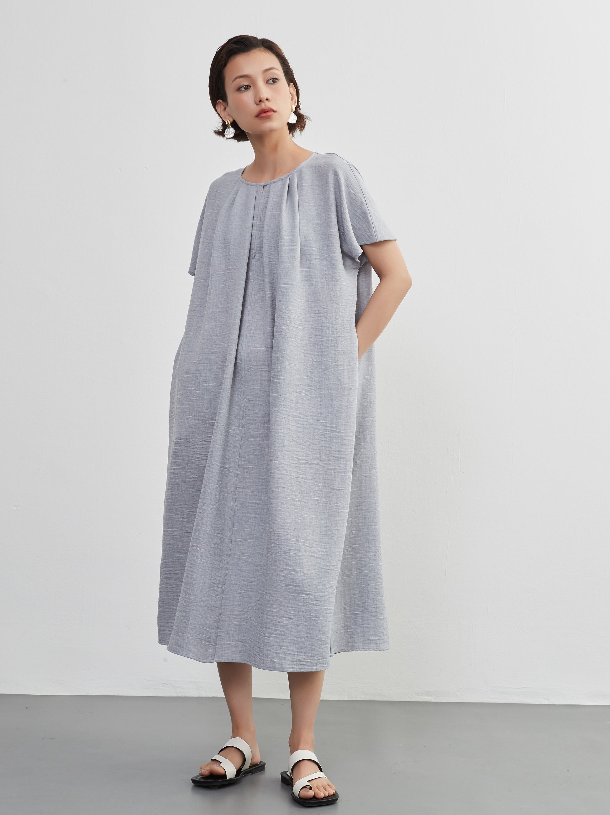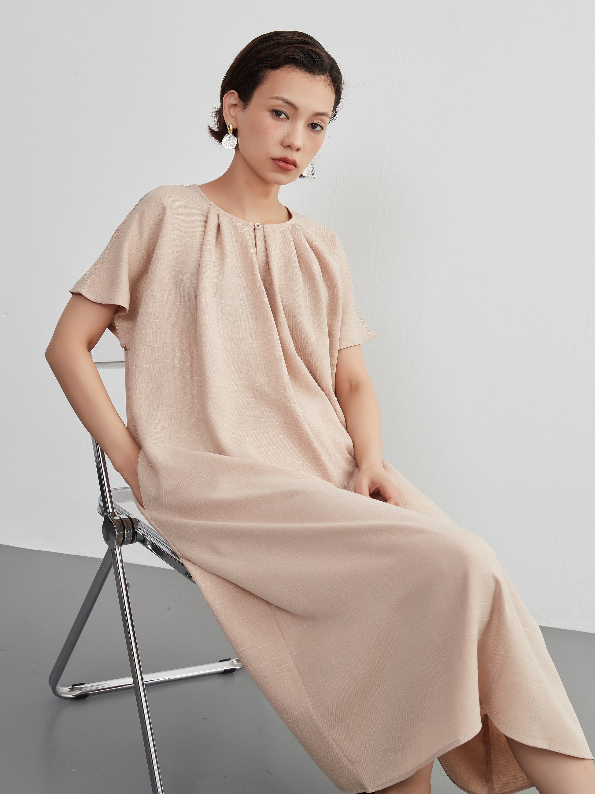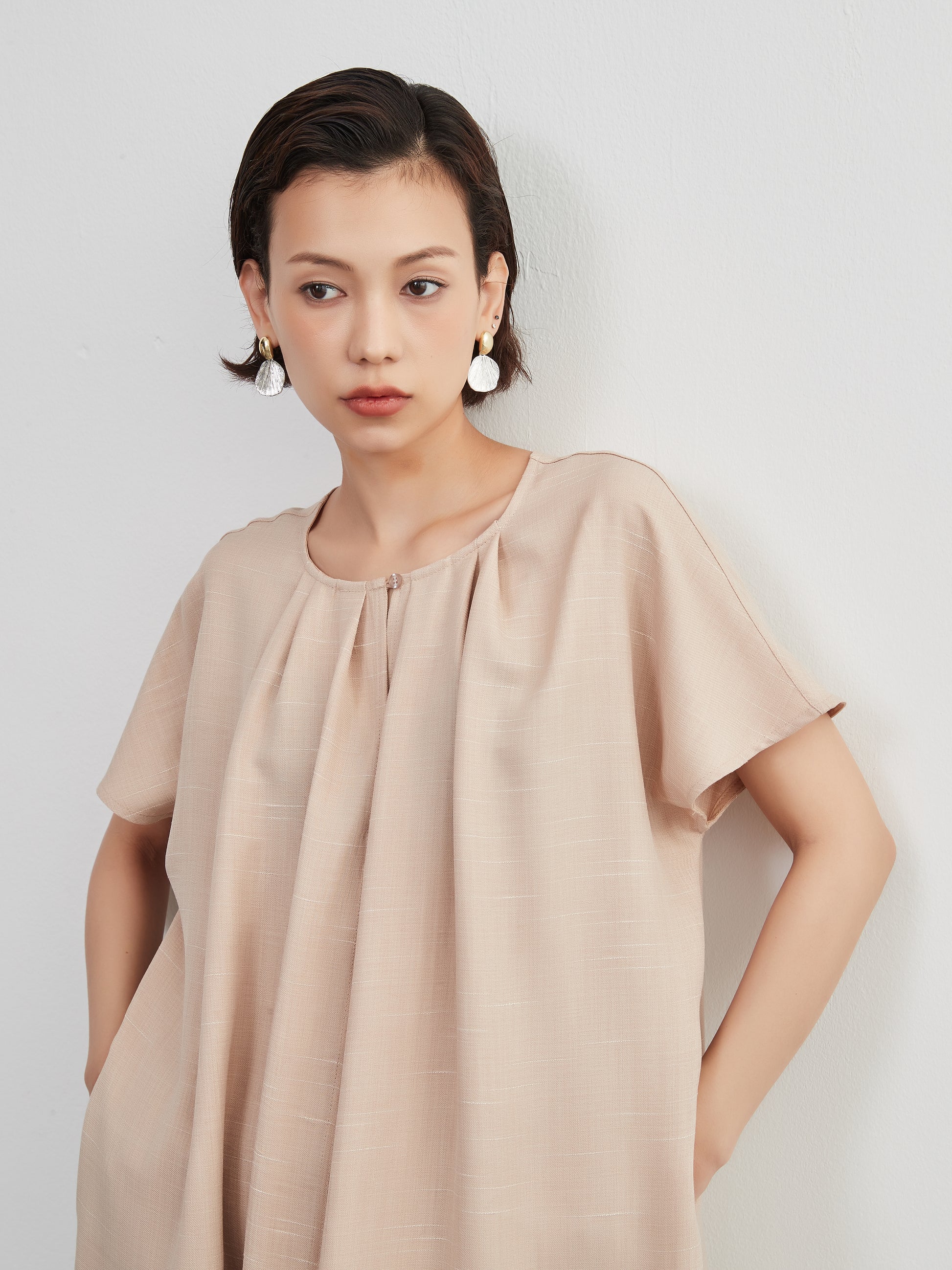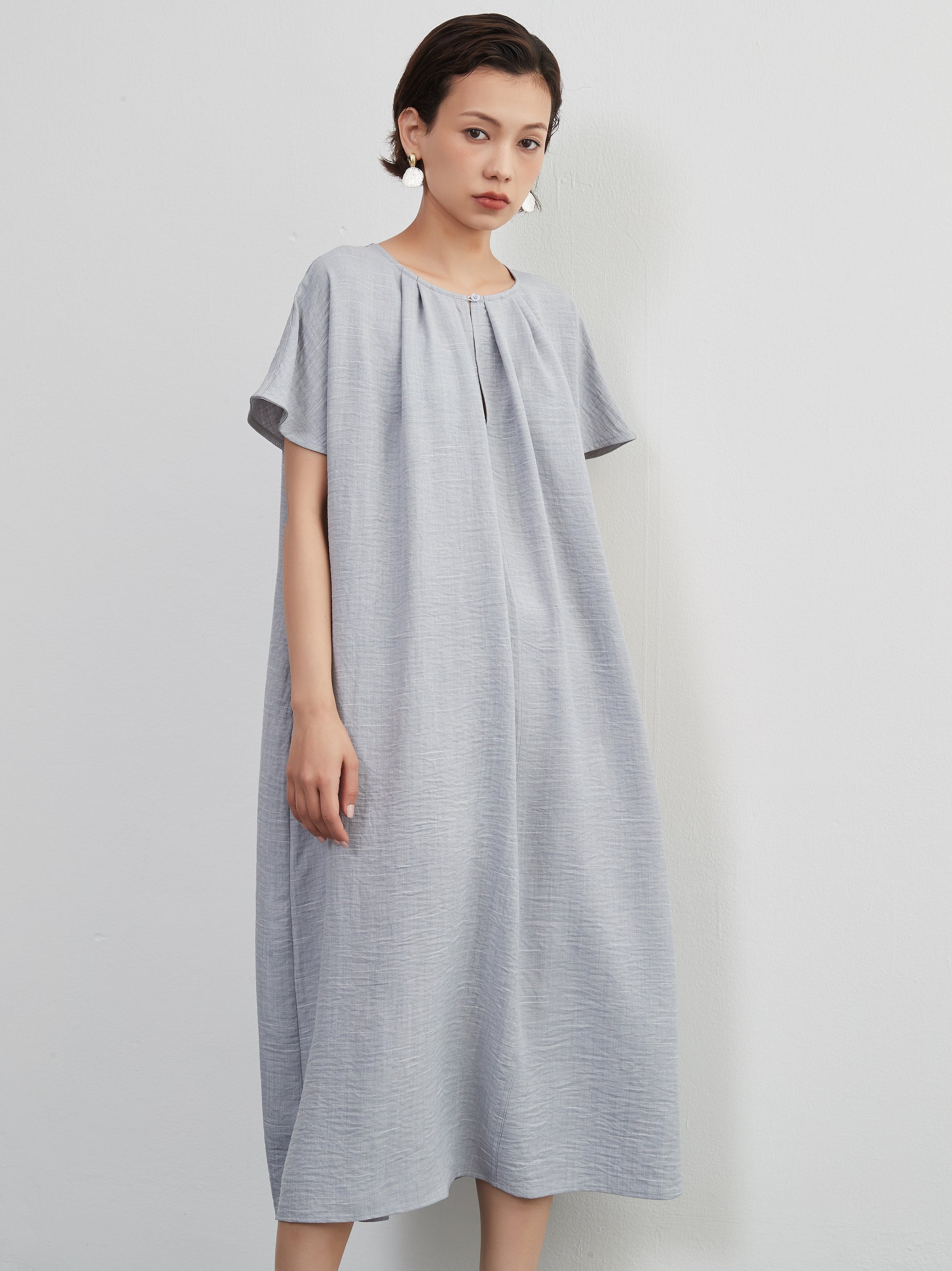 KNXO404 - Short sleeve tucked dress, loose silhouette, front opening, lined material dress