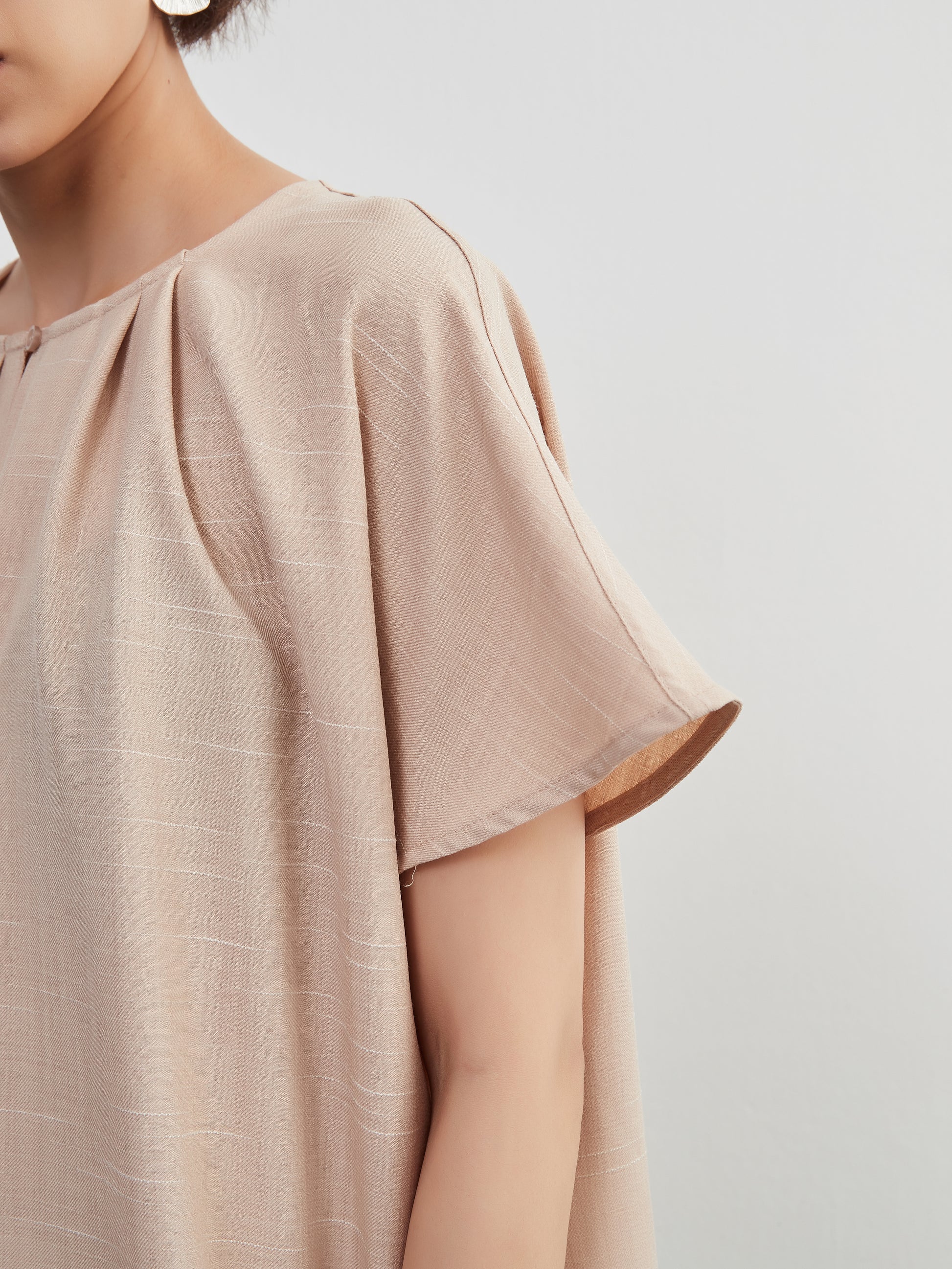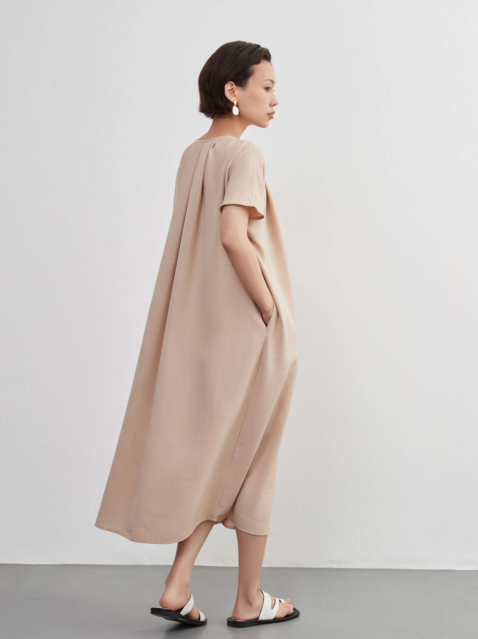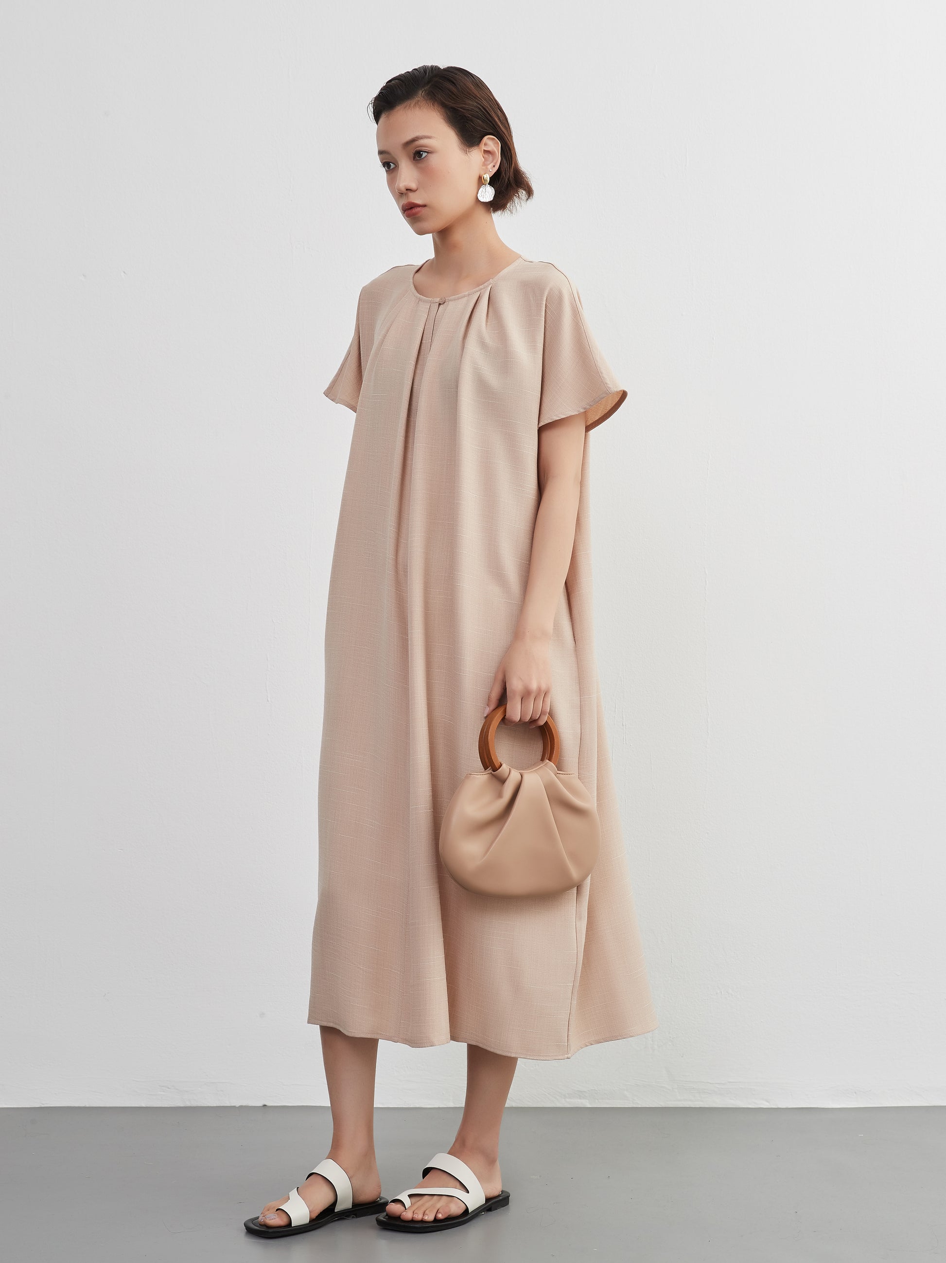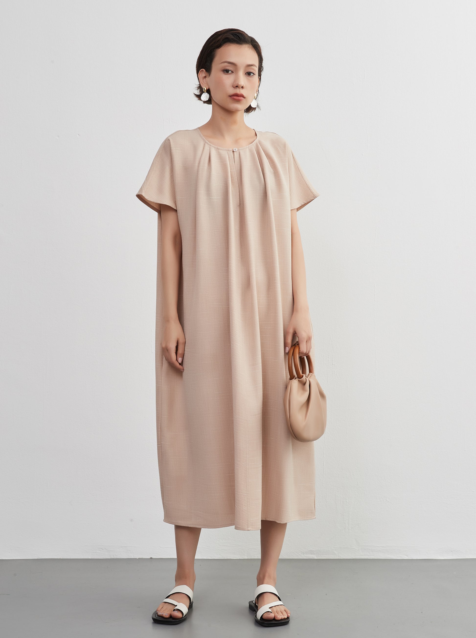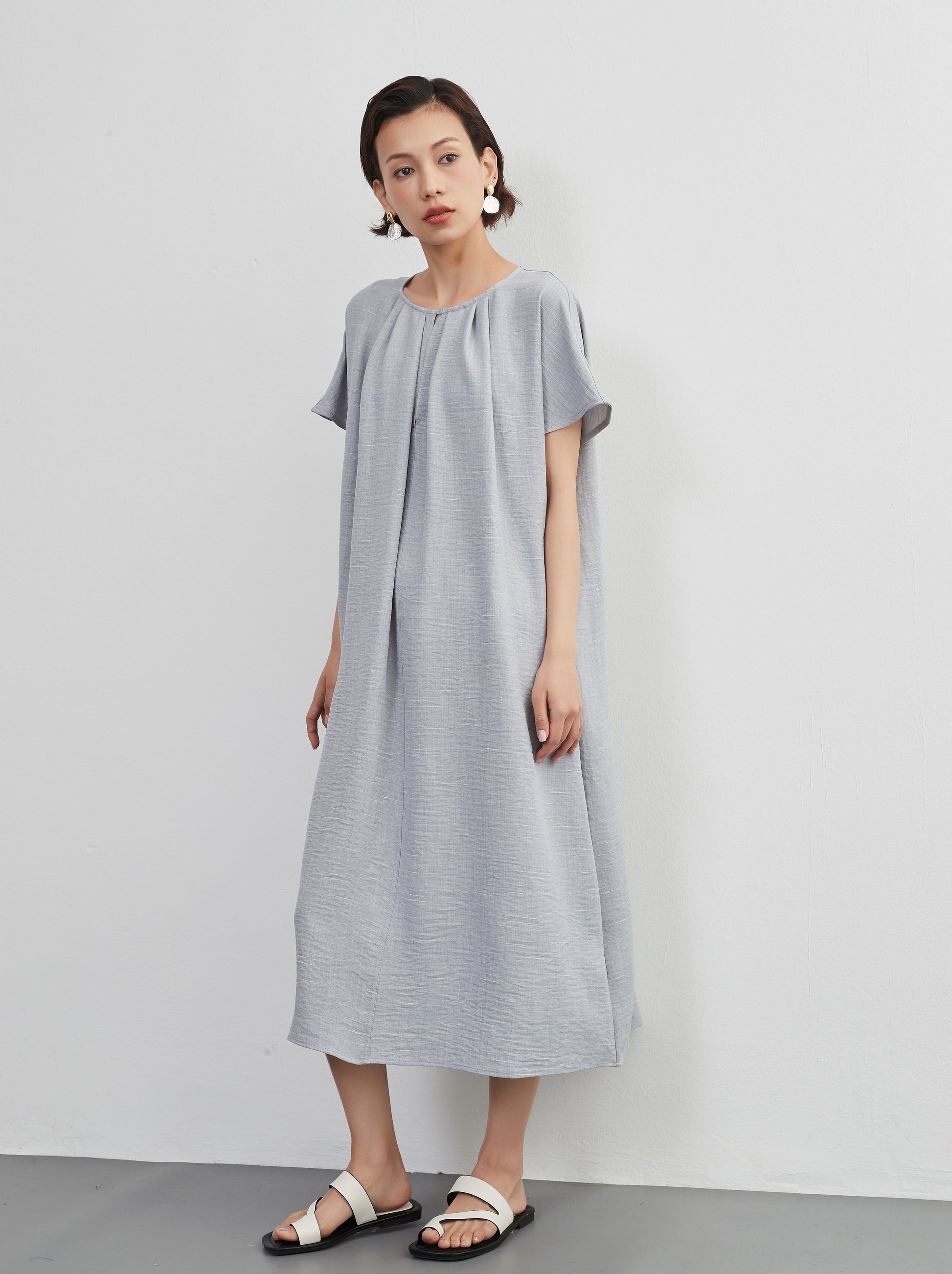 KNXO404 - Short sleeve tucked dress, loose silhouette, front opening, lined material dress