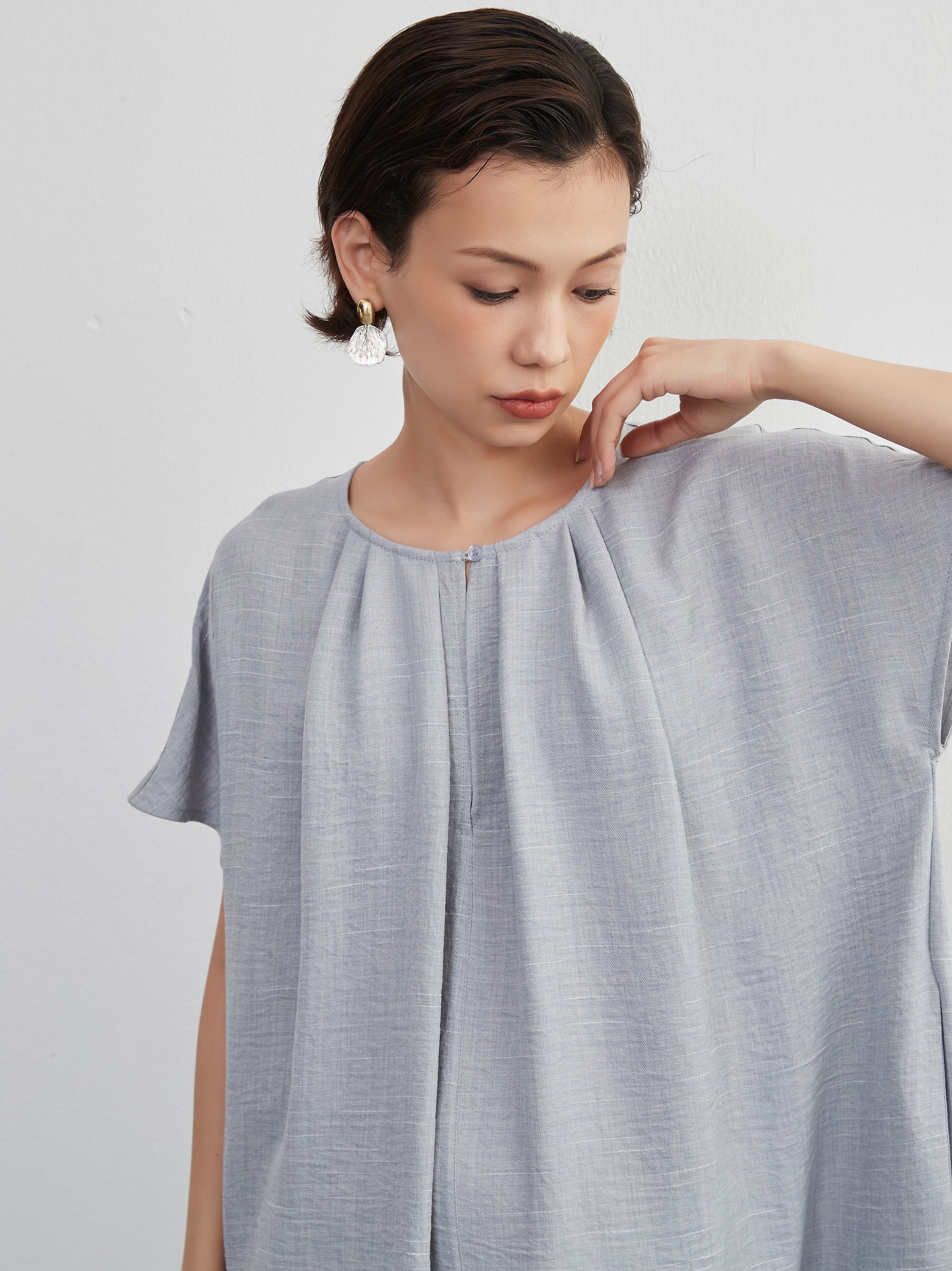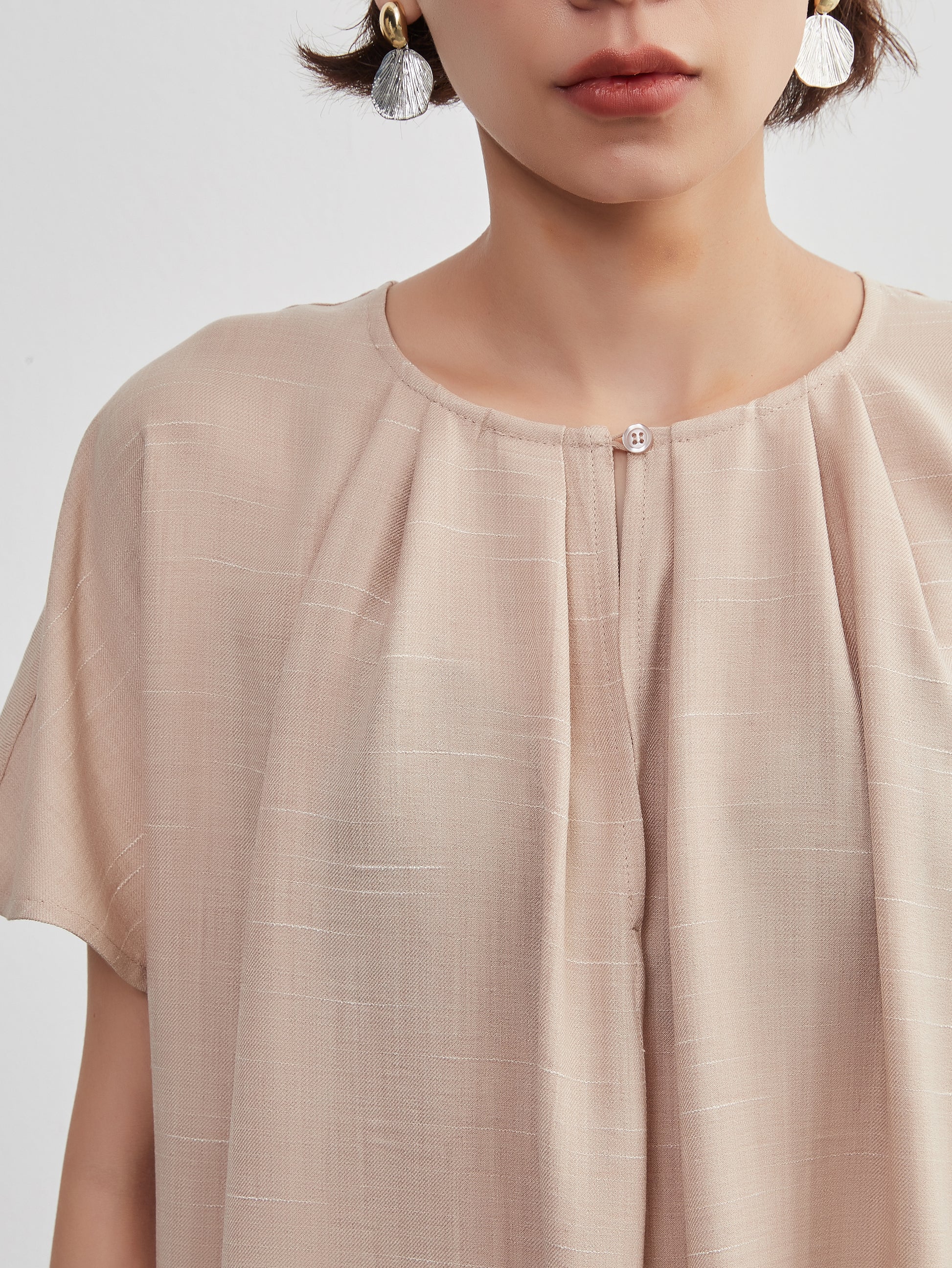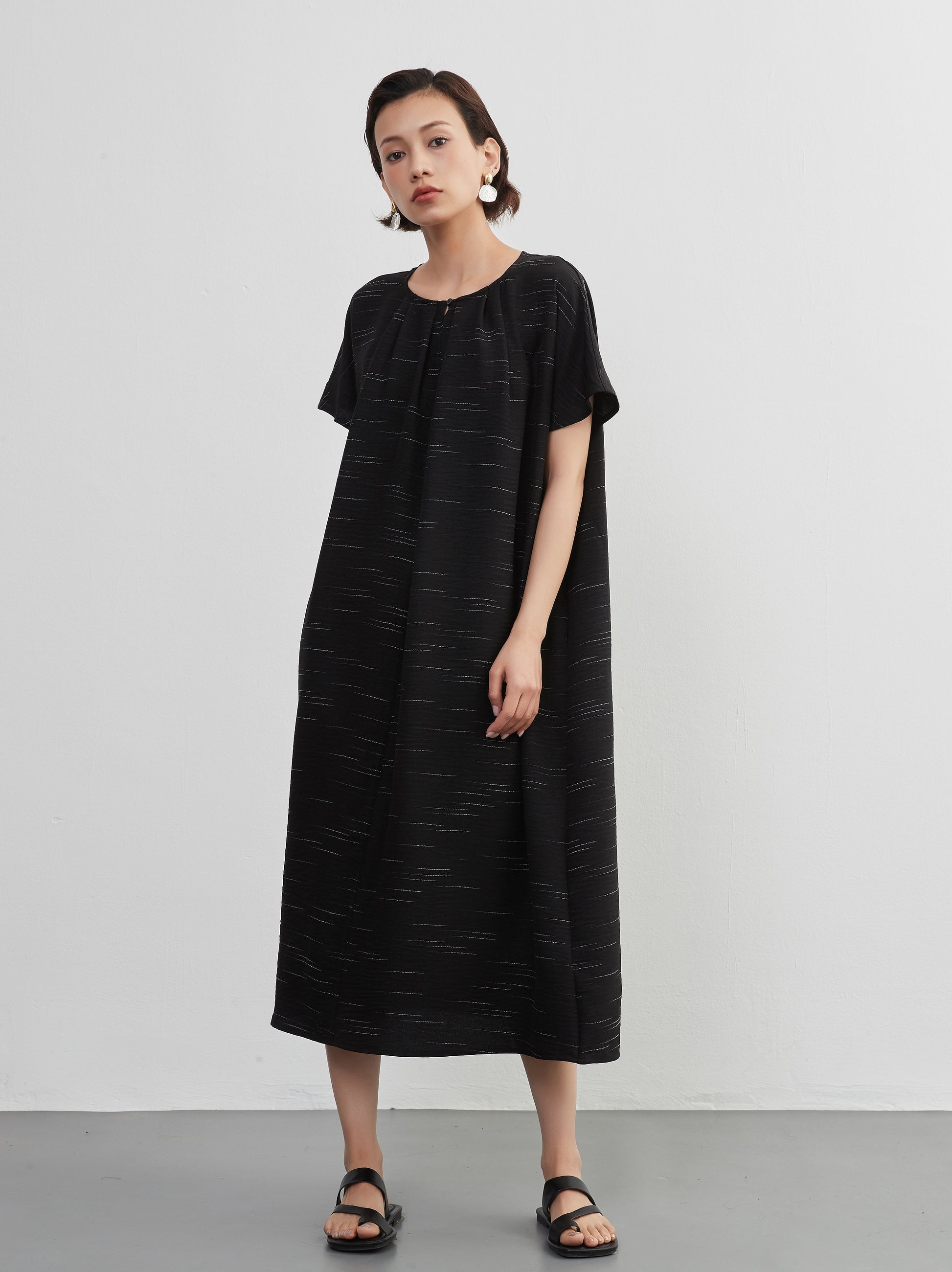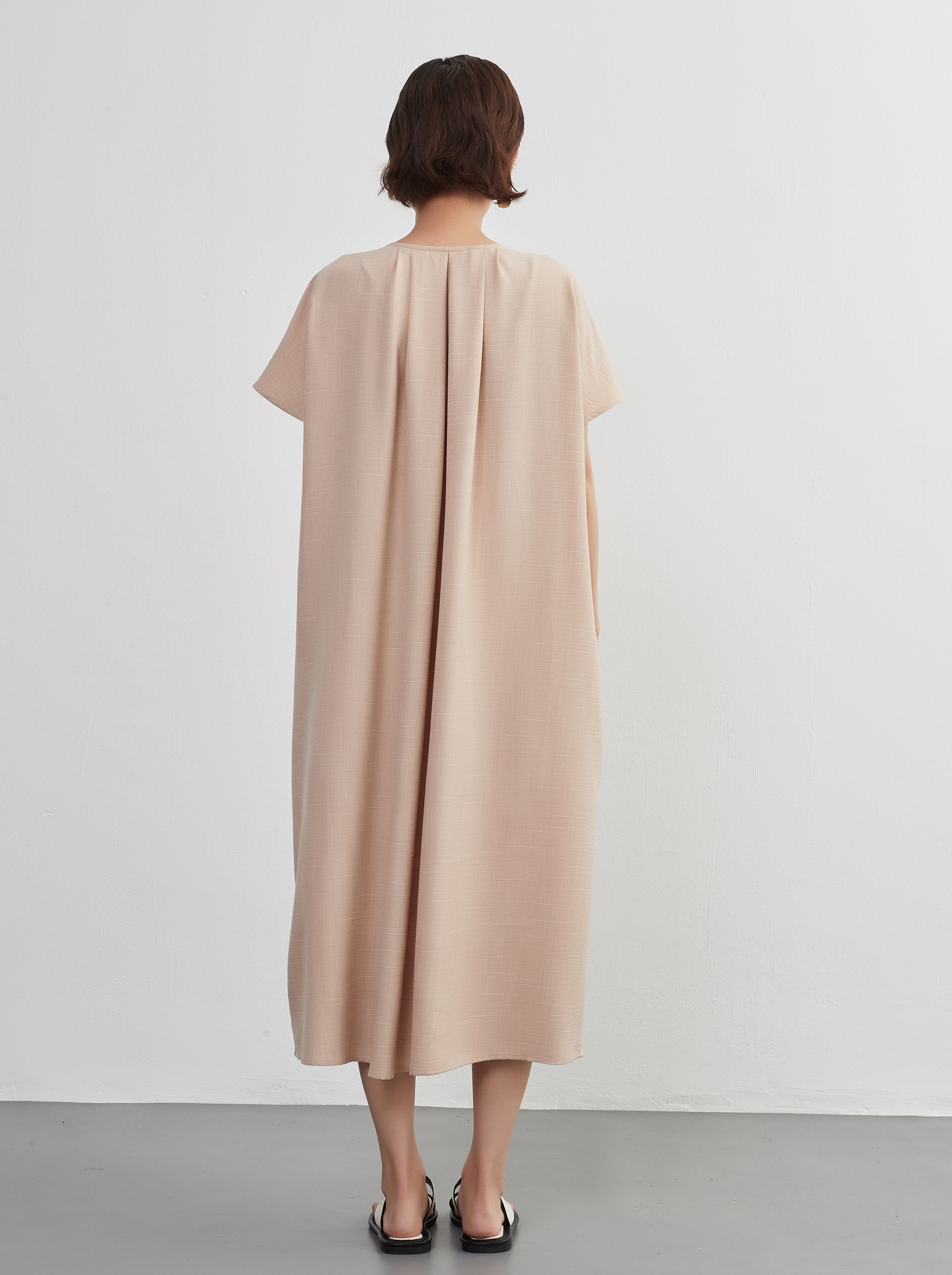 KNXO404 - Short sleeve tucked dress, loose silhouette, front opening, lined material dress