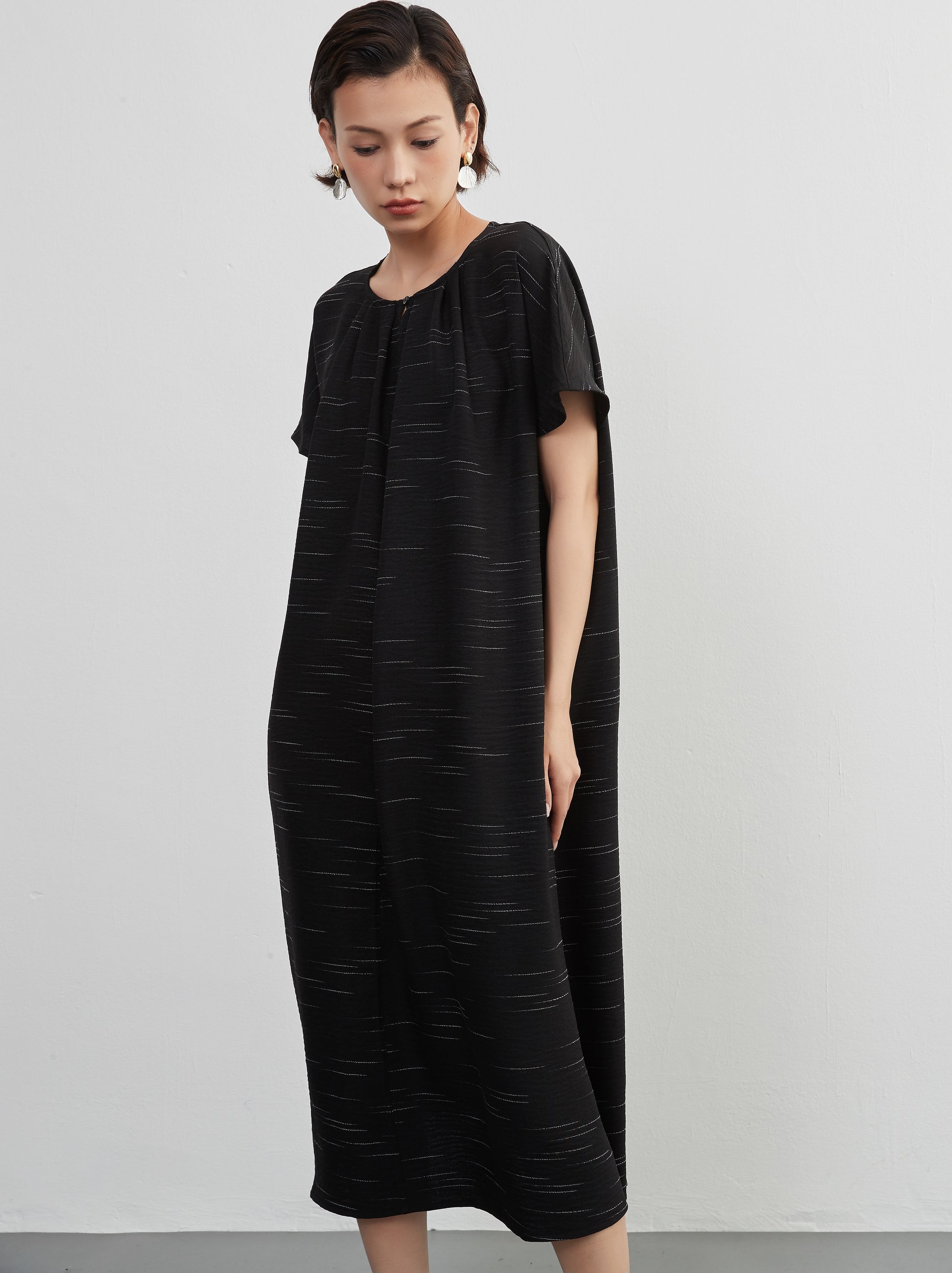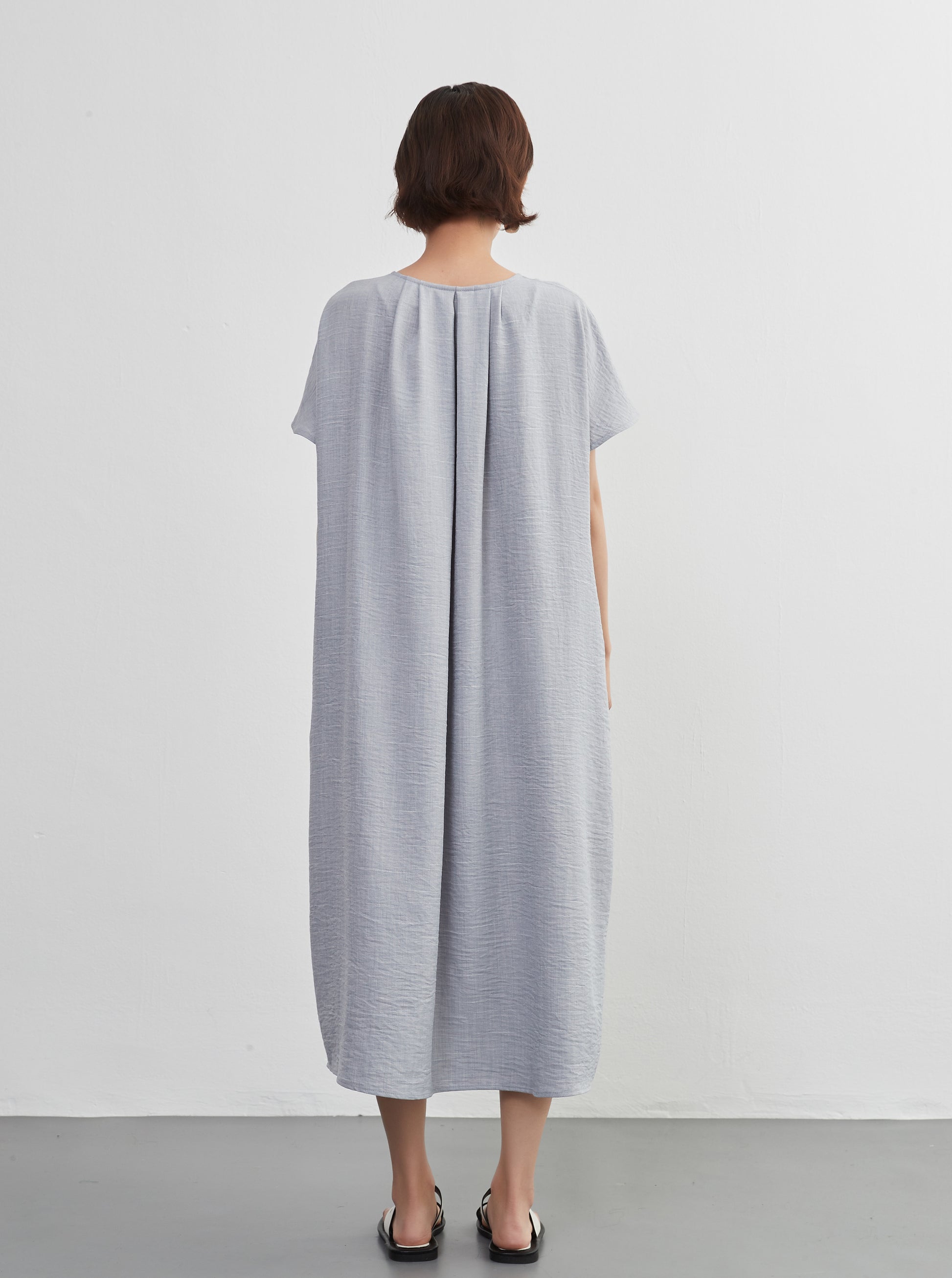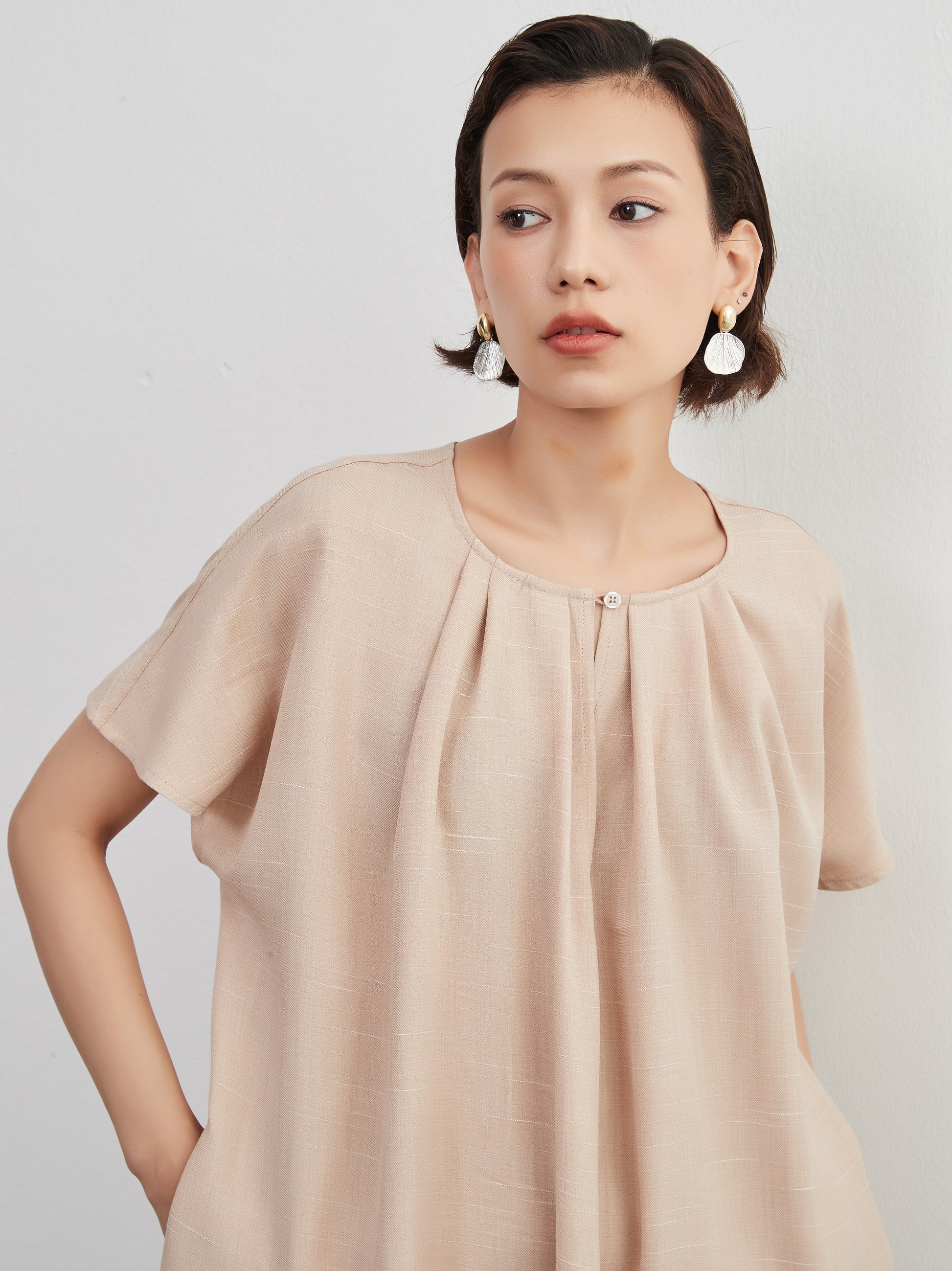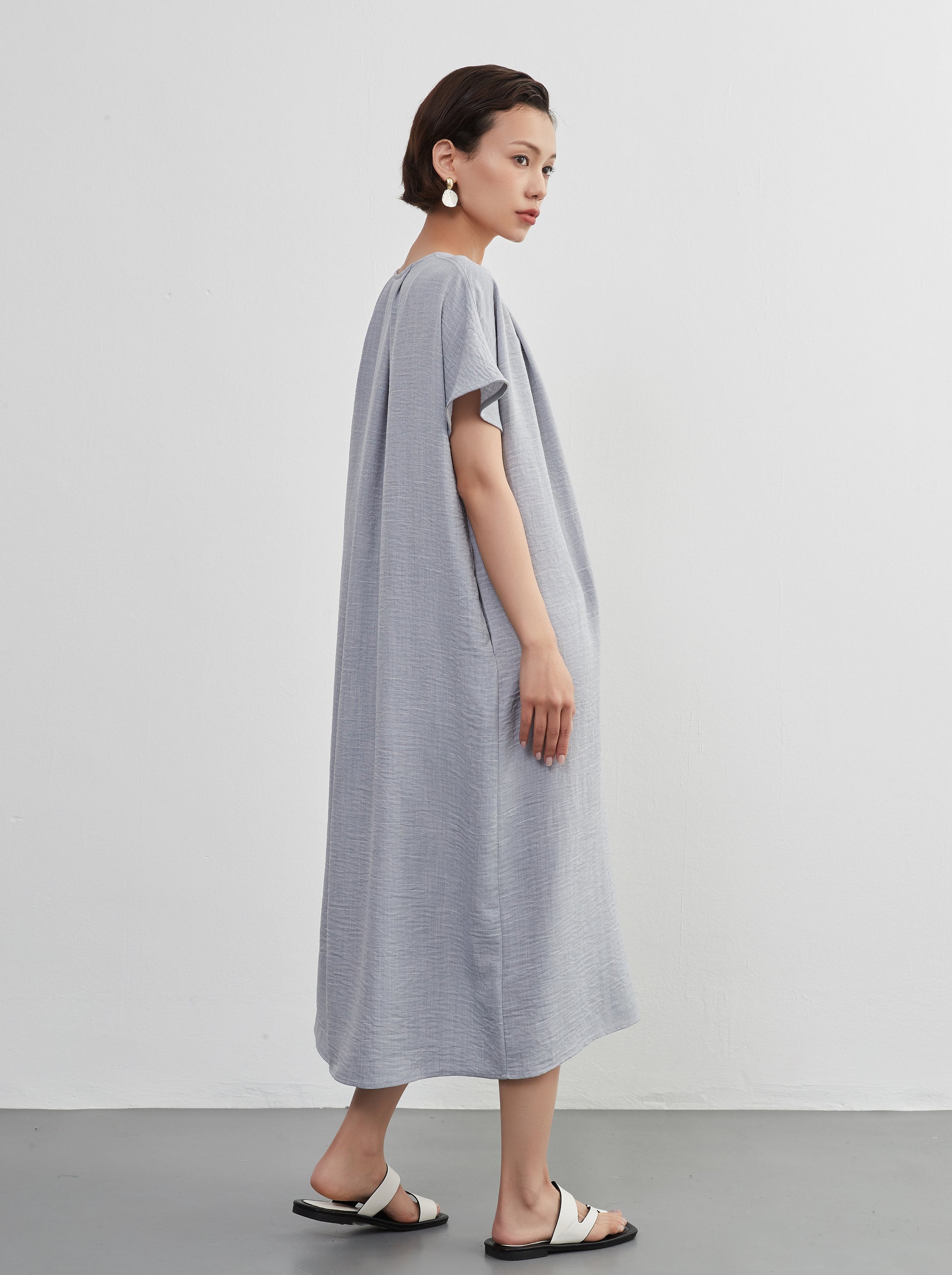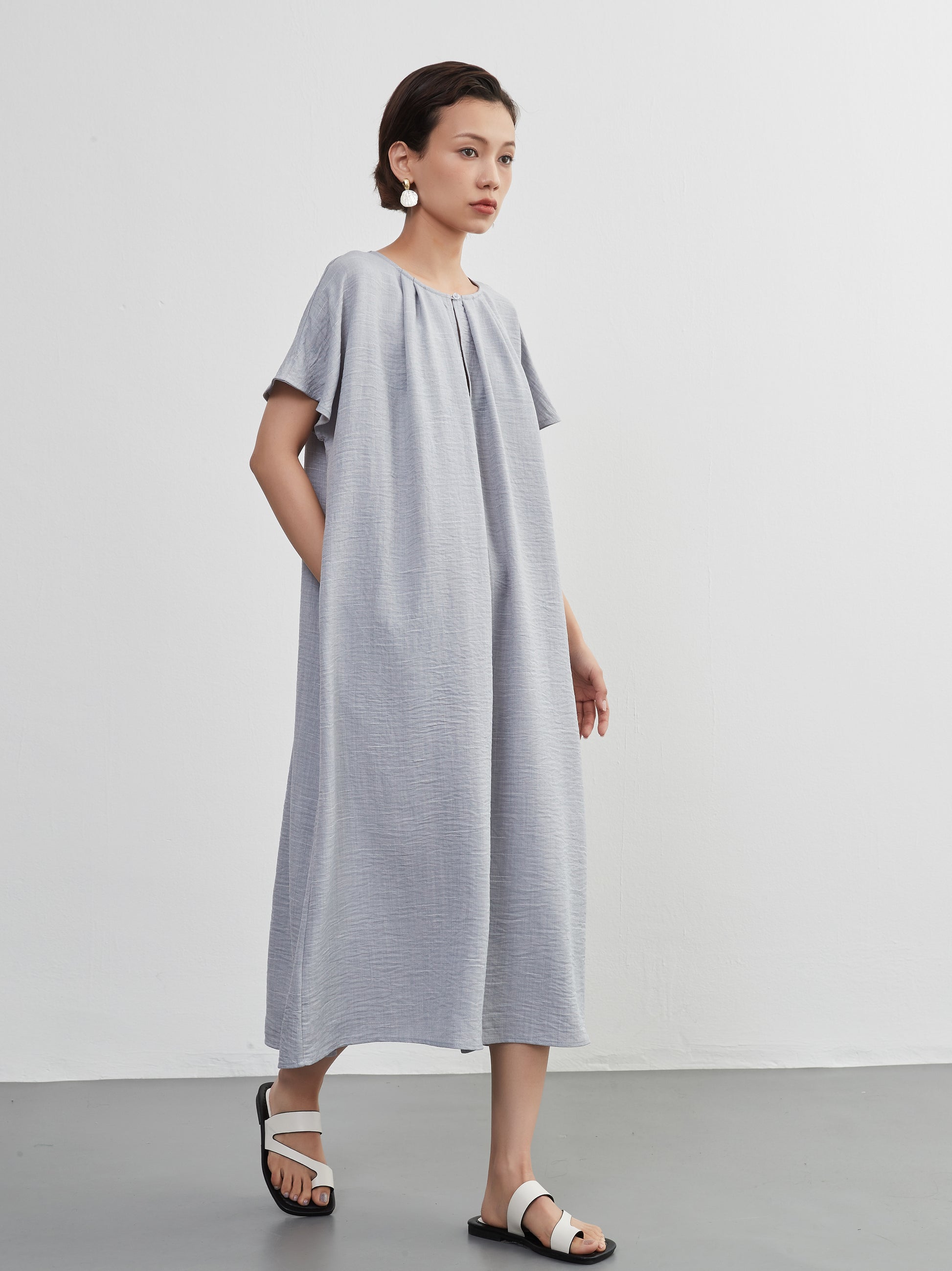 KNXO404 - Short sleeve tucked dress, loose silhouette, front opening, lined material dress