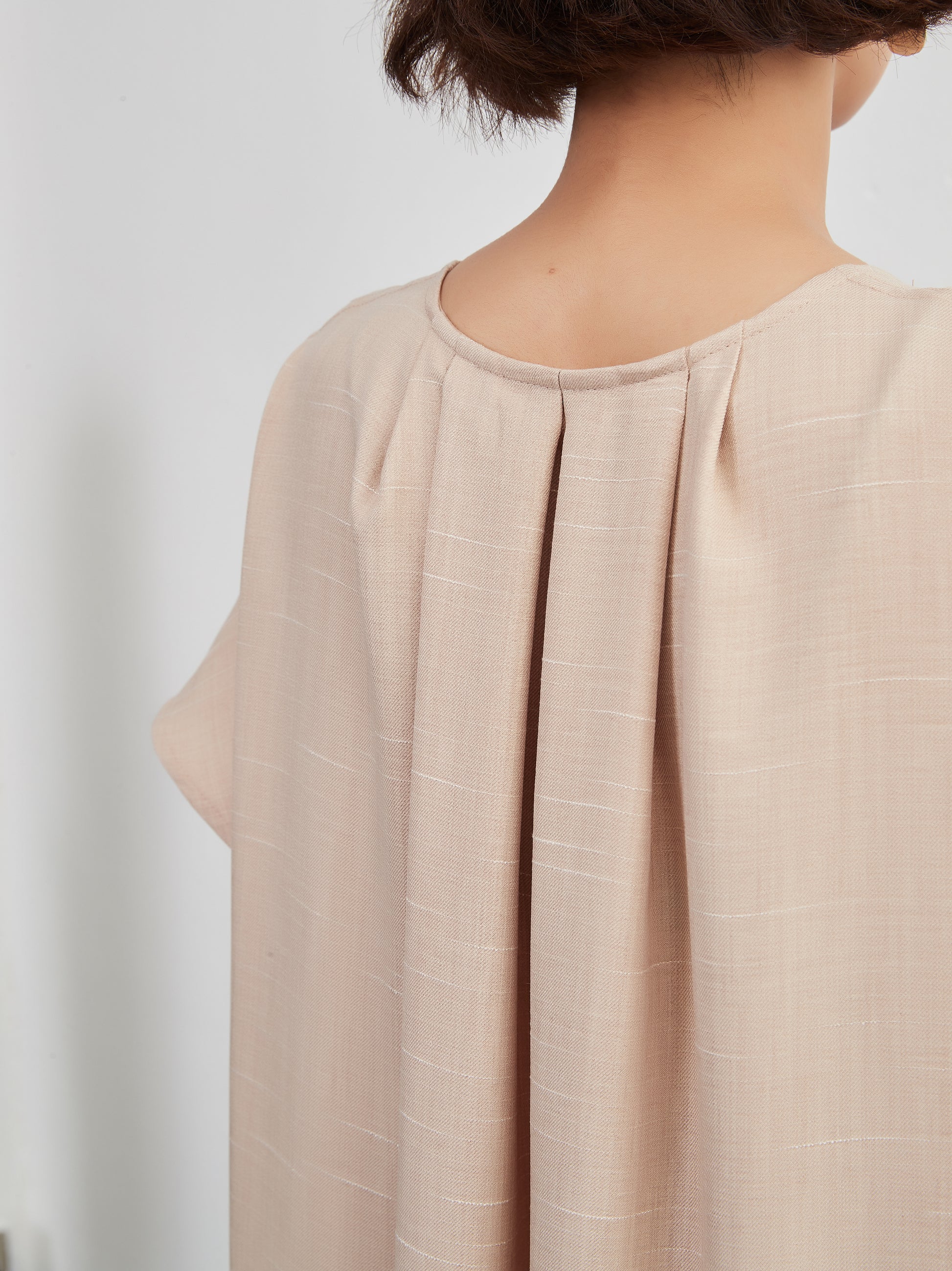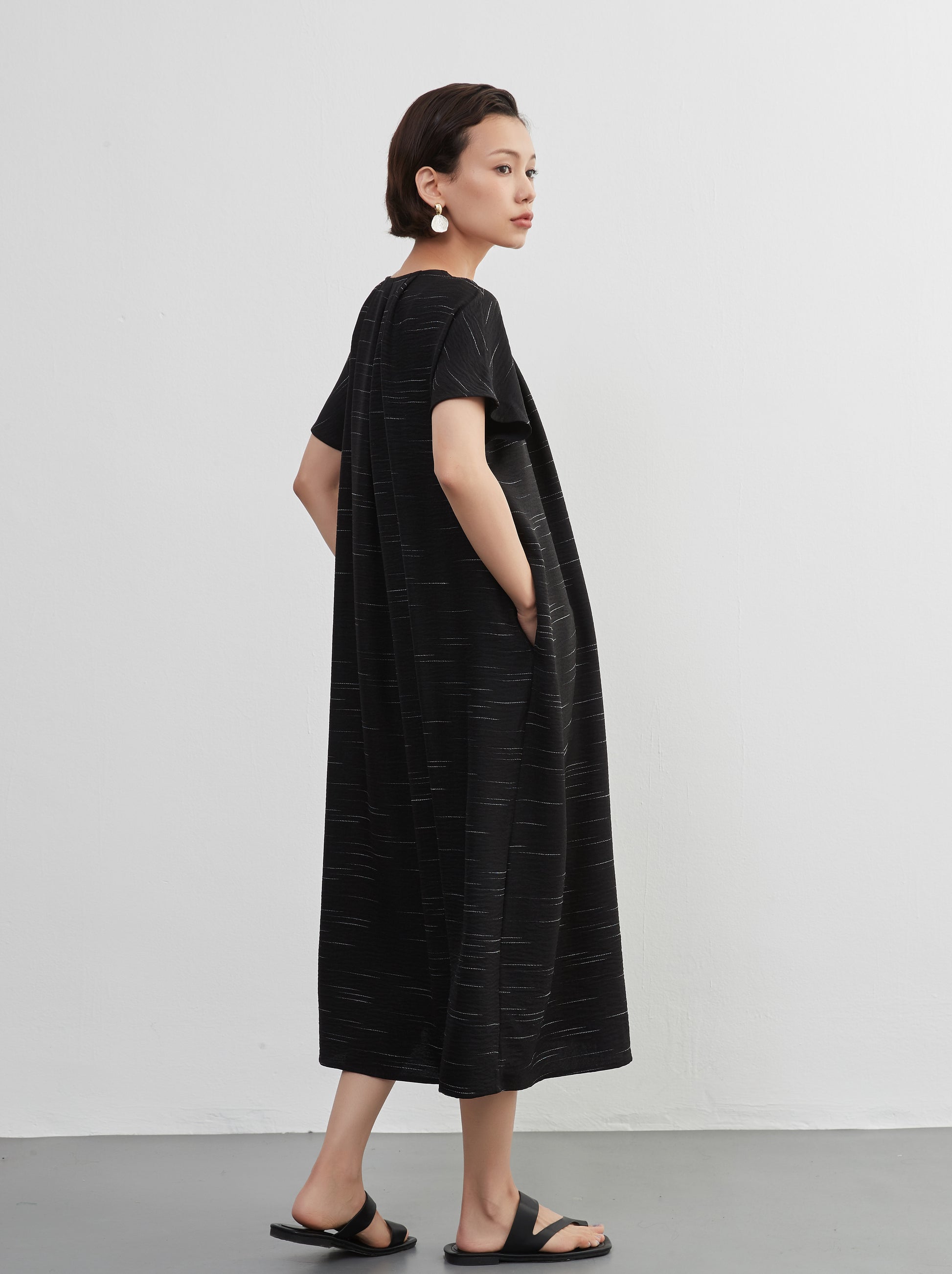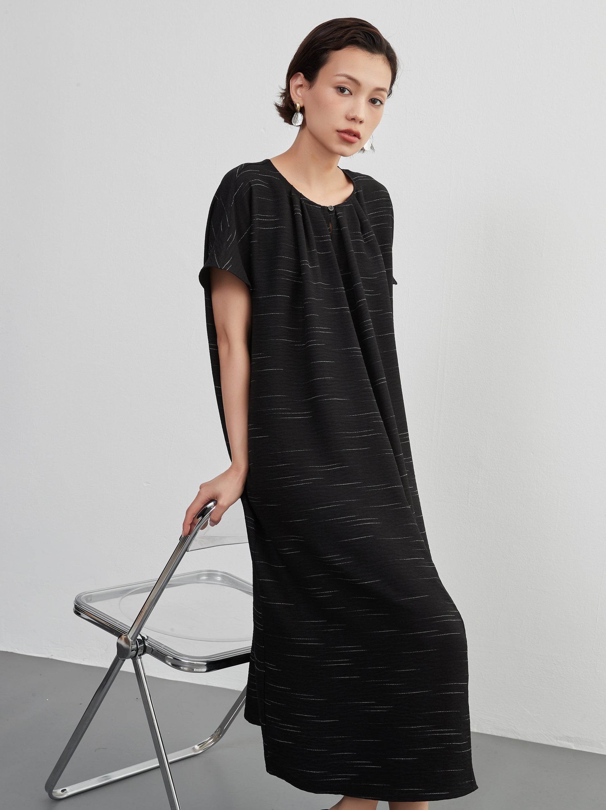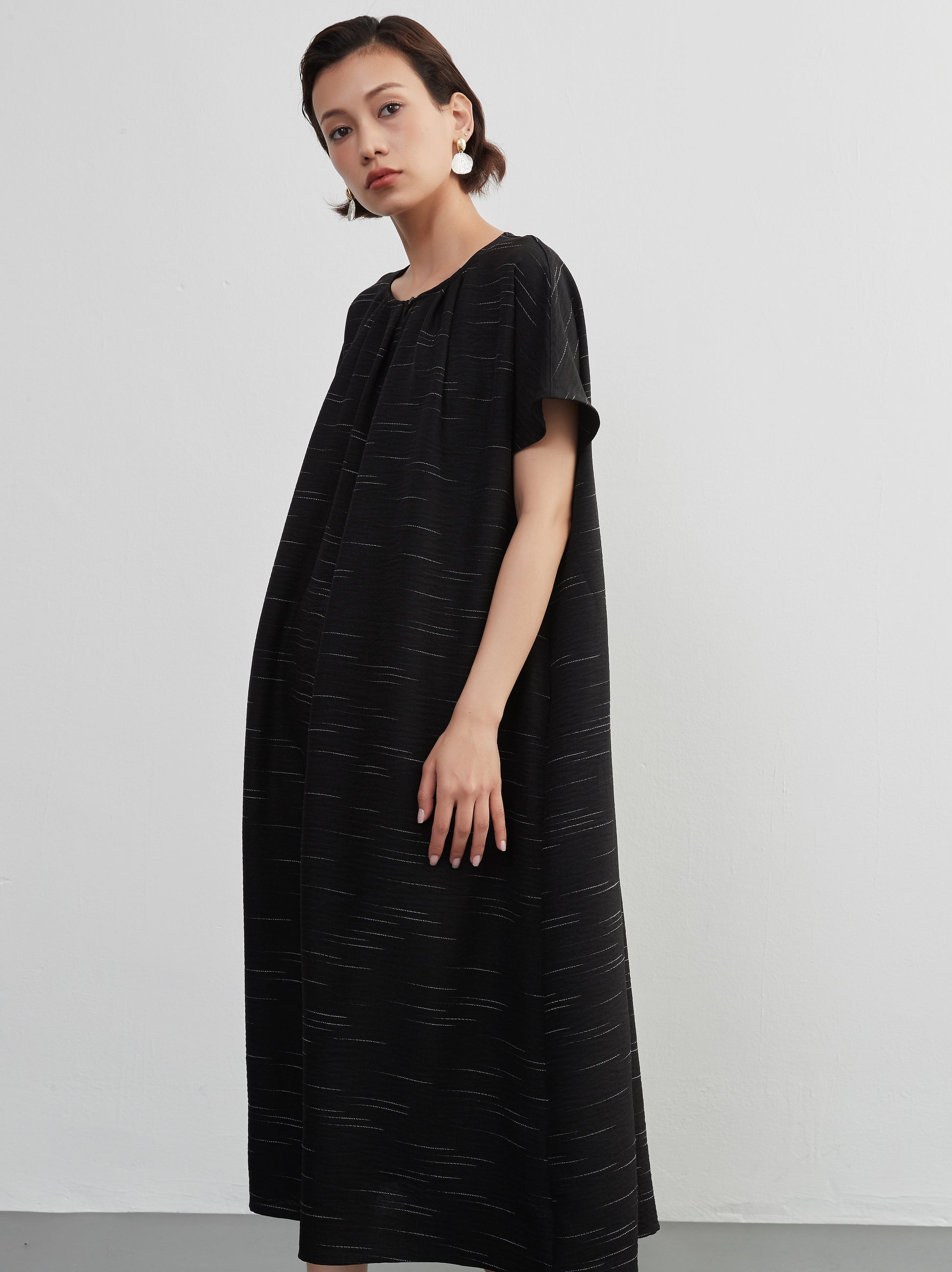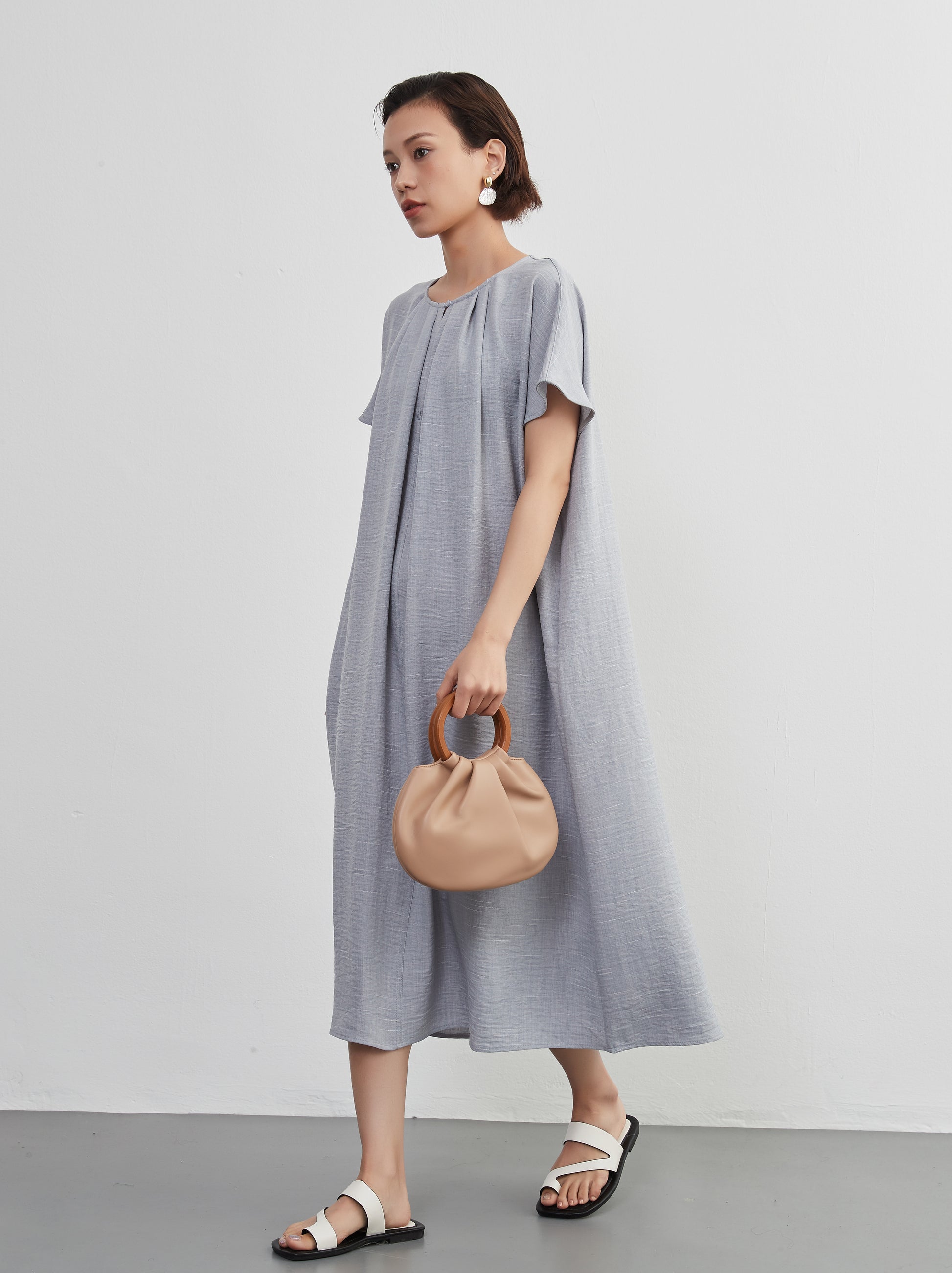 KNXO404 - Short sleeve tucked dress, loose silhouette, front opening, lined material dress