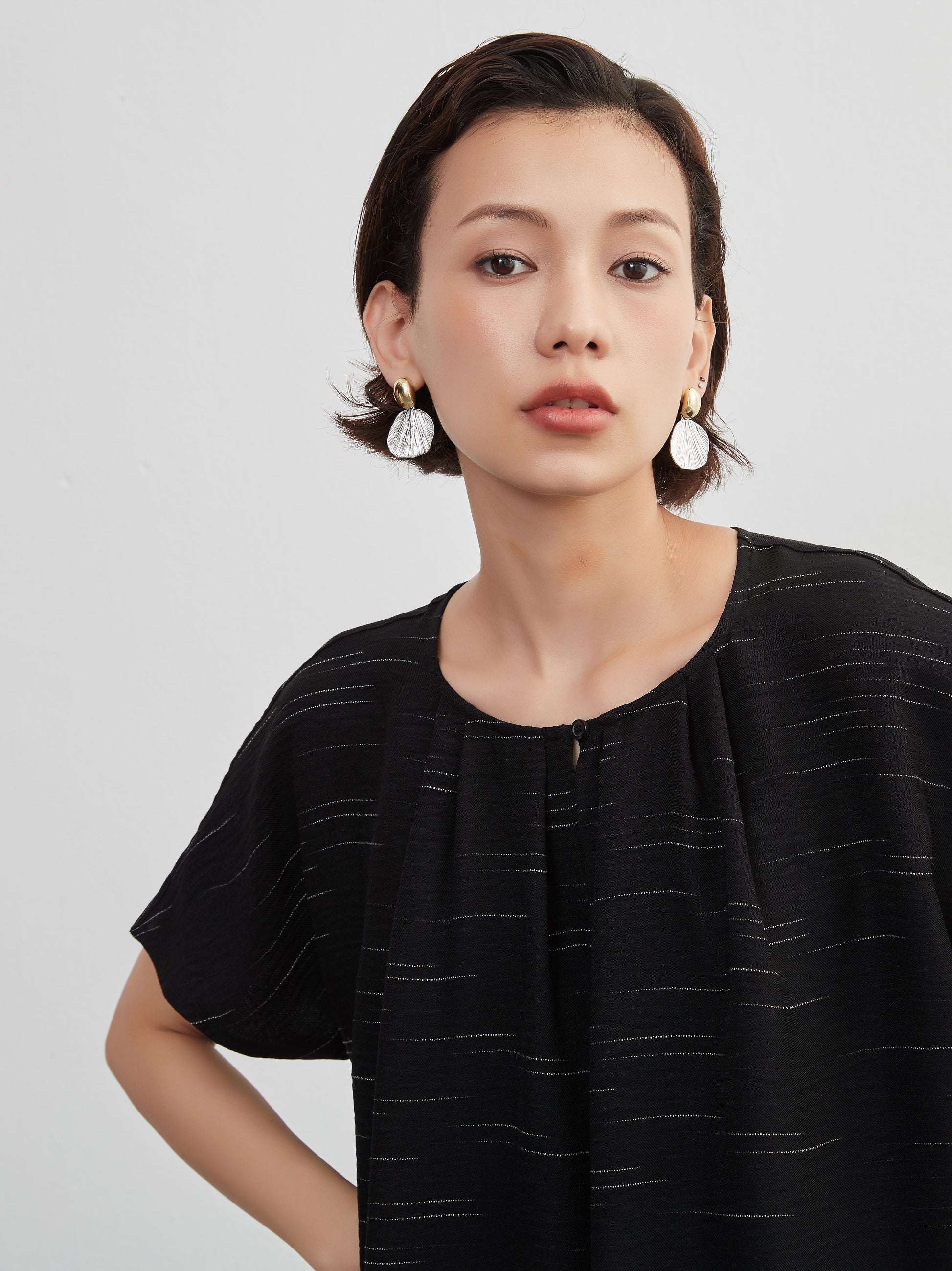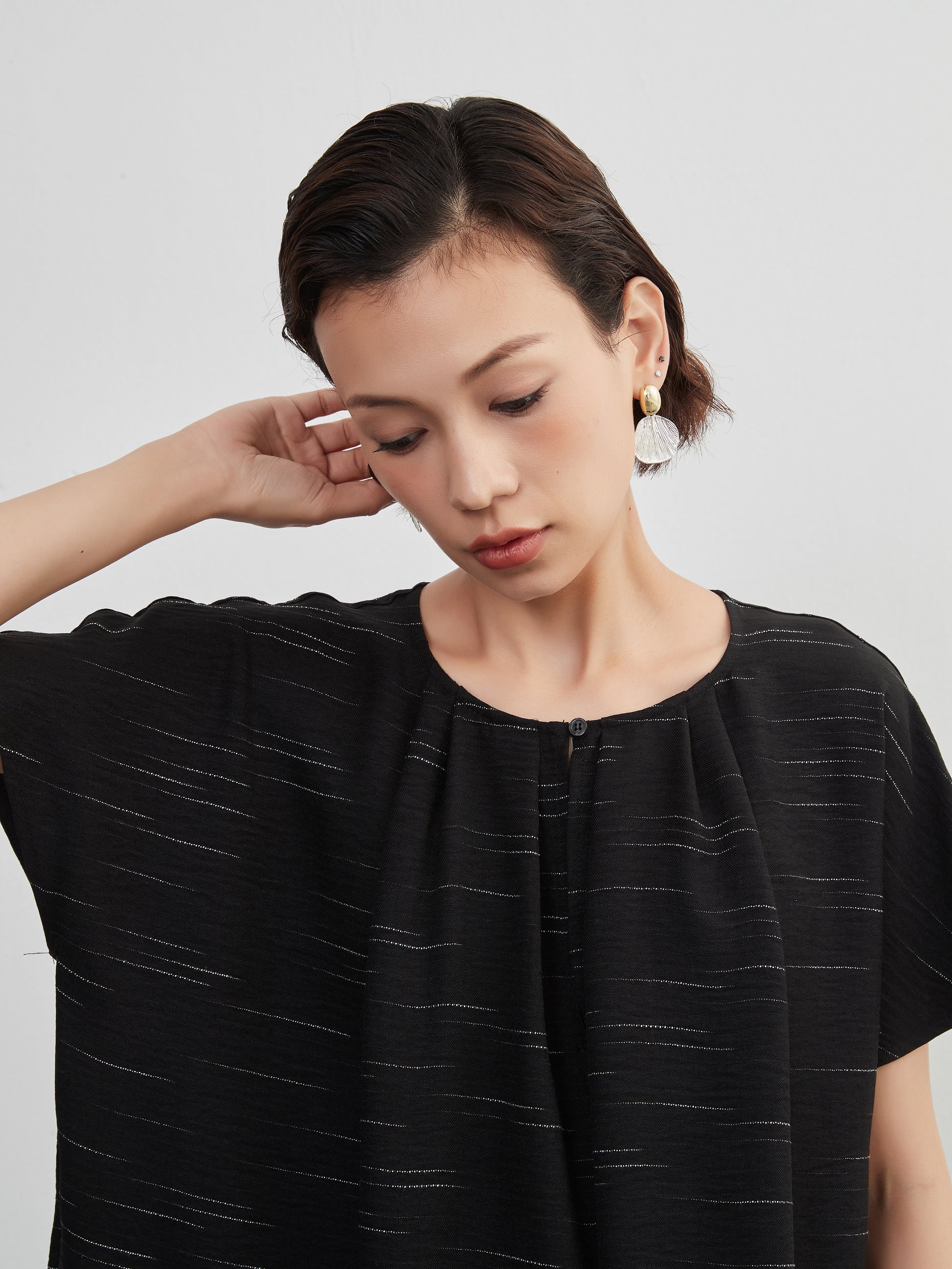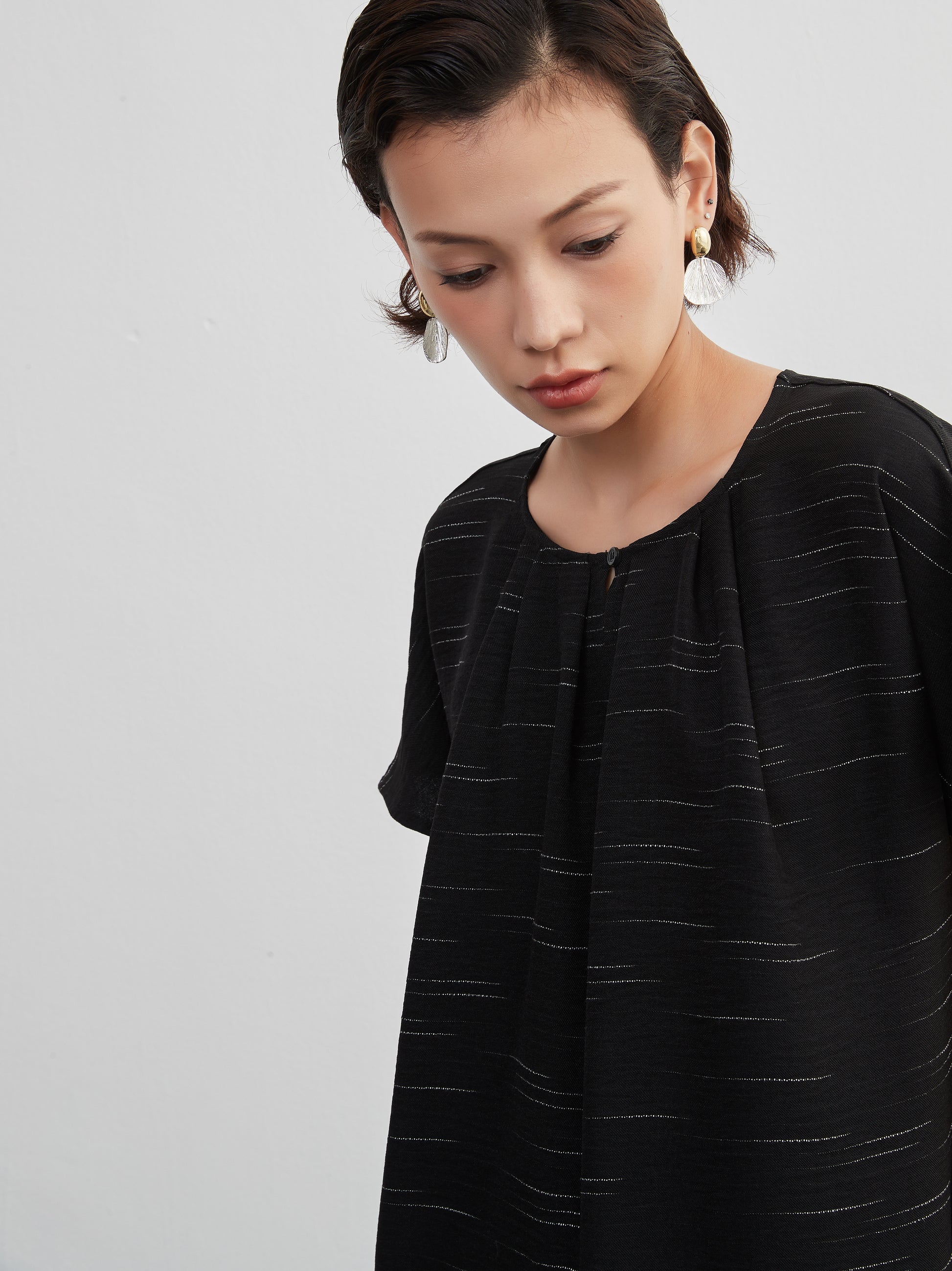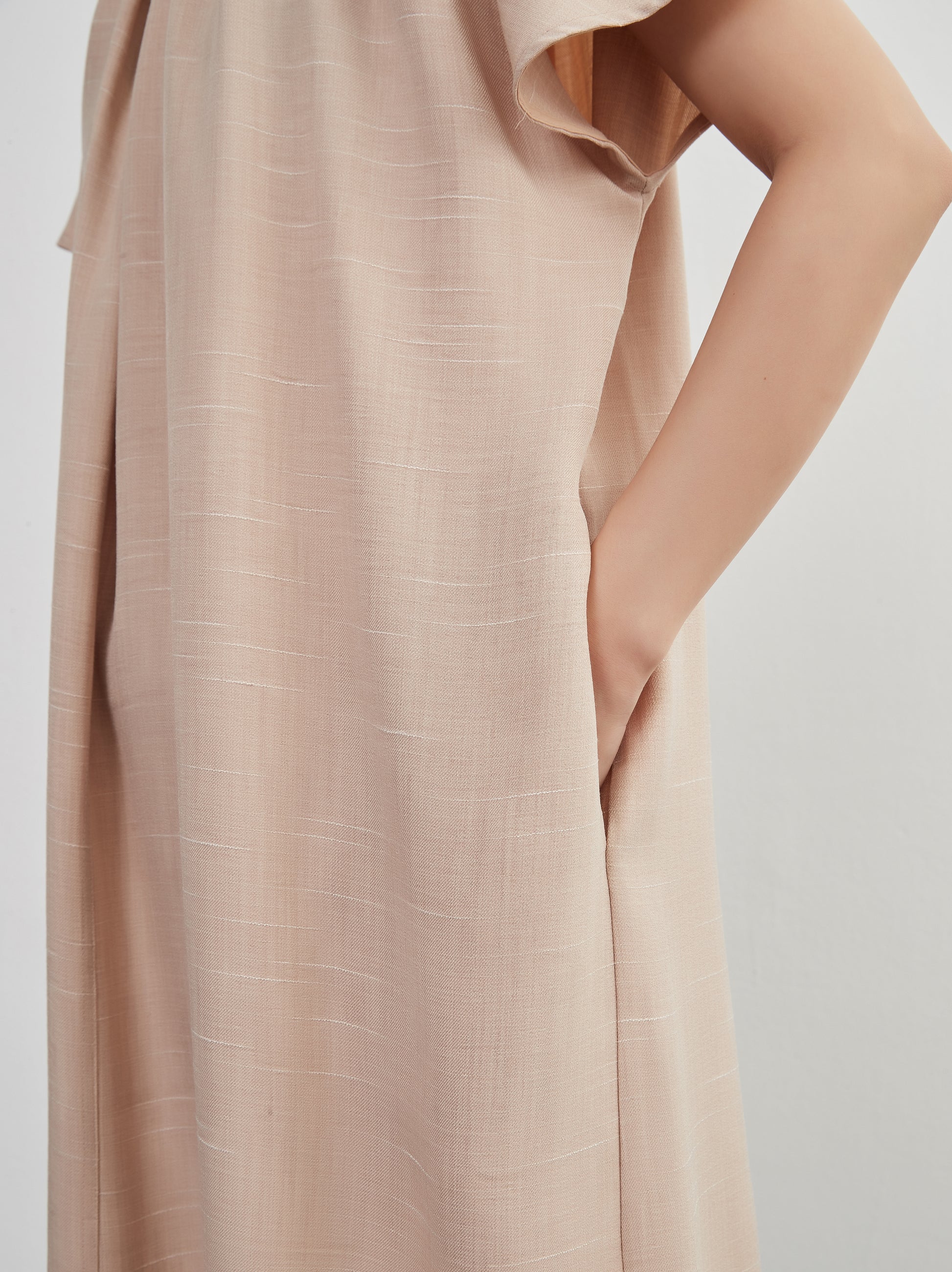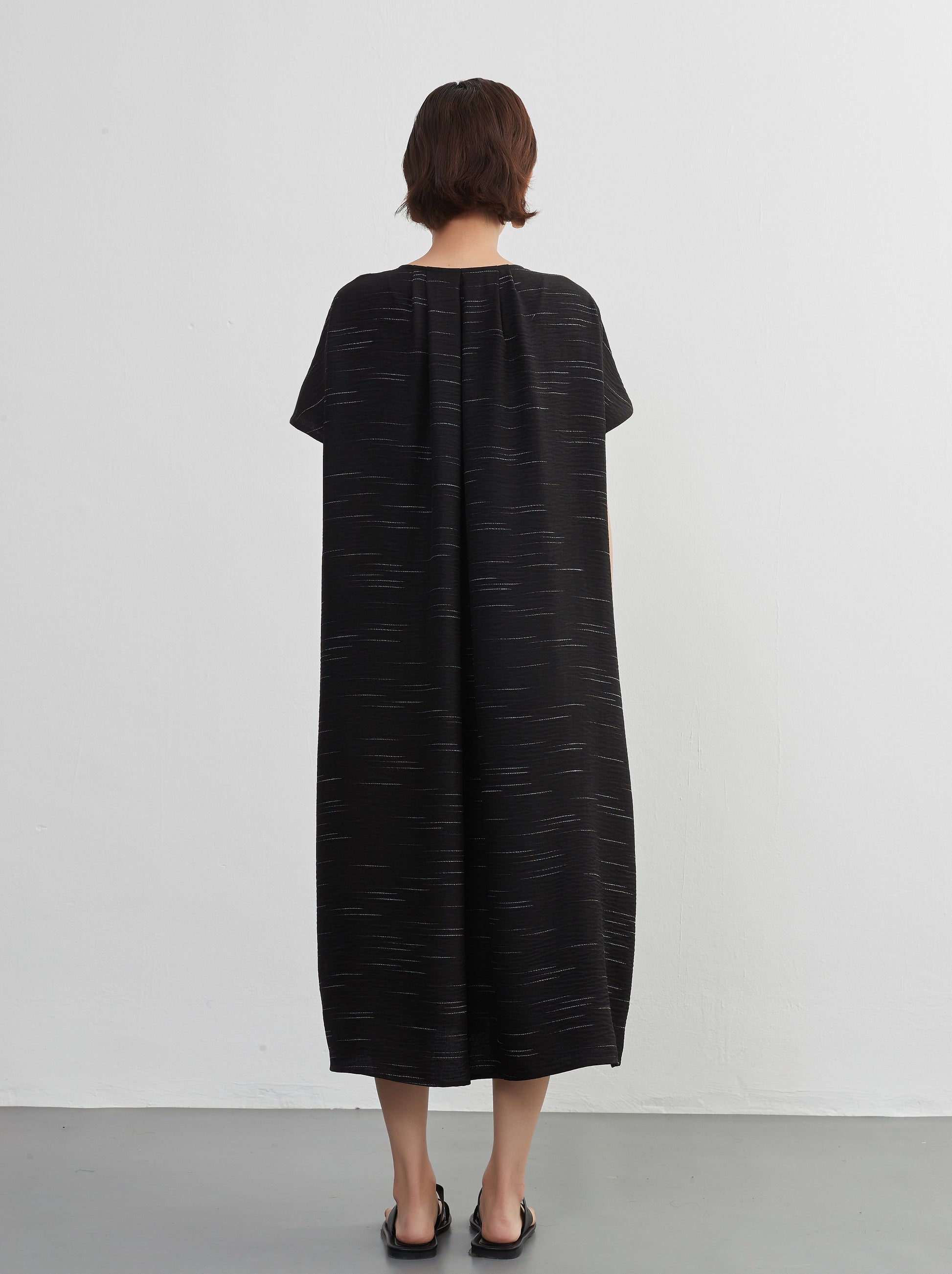 KNXO404 - Short sleeve tucked dress, loose silhouette, front opening, lined material dress